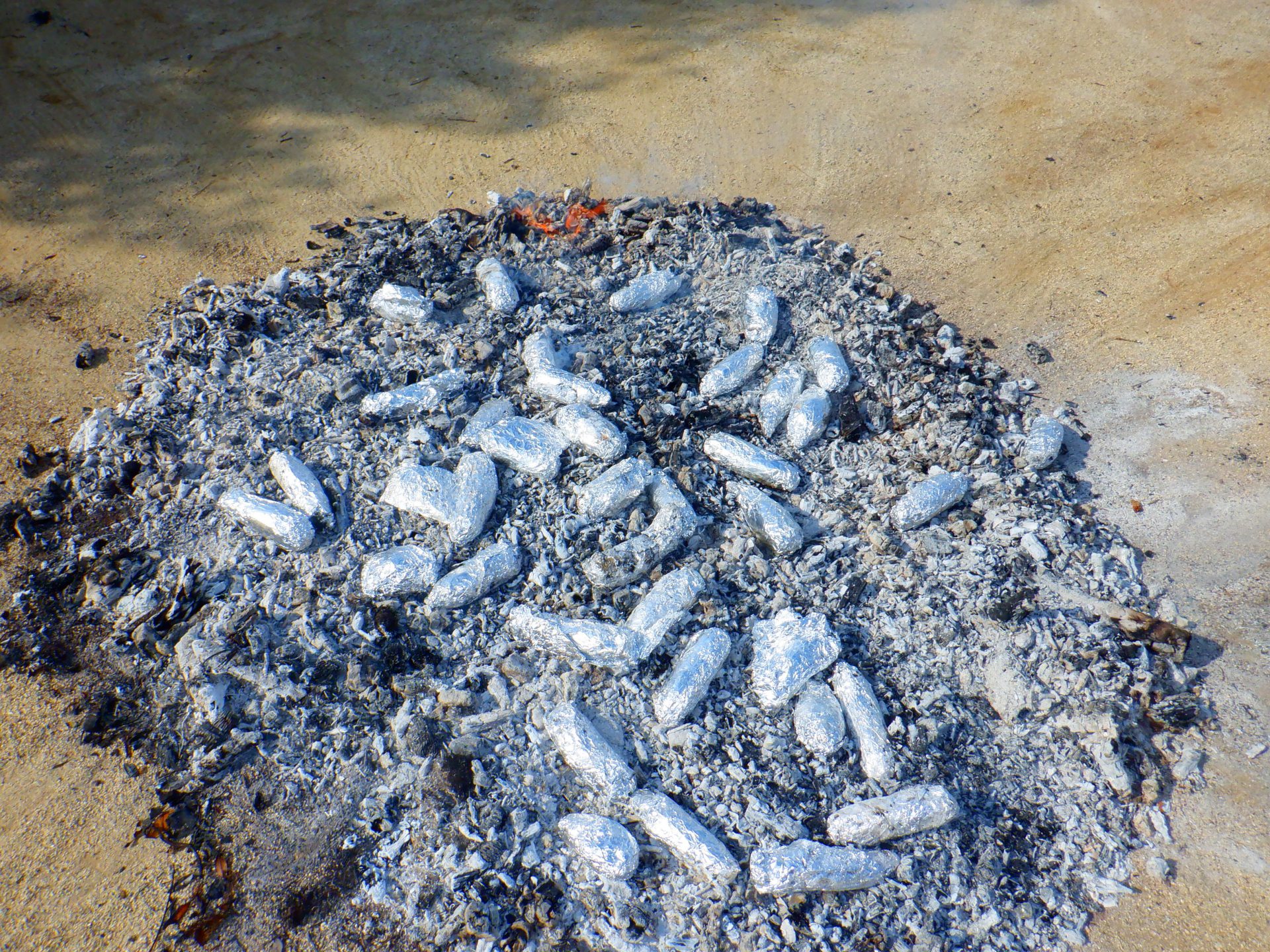 火が落ち着いて「おき」になると準備したサツマイモをおきの中は投げ入れました。