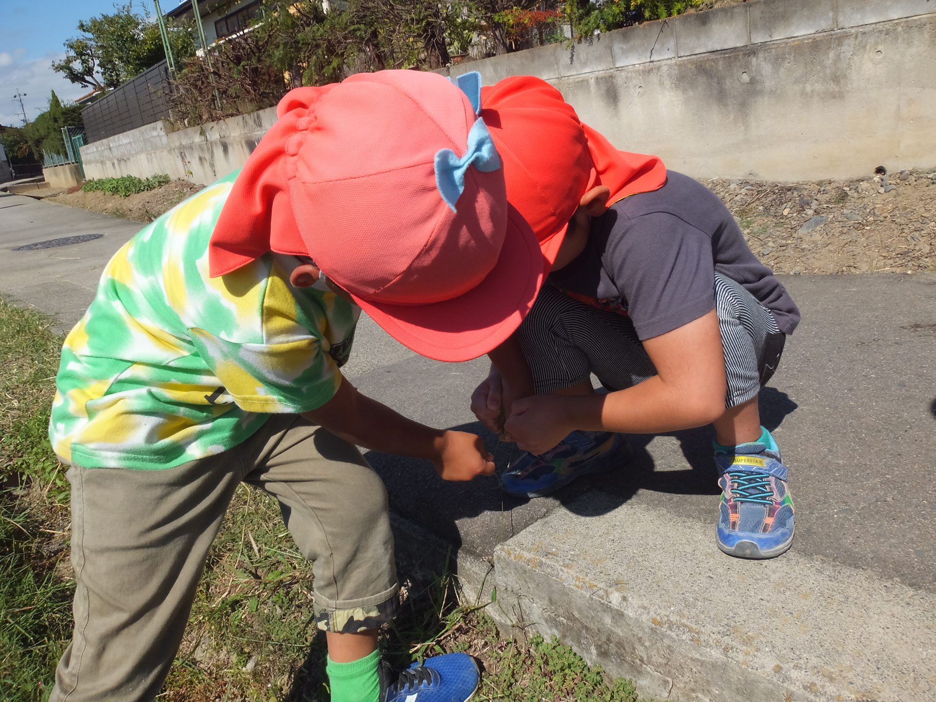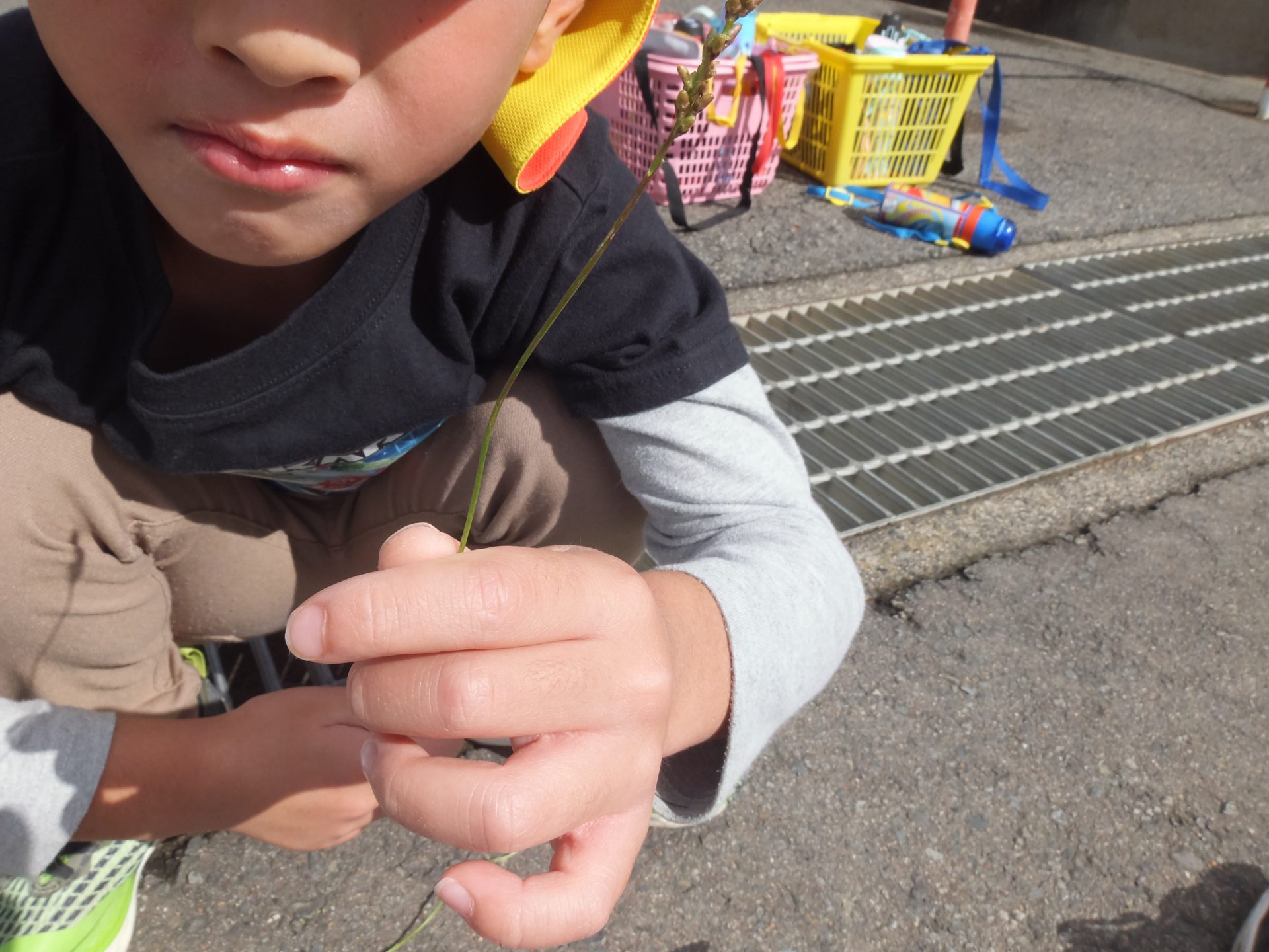さて、そんな友達や保育士の姿を見てA君もやってきました。オオバコではなく、他の草で勝負!