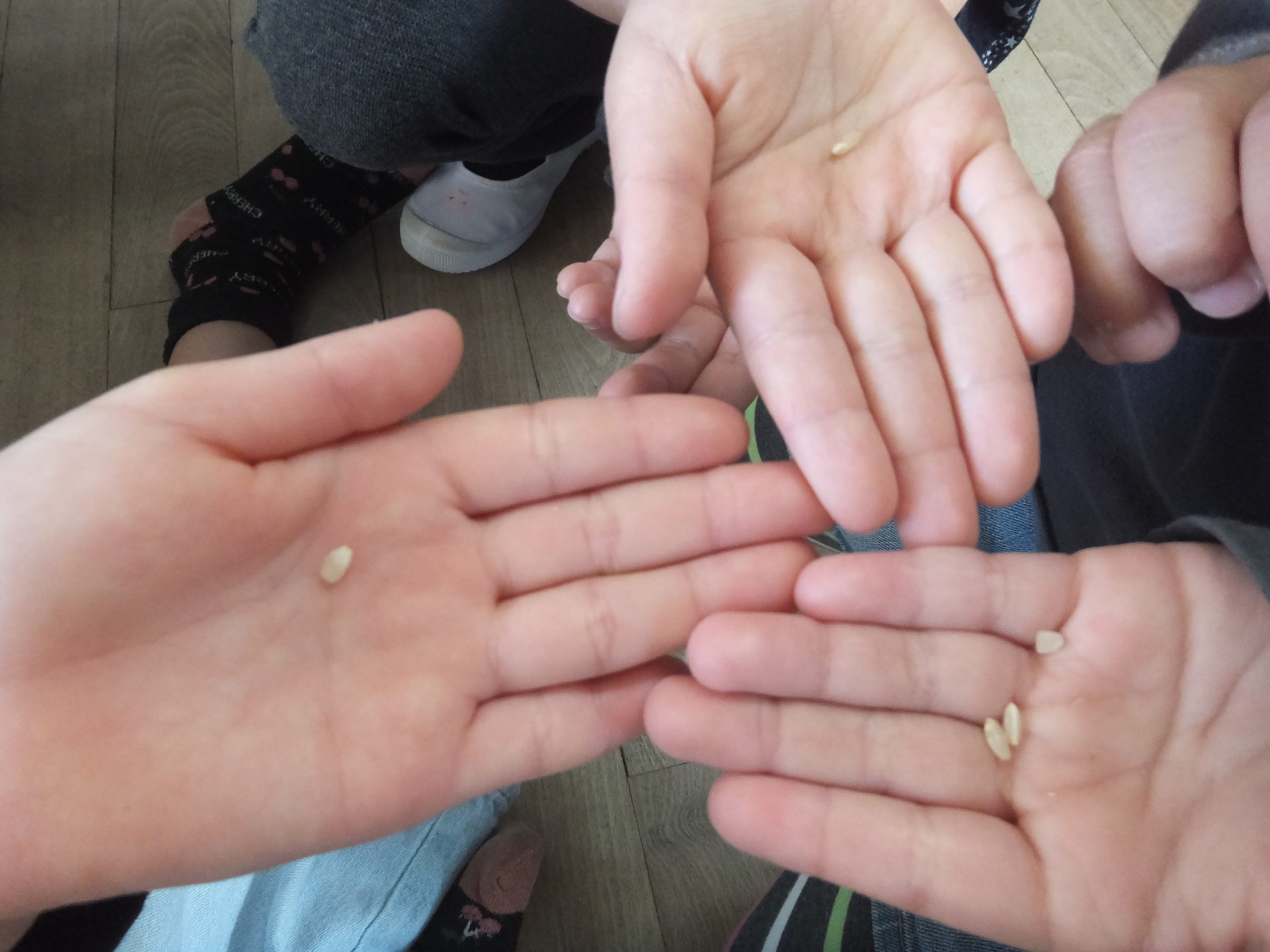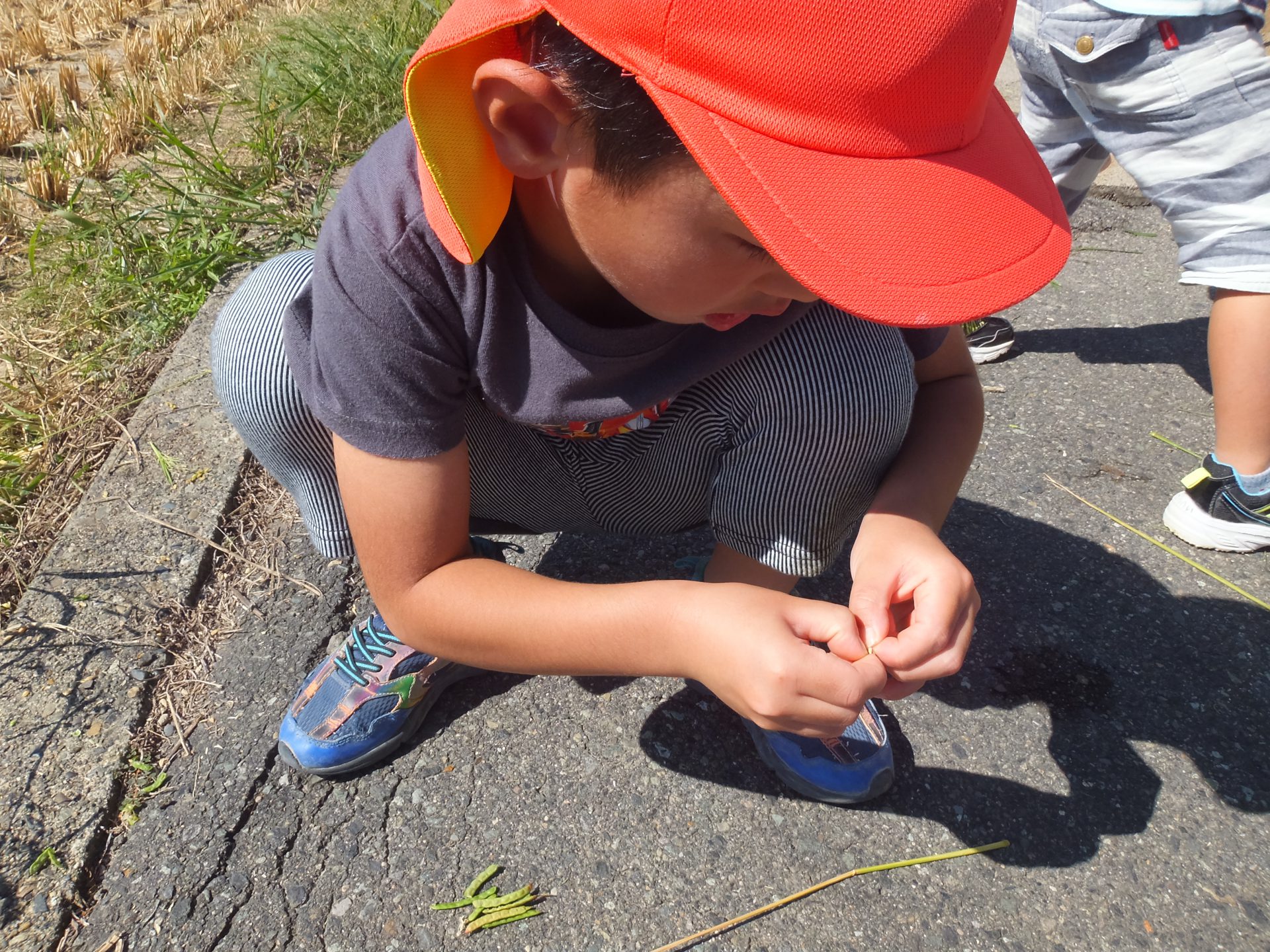 ・豆に興味のある子ども達が、稲穂の中身を出し、いつも食べているお米と色が違うことを発見した。そして、脱穀をしたことがある子どもの言葉から実際に脱穀を経験するとこができた。子どもたちは給食室に脱穀した米を持って行き「食べられる」ということを確認して喜んでいたので、実際にお米を炊いてみたいと思う。また、お米屋さんに行き、見学する機会があればいいなと思う。