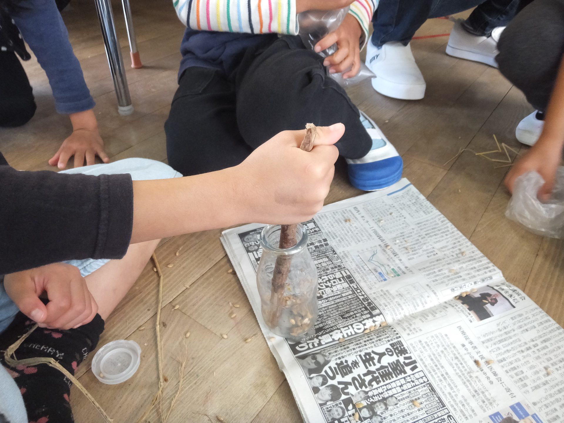 保育園に戻ると、E君に教えてもらいながら、瓶と棒を使って脱穀をやってみました。
