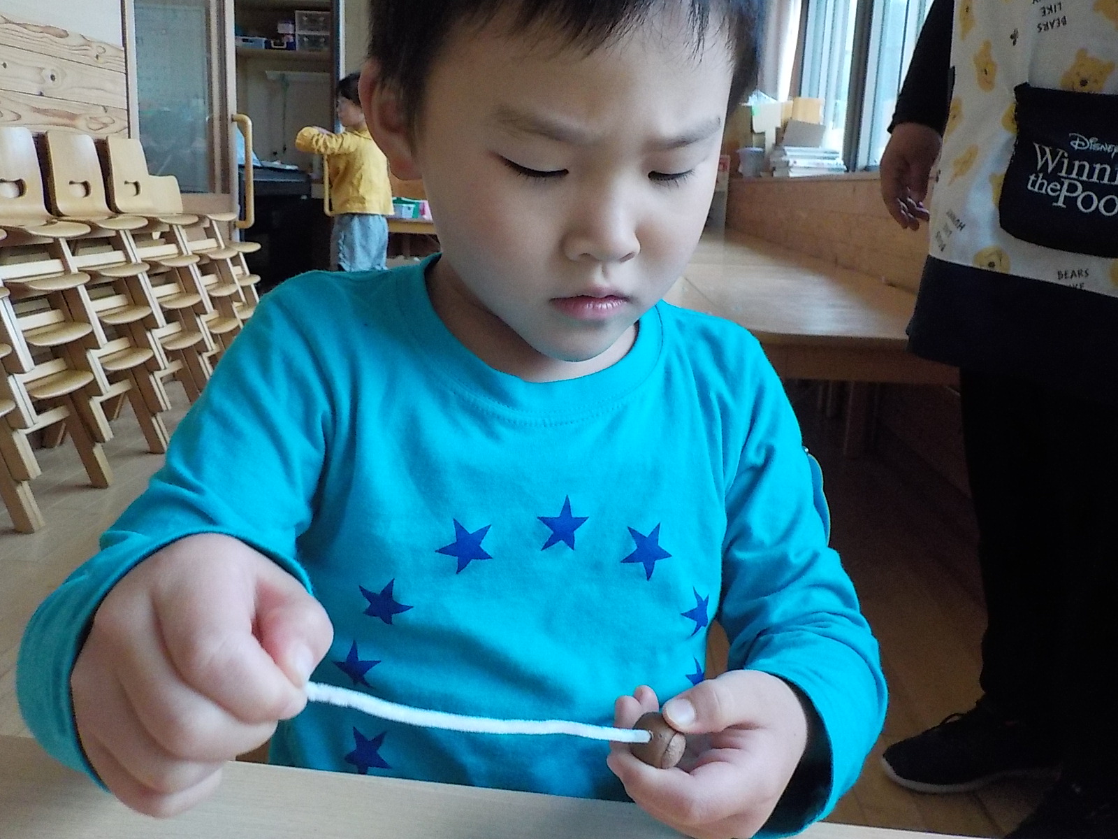 先生たちがどんぐりに穴を開けてくれモールを通します。
