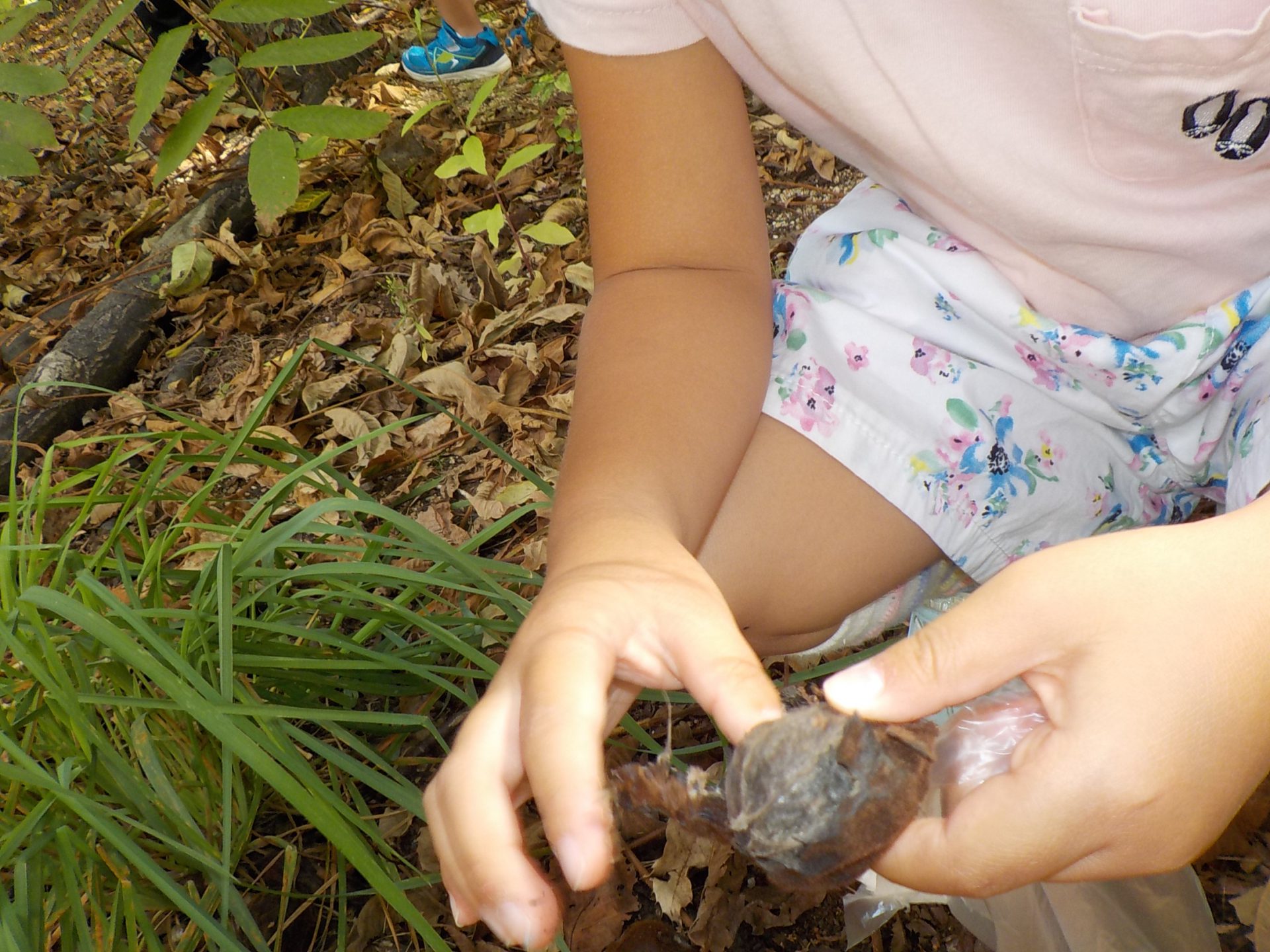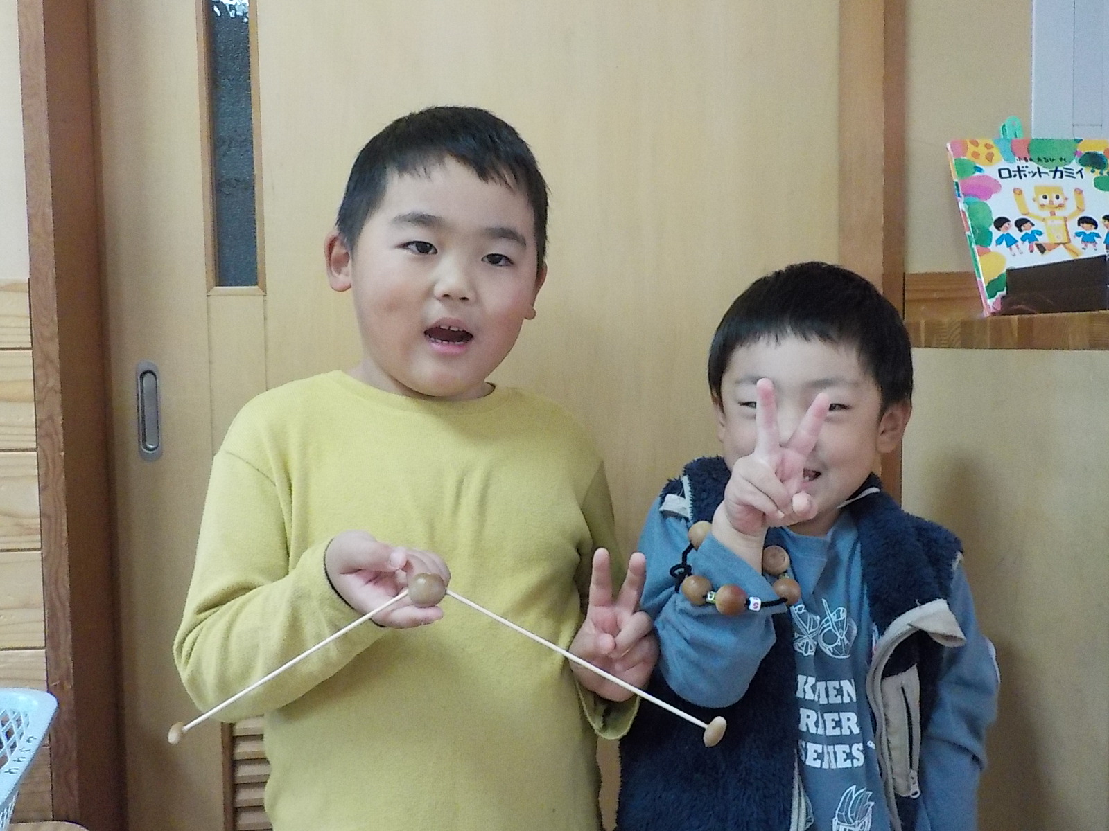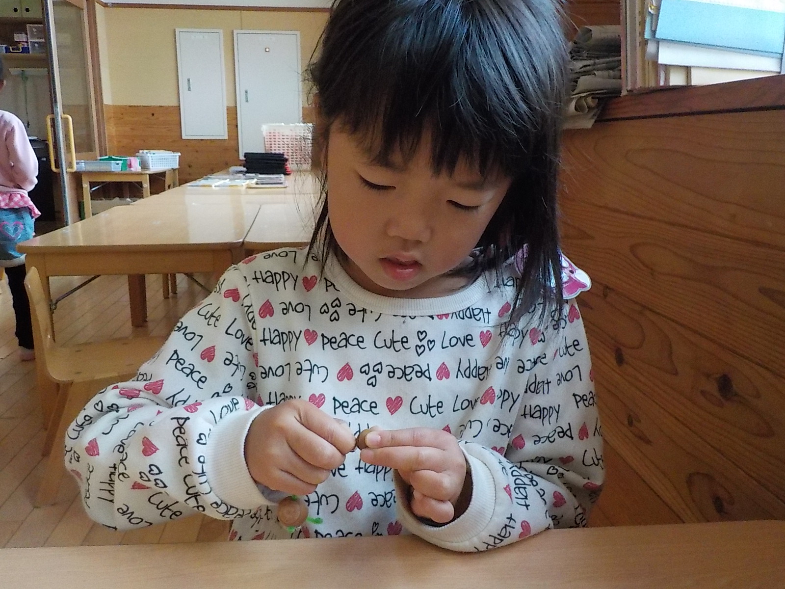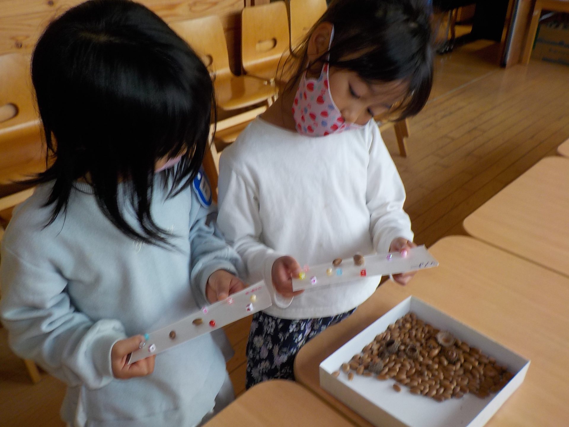 自分たちが拾ってきたことで、より自然物に関心を持ち、遊んでいく中で、「こんなこともできるんだ」「こんなものもつくれるんだ」と発見をし、よく考えた素敵な作品がたくさん出来上がっています。さらなる探究心を持って、工夫したりしながら作ったり遊んでいって欲しいと思います。