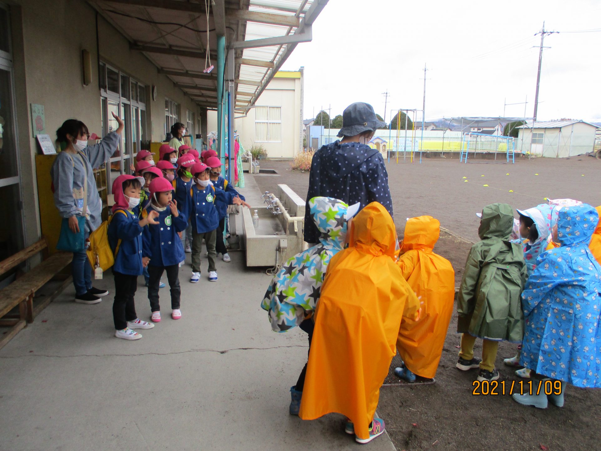 おにぎりと水筒をかばんに入れて出かける予定が、外は雨降り・・・