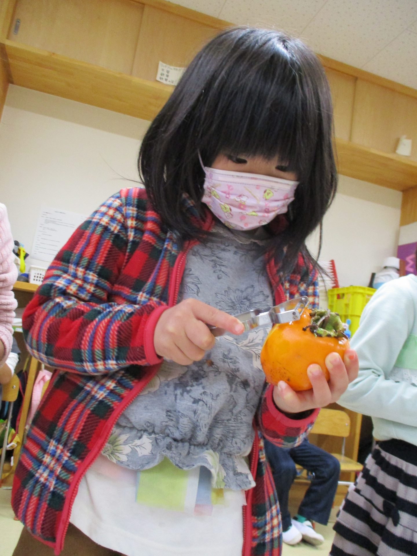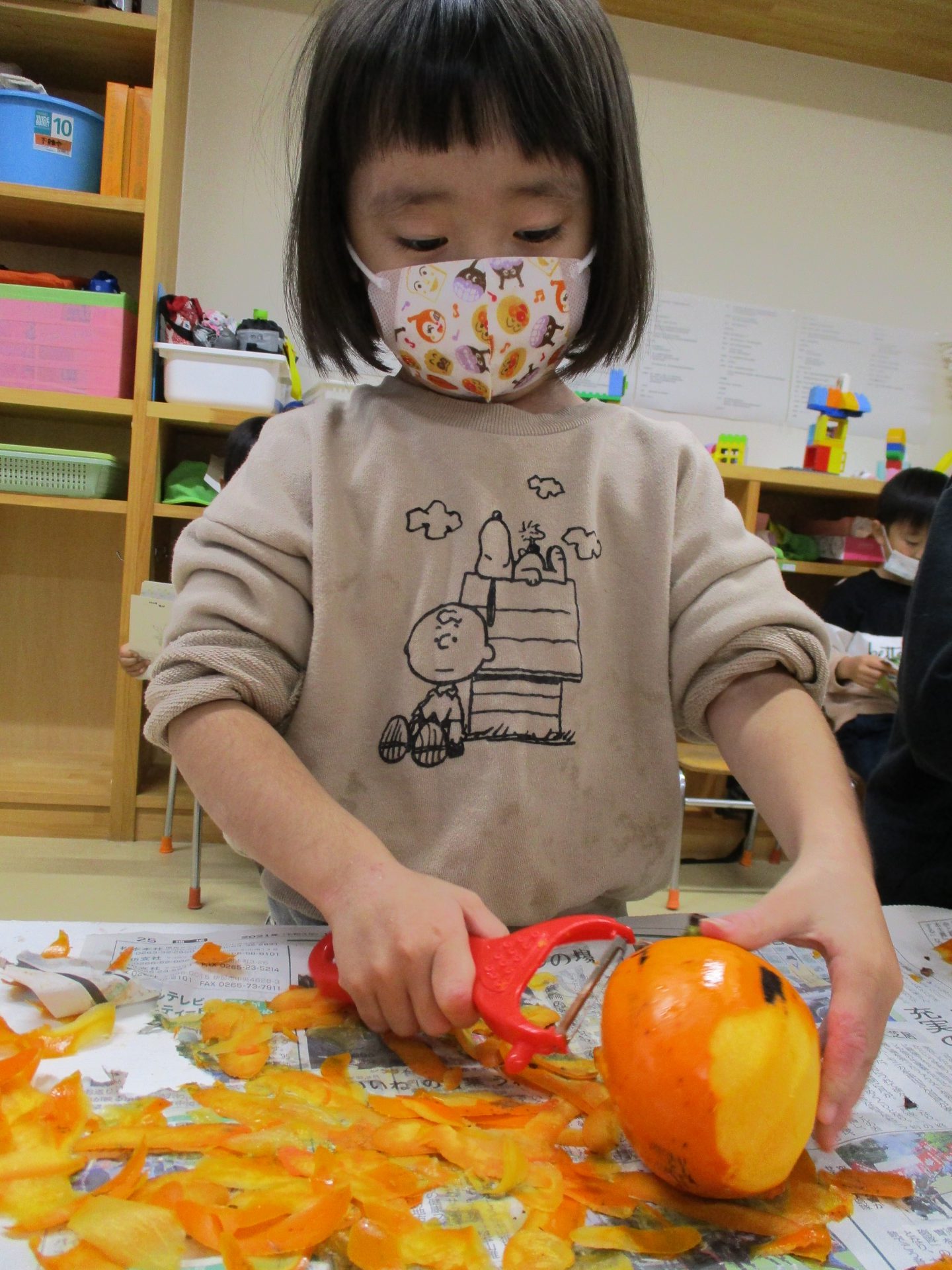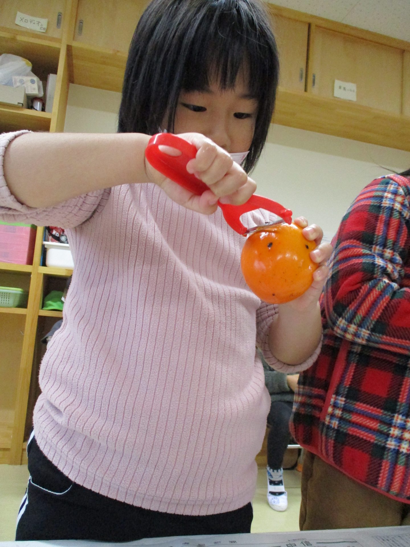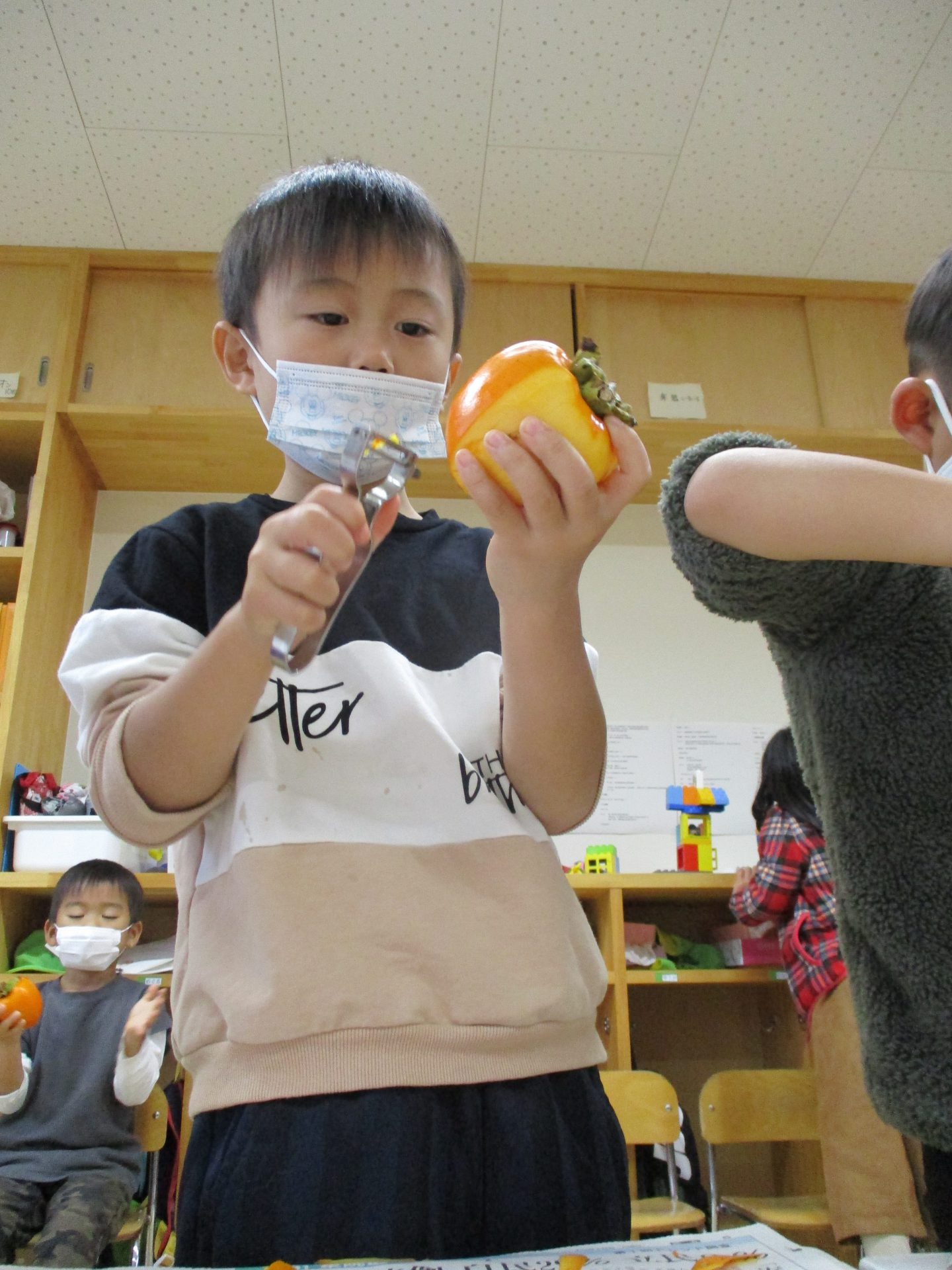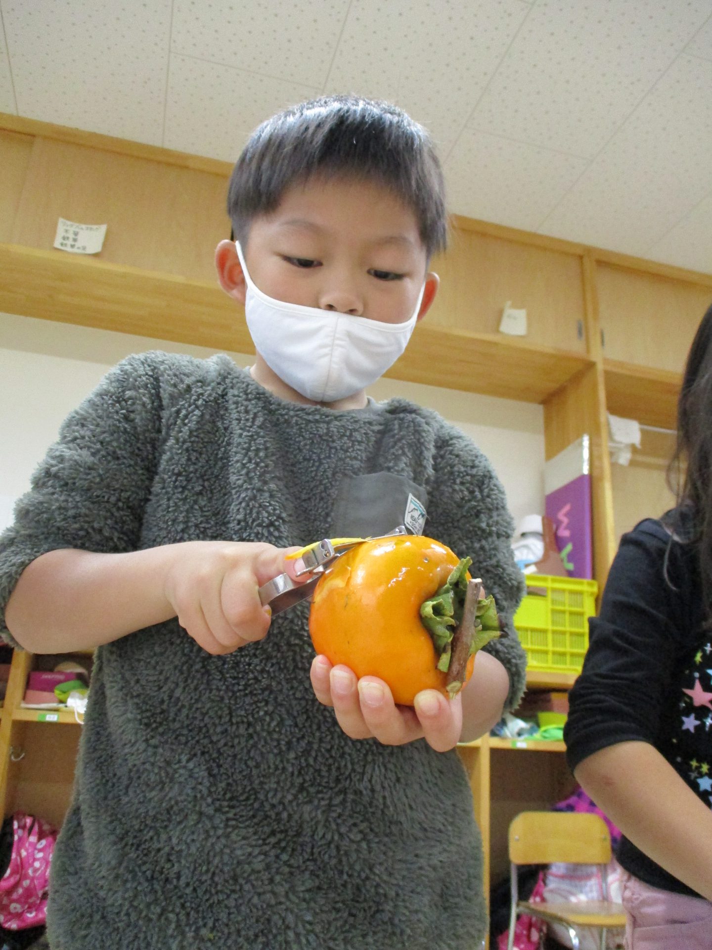空中で持ったまま皮をむいていると、なかなか難しいことに気づき、机の上に柿を固定して皮をむき始める子がいました。やっぱり何事も経験と工夫が大事ですね♪