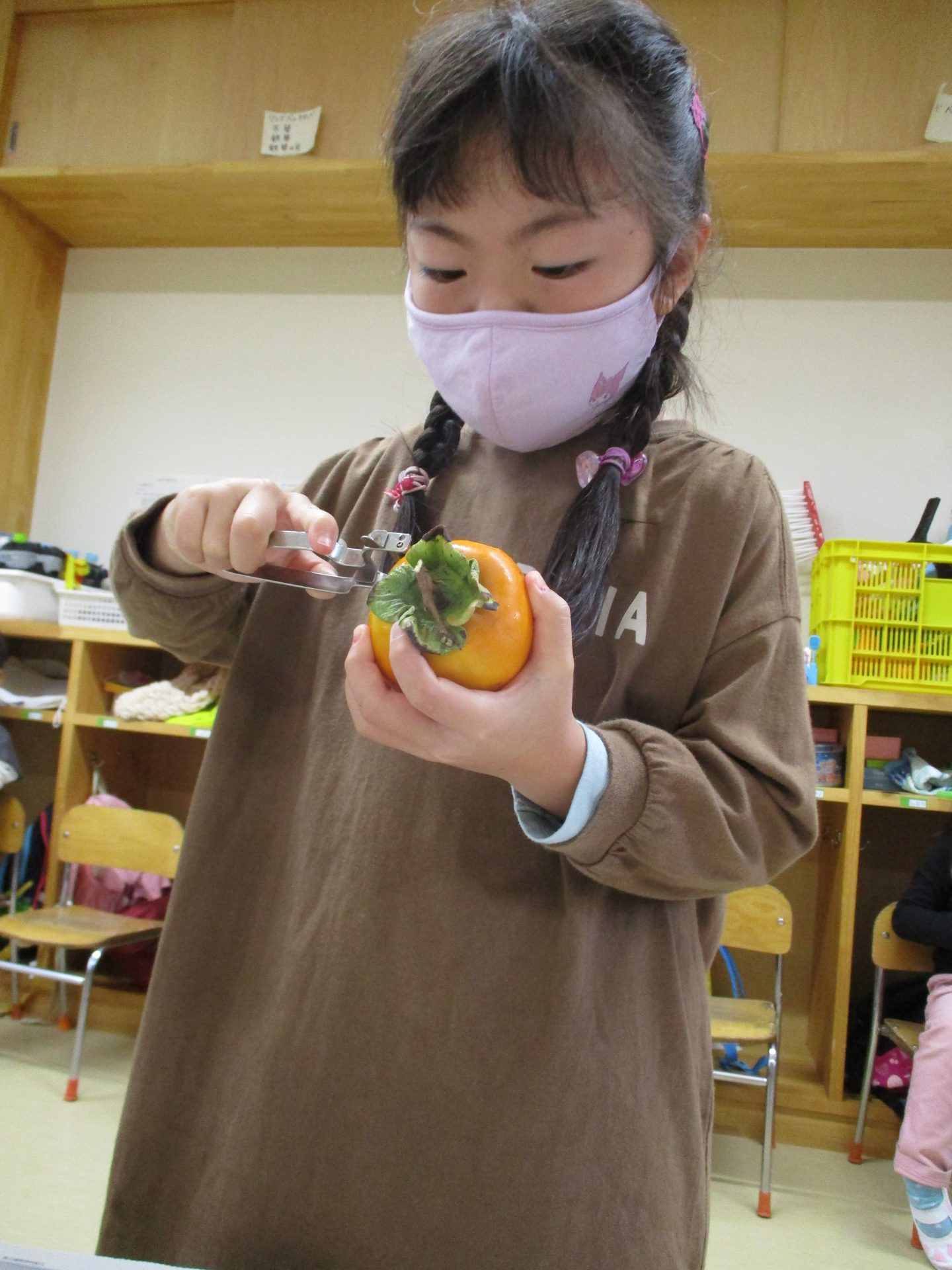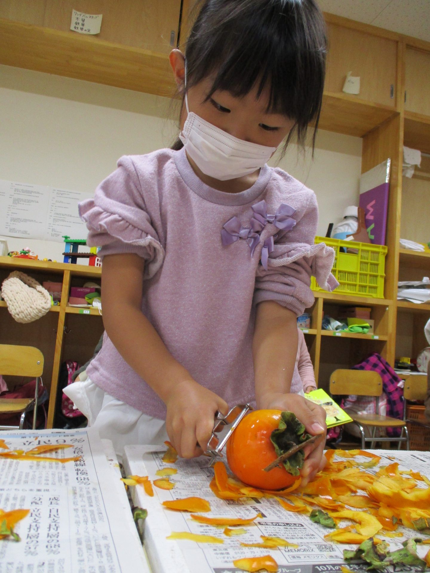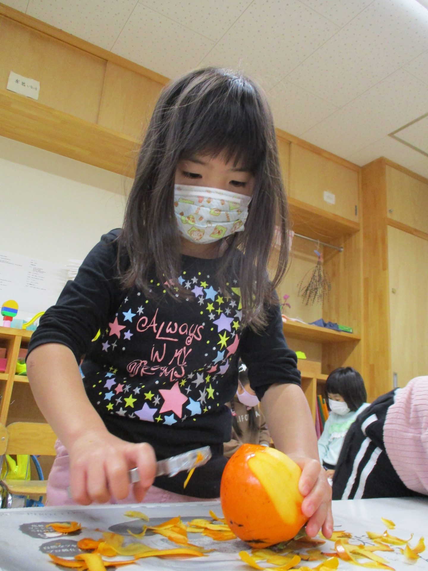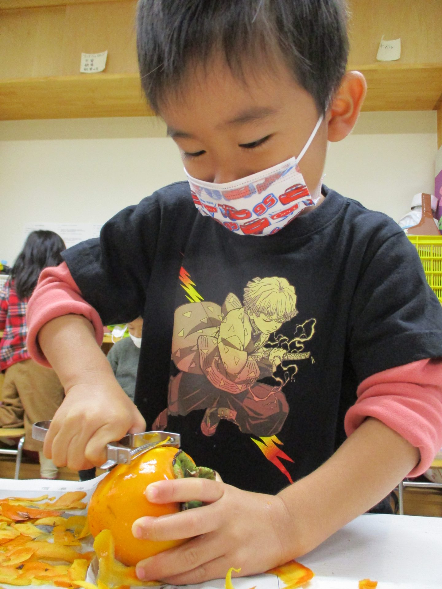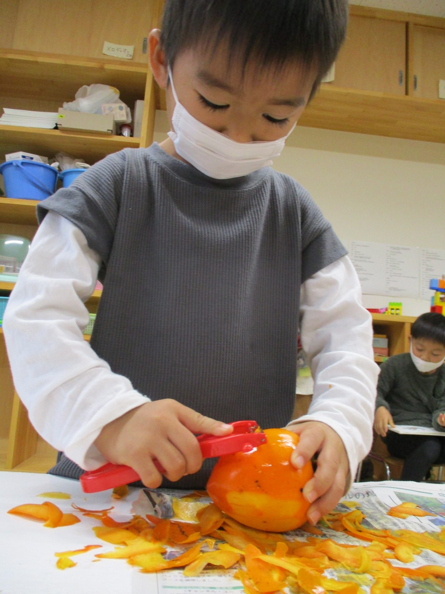 空中で持ったまま皮をむいていると、なかなか難しいことに気づき、机の上に柿を固定して皮をむき始める子がいました。やっぱり何事も経験と工夫が大事ですね♪