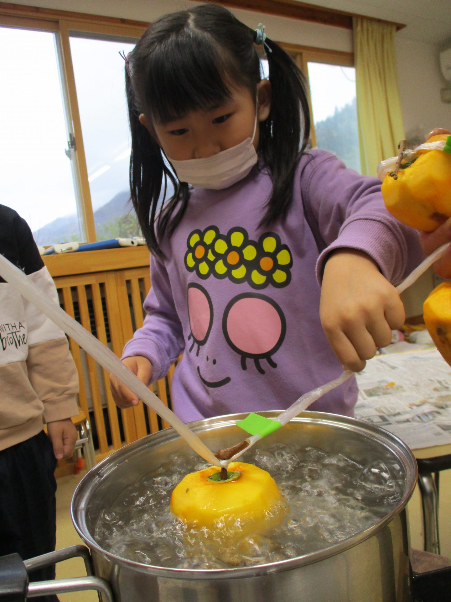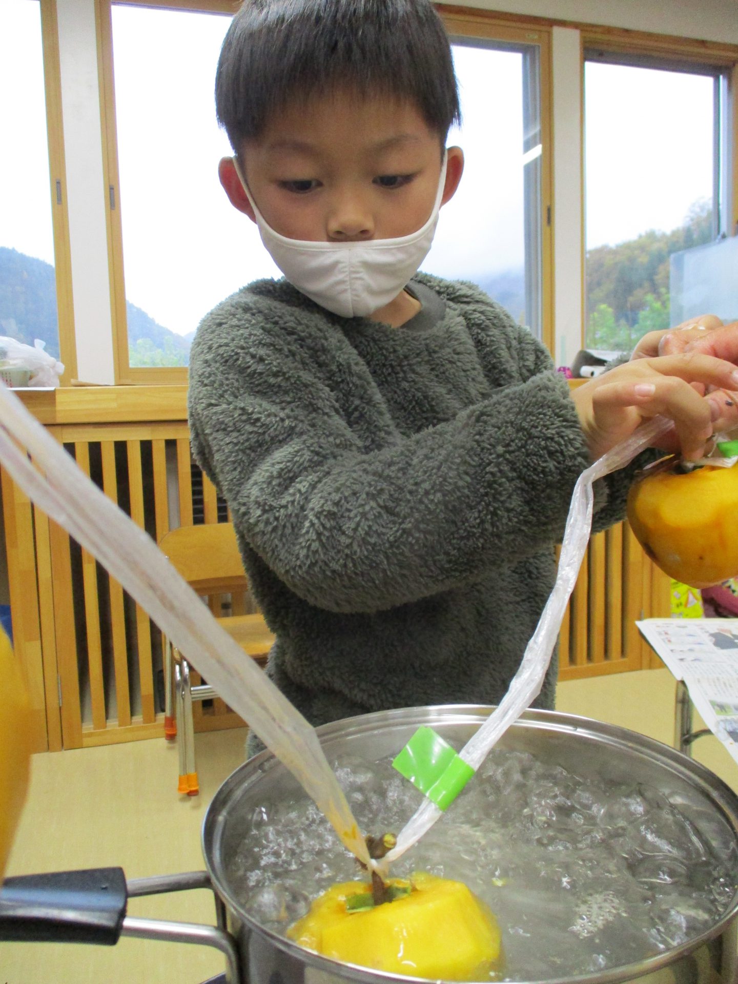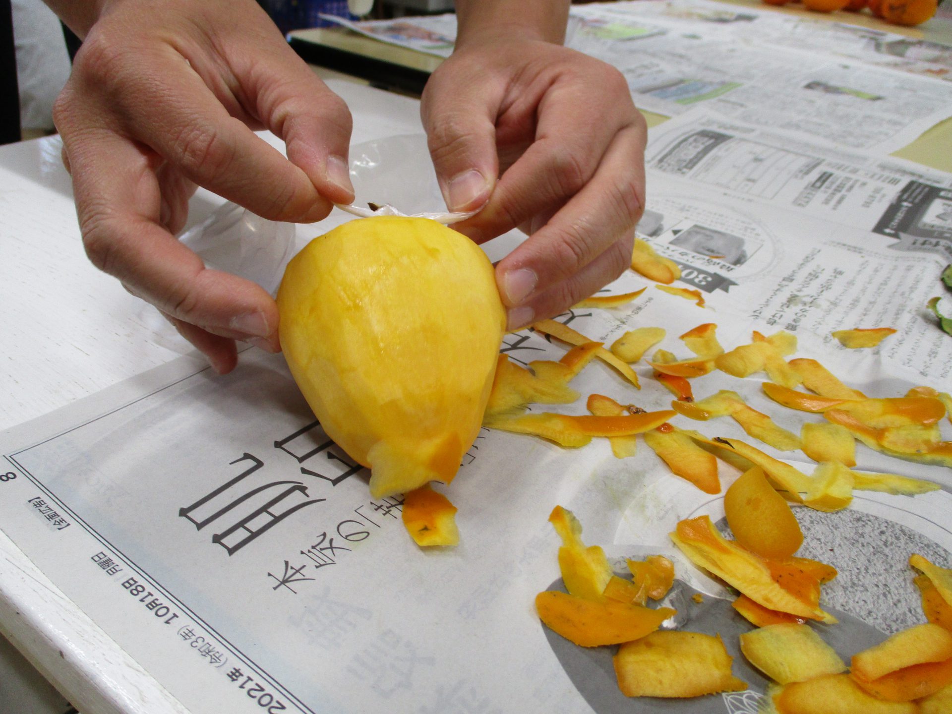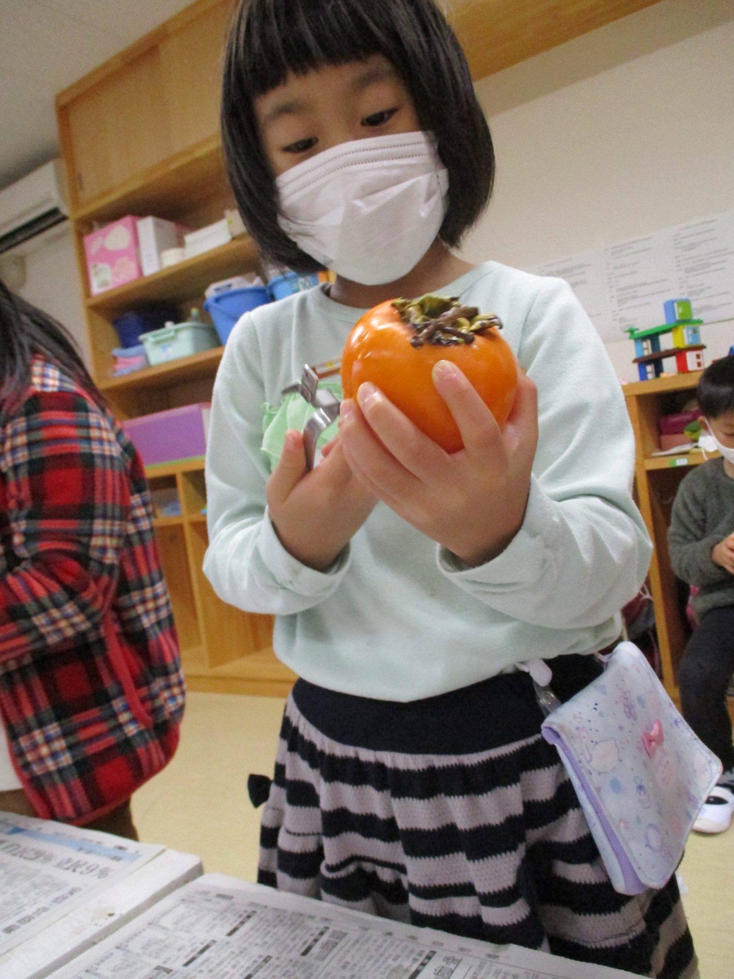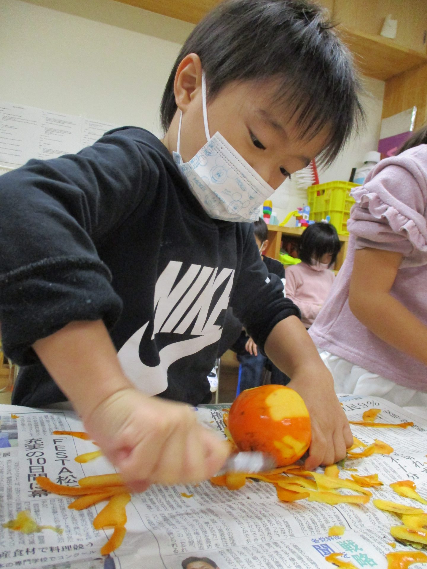 空中で持ったまま皮をむいていると、なかなか難しいことに気づき、机の上に柿を固定して皮をむき始める子がいました。やっぱり何事も経験と工夫が大事ですね♪
