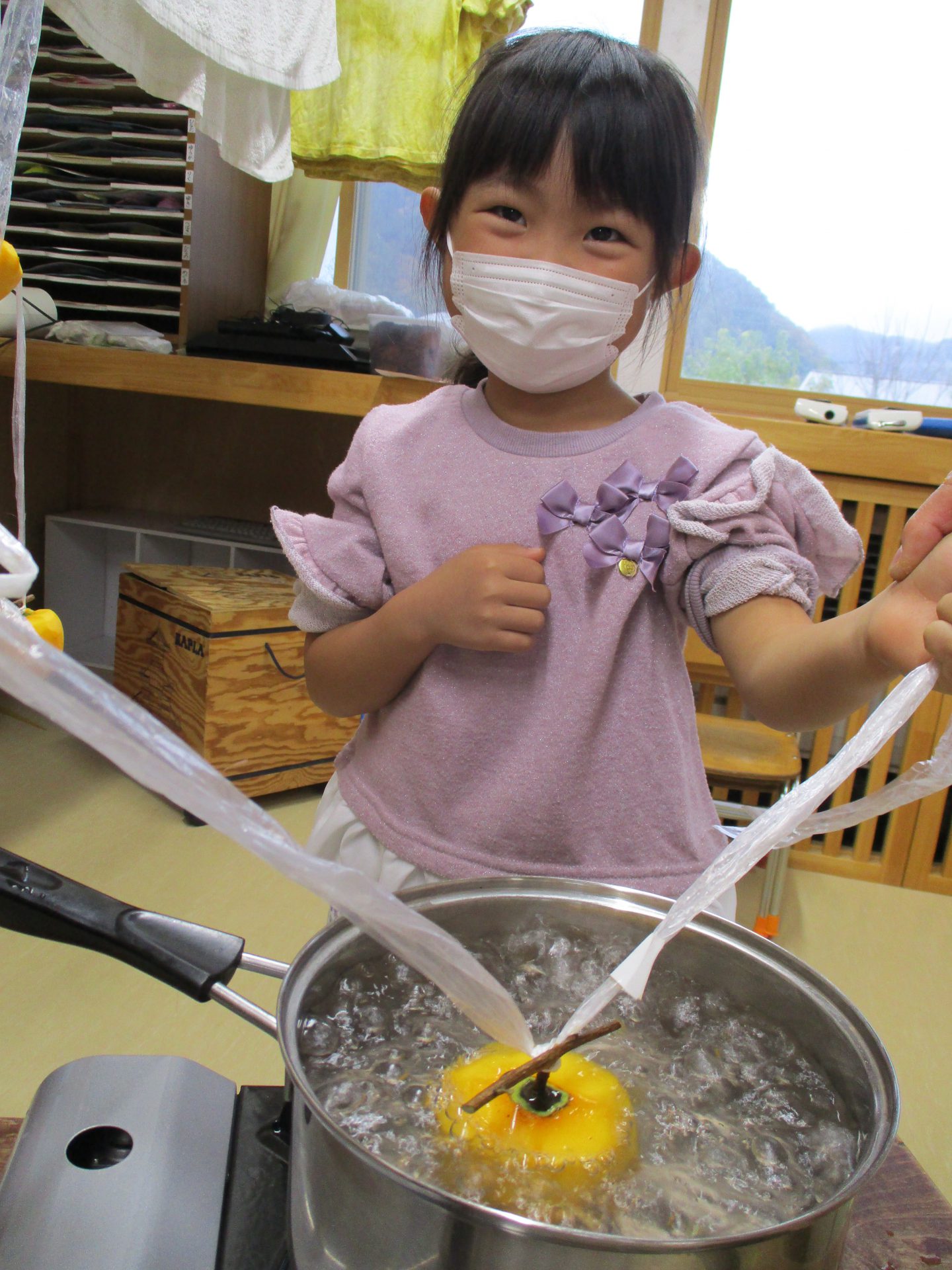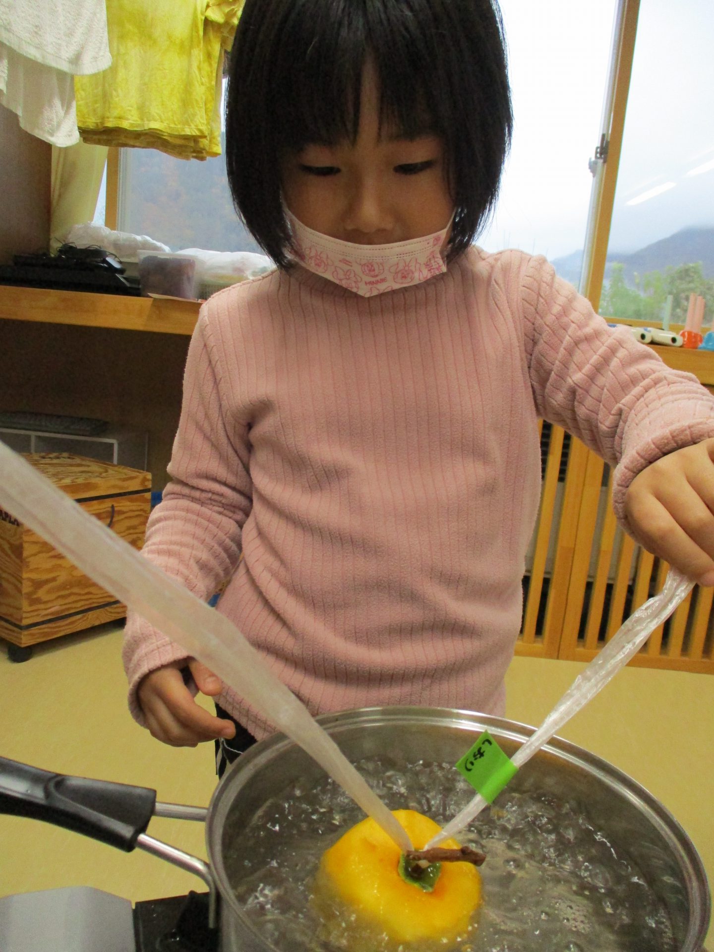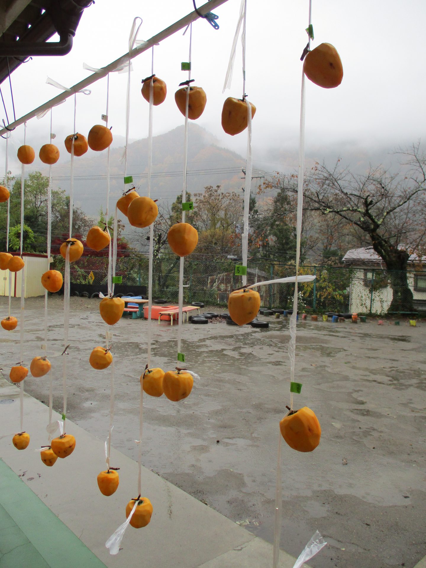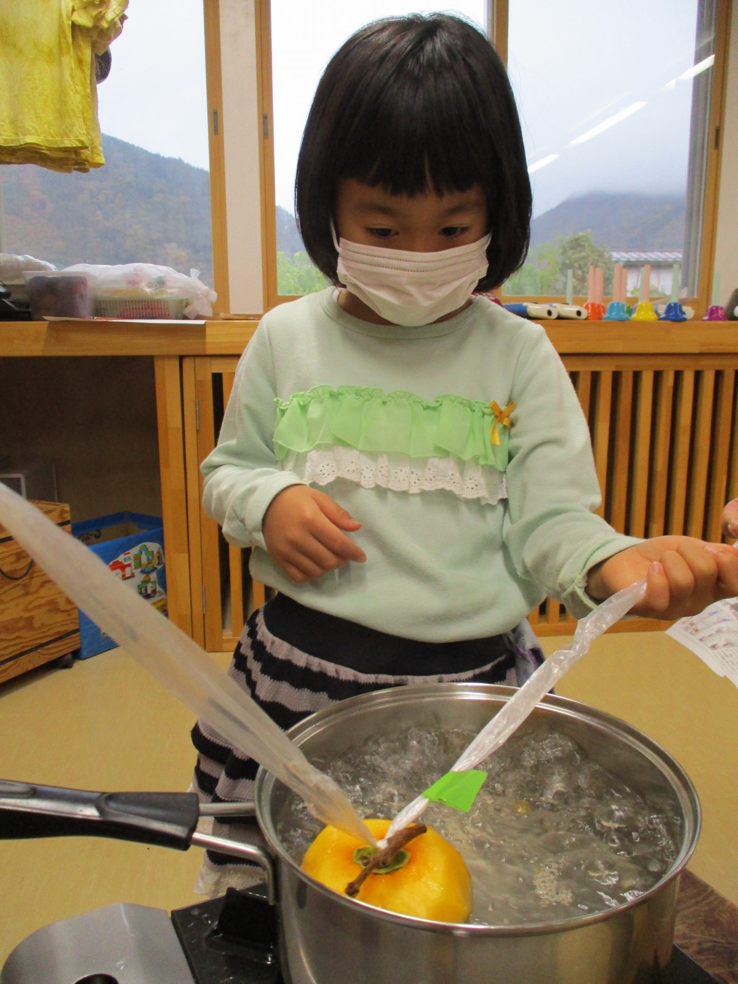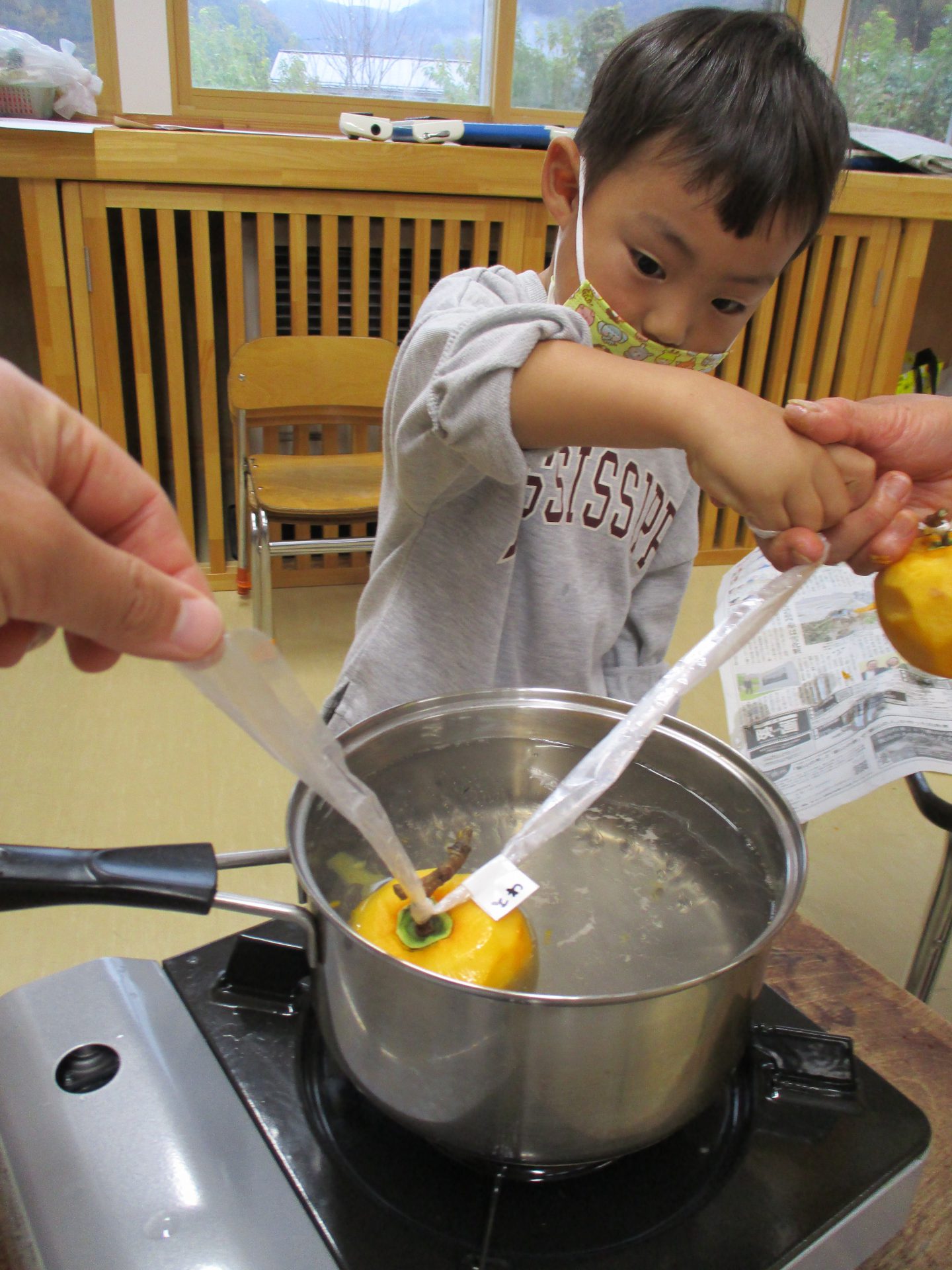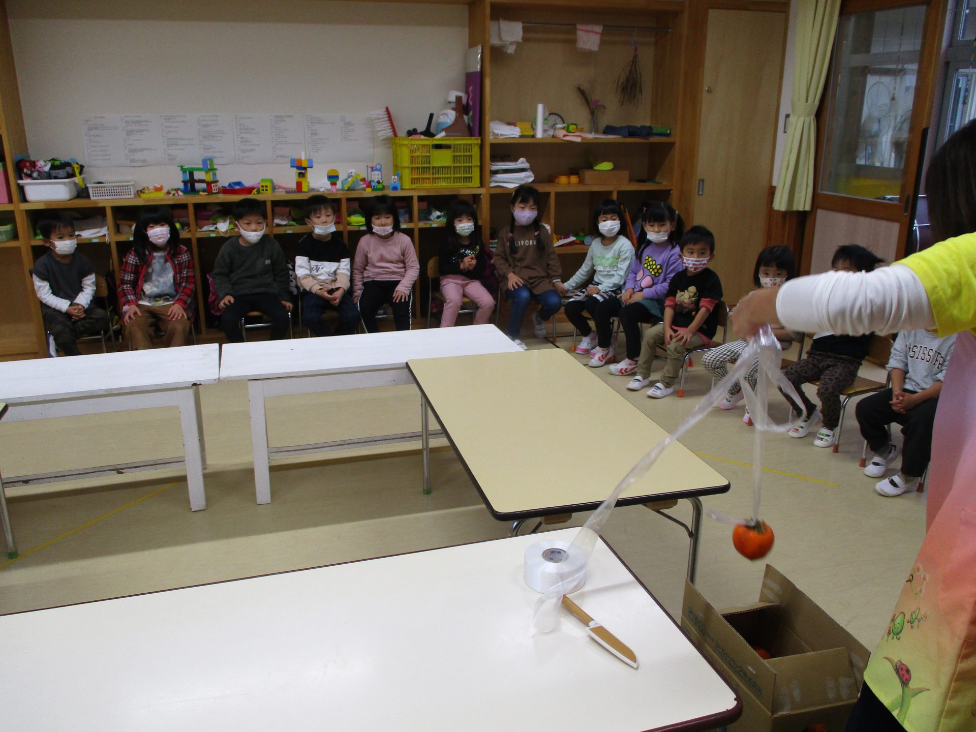 空中で持ったまま皮をむいていると、なかなか難しいことに気づき、机の上に柿を固定して皮をむき始める子がいました。やっぱり何事も経験と工夫が大事ですね♪