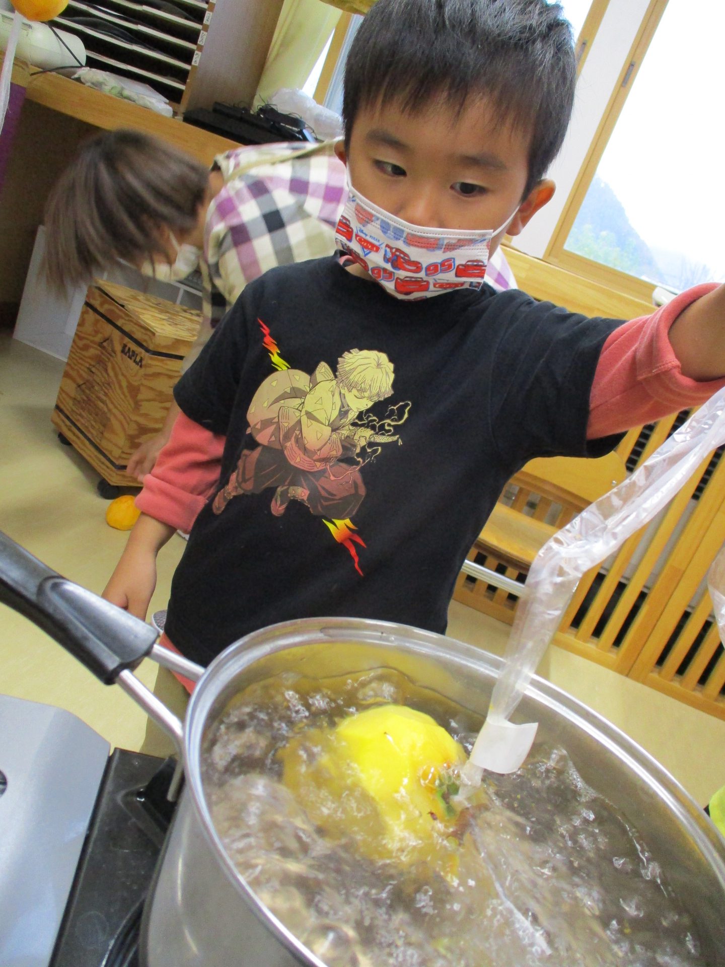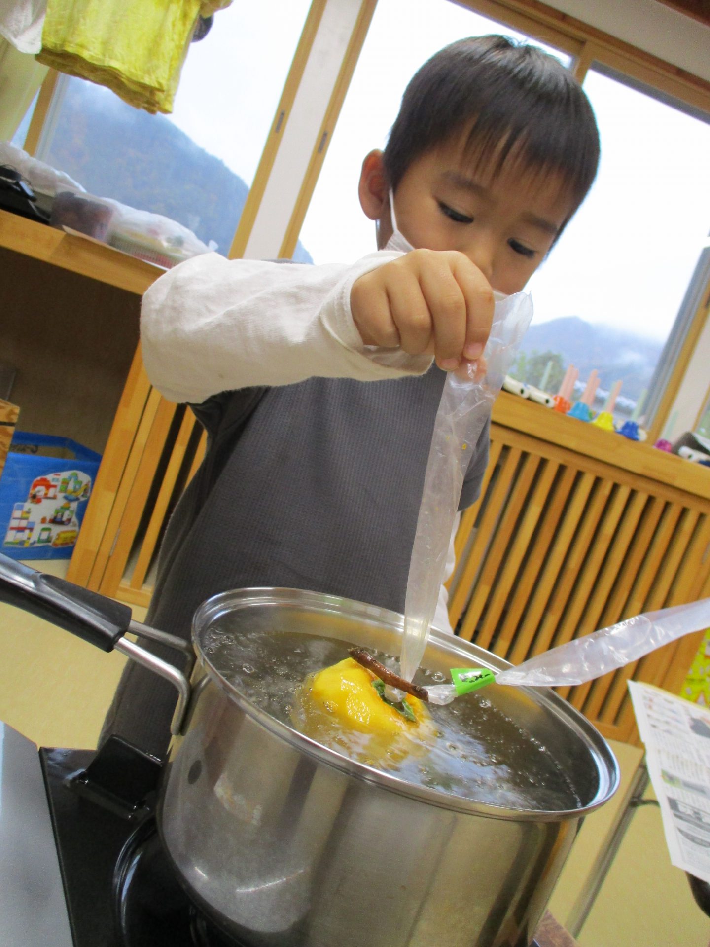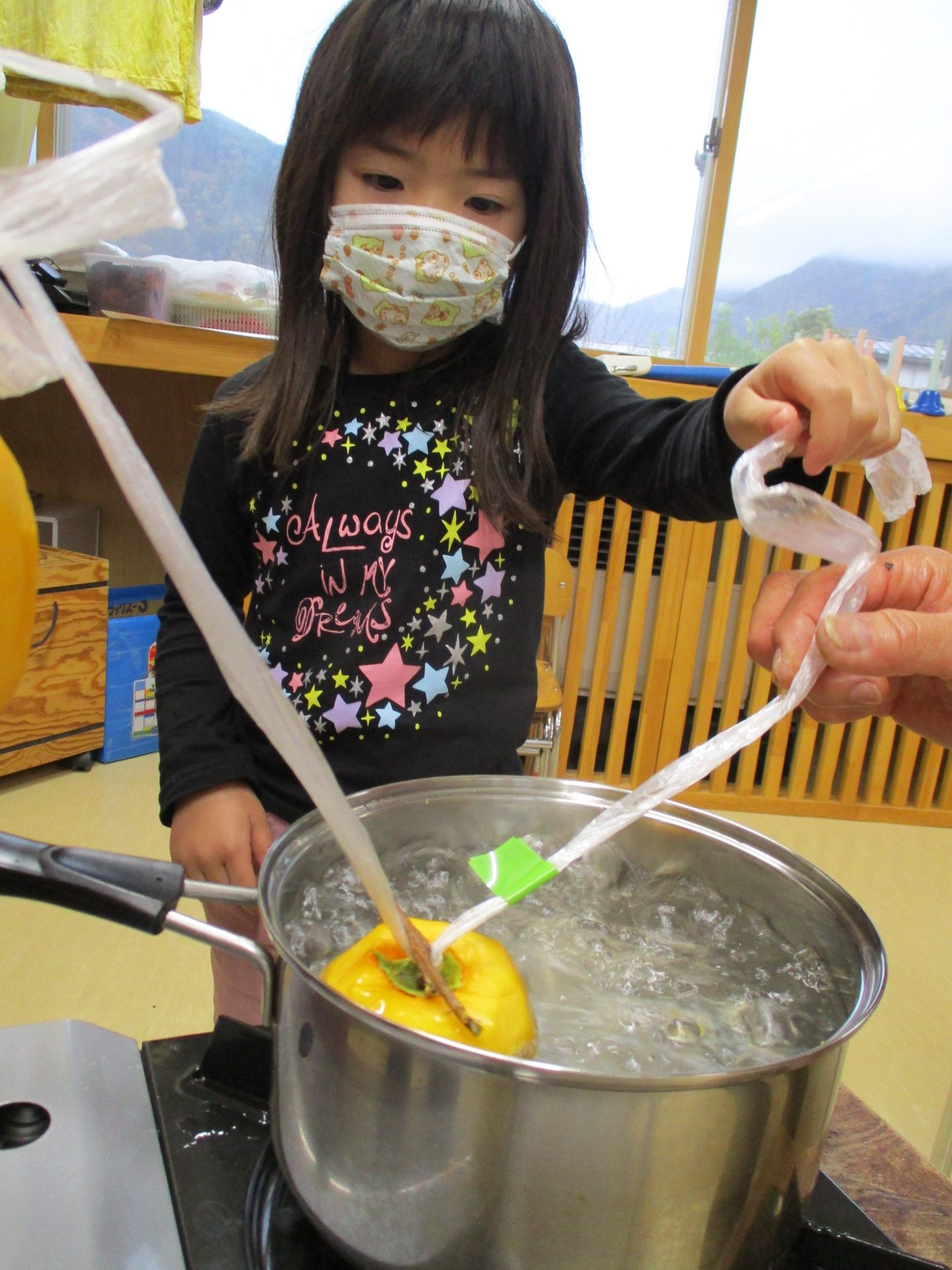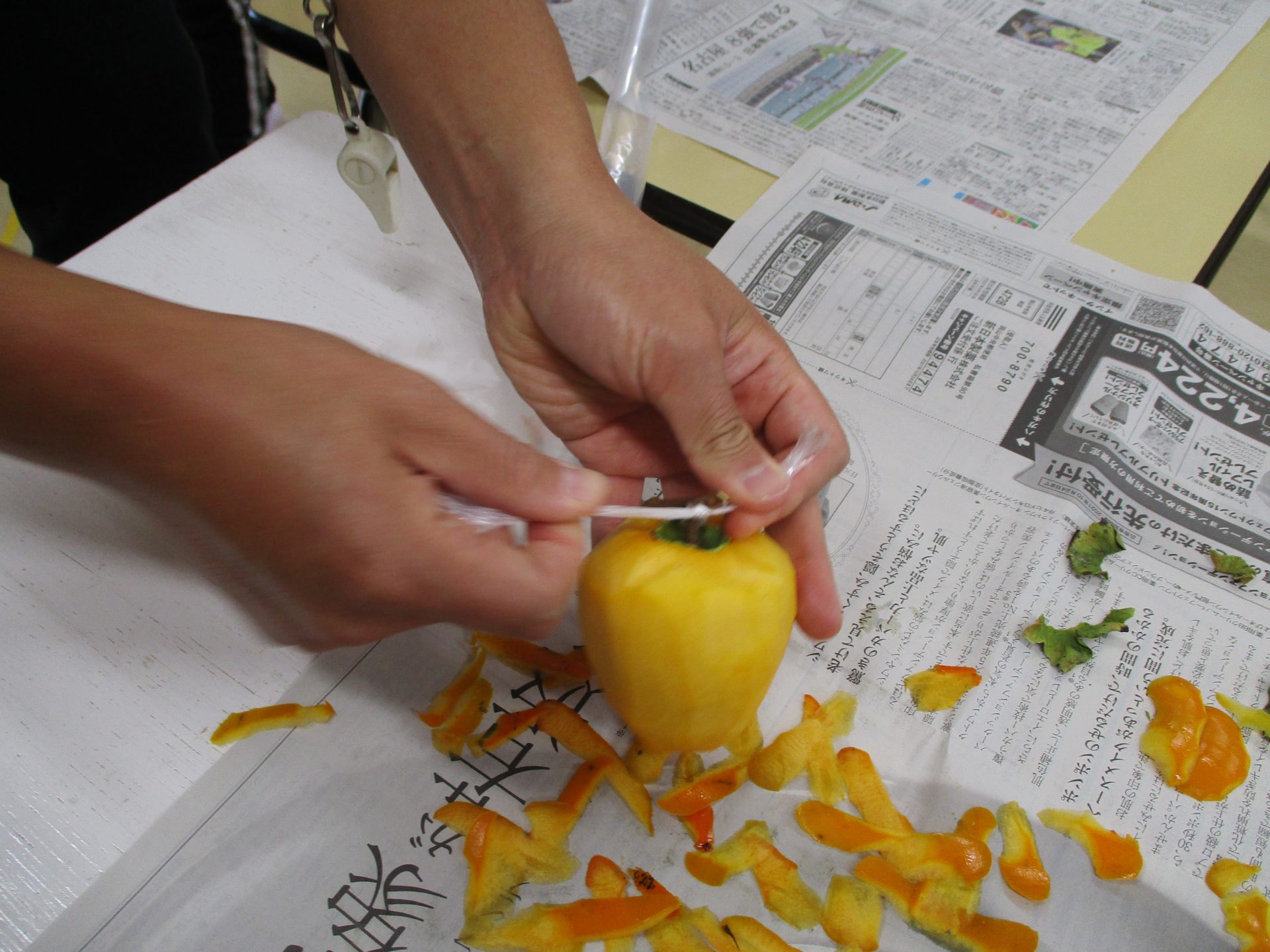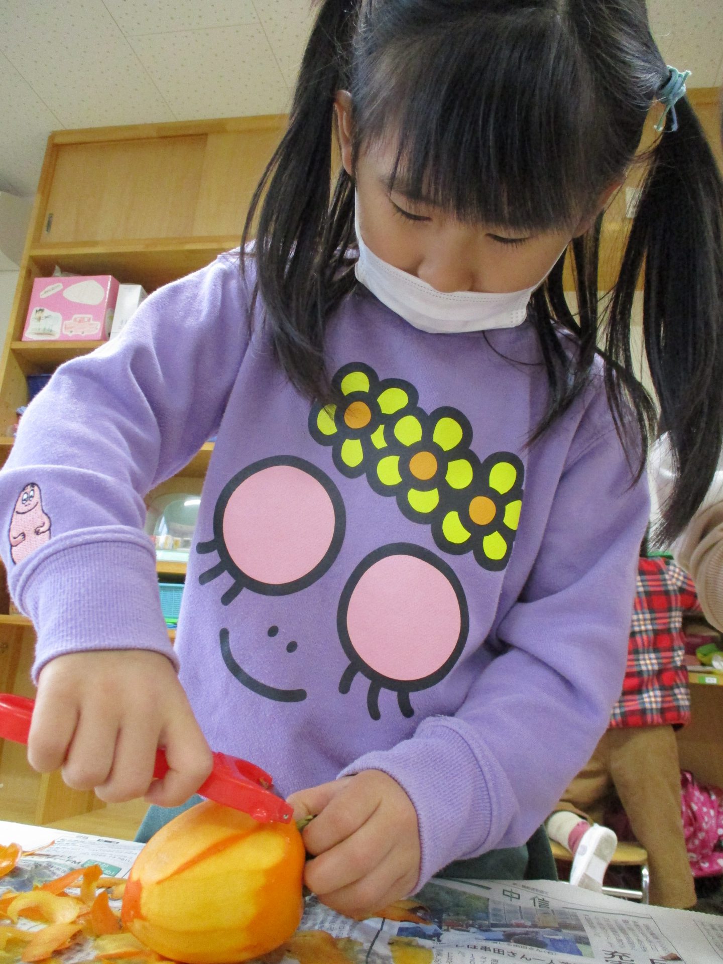 空中で持ったまま皮をむいていると、なかなか難しいことに気づき、机の上に柿を固定して皮をむき始める子がいました。やっぱり何事も経験と工夫が大事ですね♪
