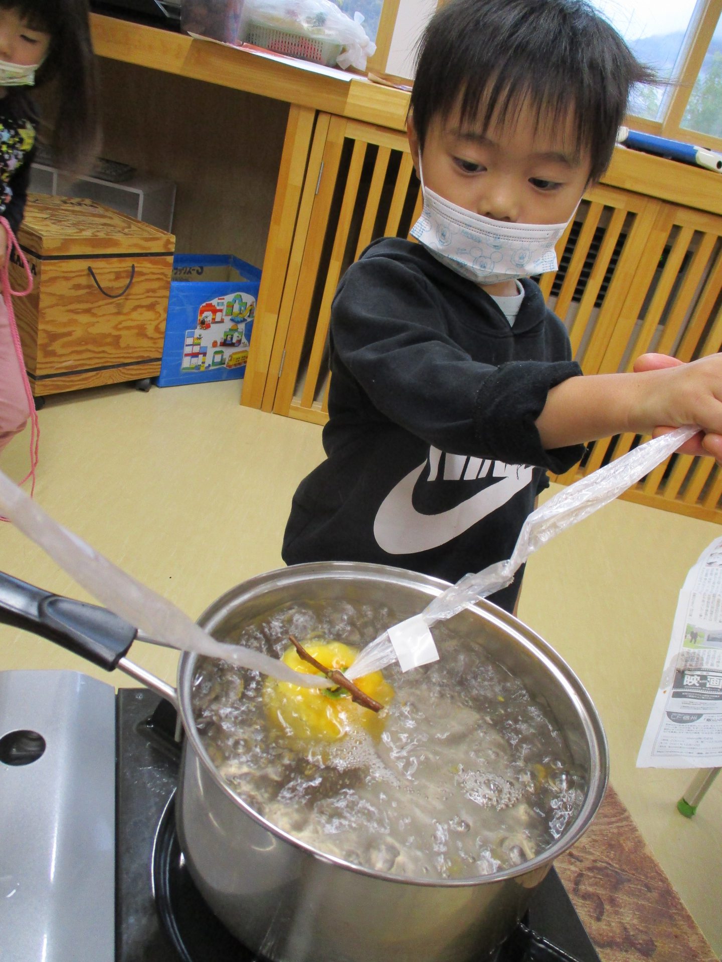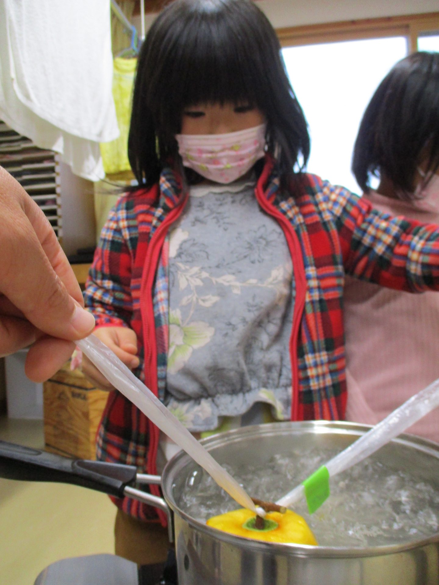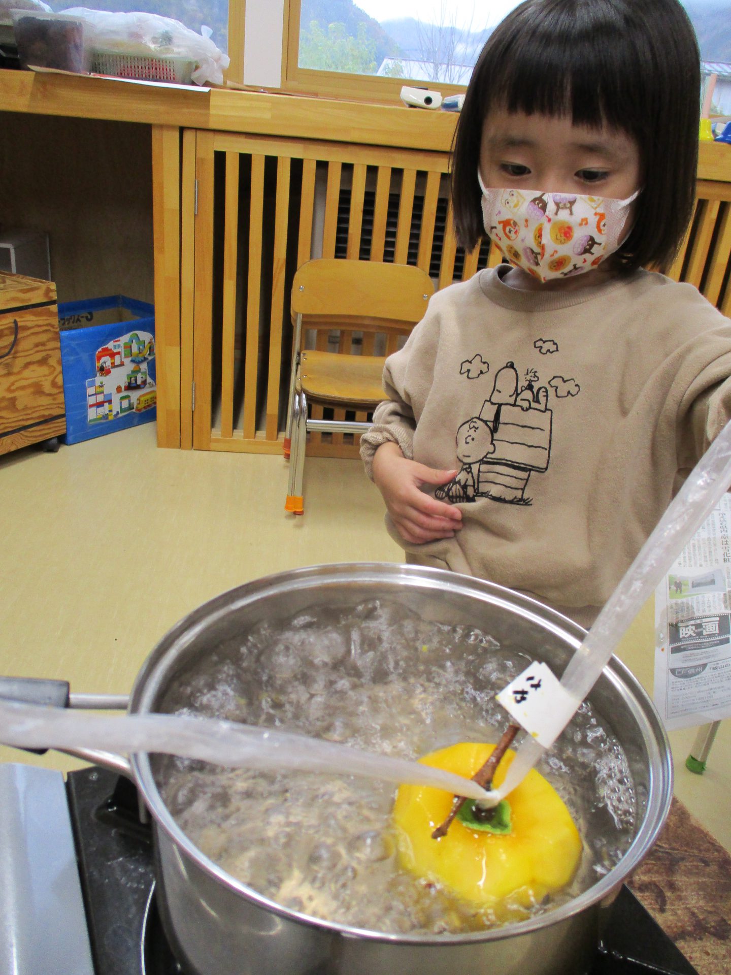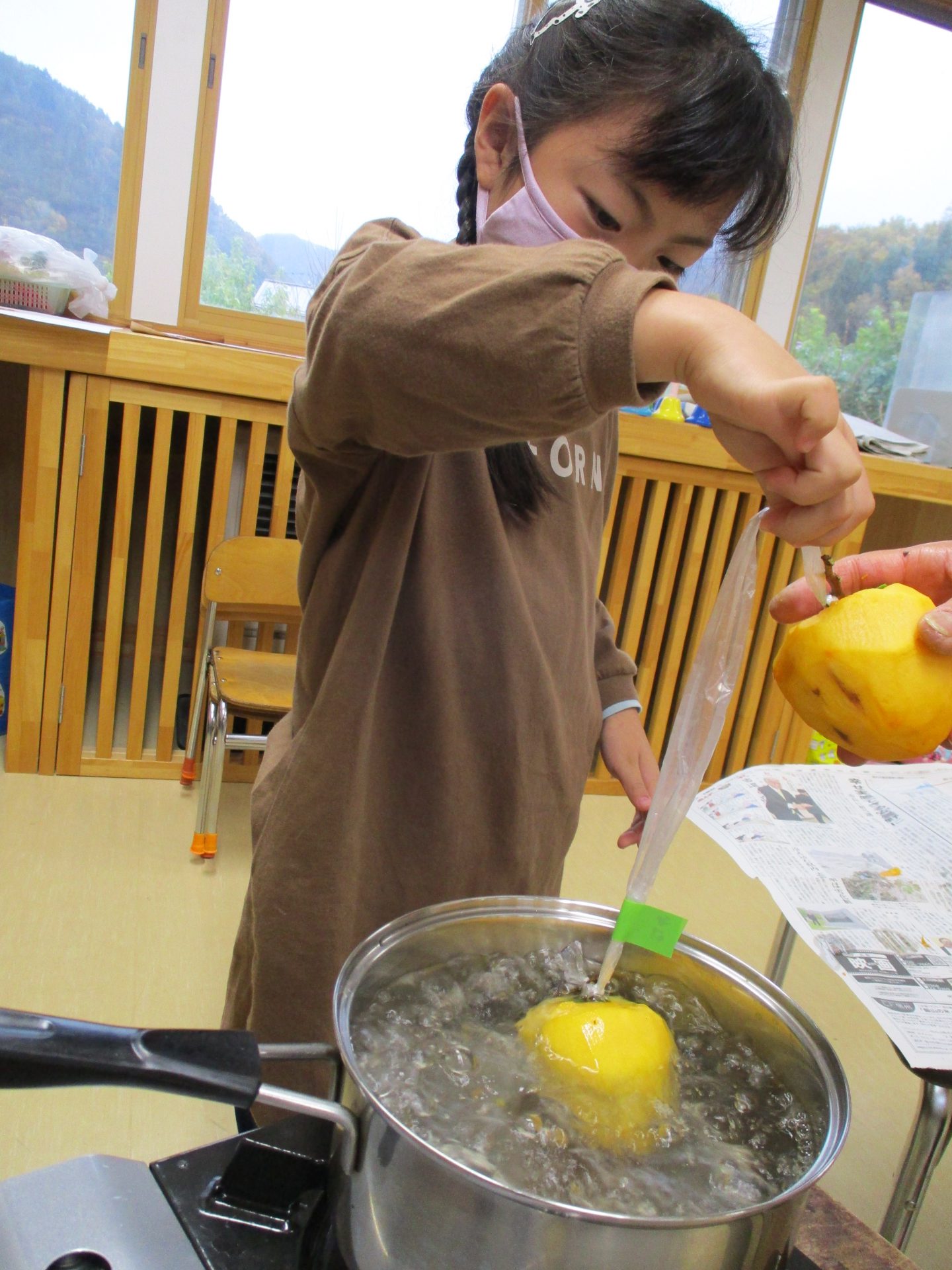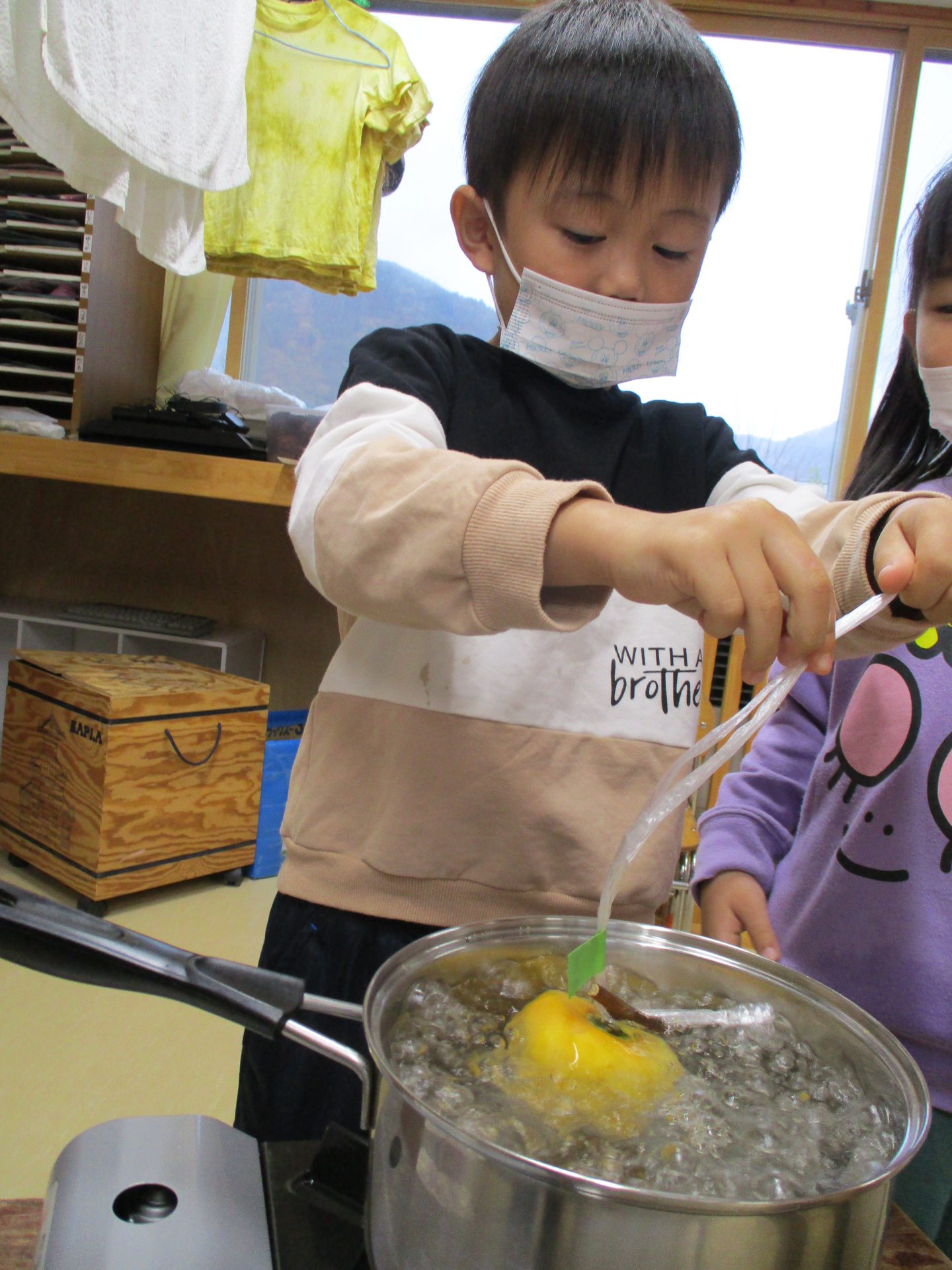 空中で持ったまま皮をむいていると、なかなか難しいことに気づき、机の上に柿を固定して皮をむき始める子がいました。やっぱり何事も経験と工夫が大事ですね♪