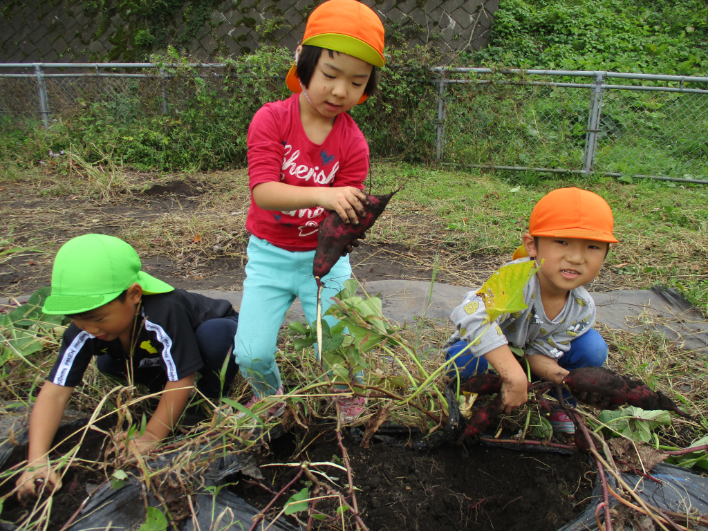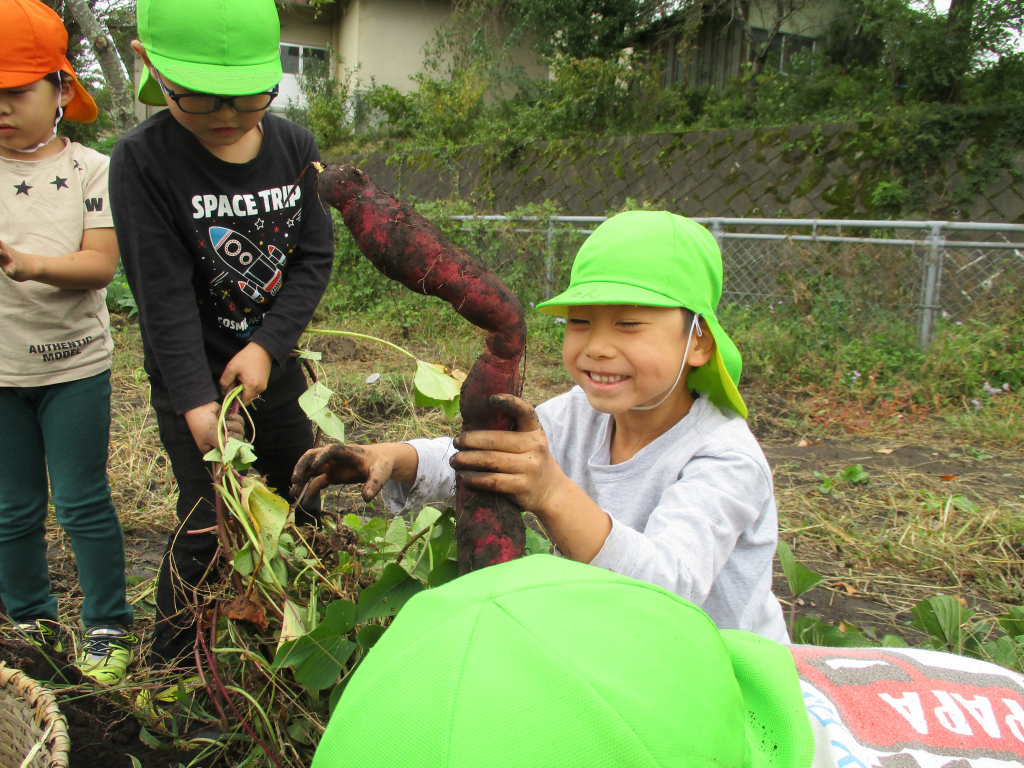先日、焼き芋会がありました。焼き芋会で使うさつまいもはもちろん自分たちが大切に育ててきたさつまいも。まずはさつまいも掘りの様子をお伝えします。「ちゃんとできているのかな」とドキドキして掘ったさつまいも。掘り進めていくと、大小様々なさつまいもを沢山収穫することができました。