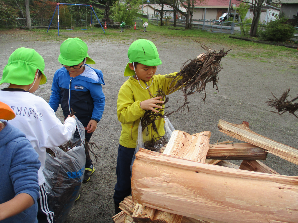 そして子ども達の楽しみにしていた焼き芋会当日。さつまいもを洗ったり紙に巻いたりして、アルミで包むのも子ども達が行います。年長児を中心に薪の準備もしました。「つみきみたい」と言いながらも崩れないようにバランスを見ながら組み立てていきます。中心に子ども達が拾ってきた杉っ葉を入れ隙間に新聞紙を入れ…出来上がり!!