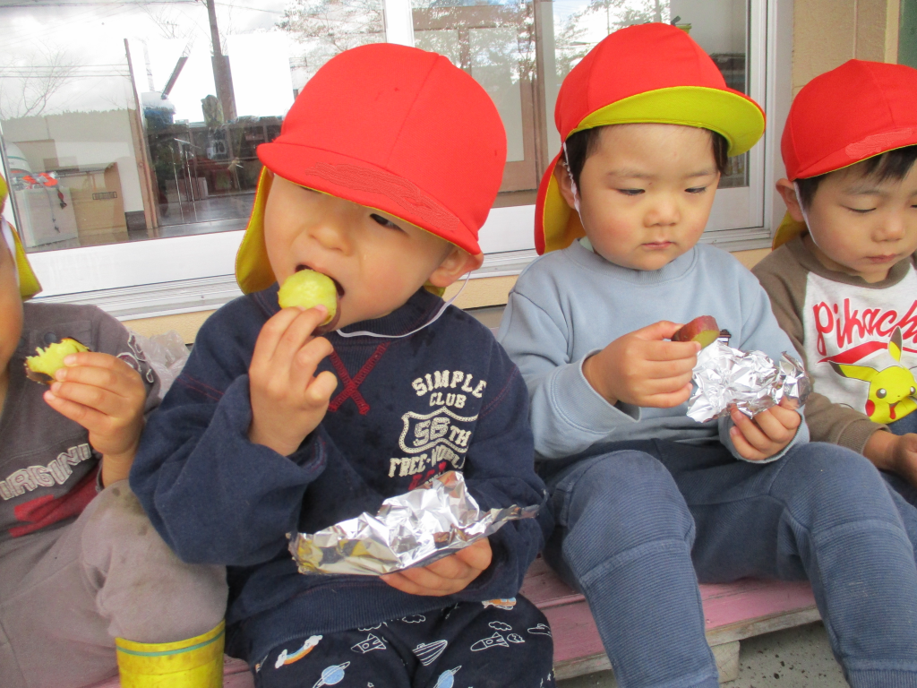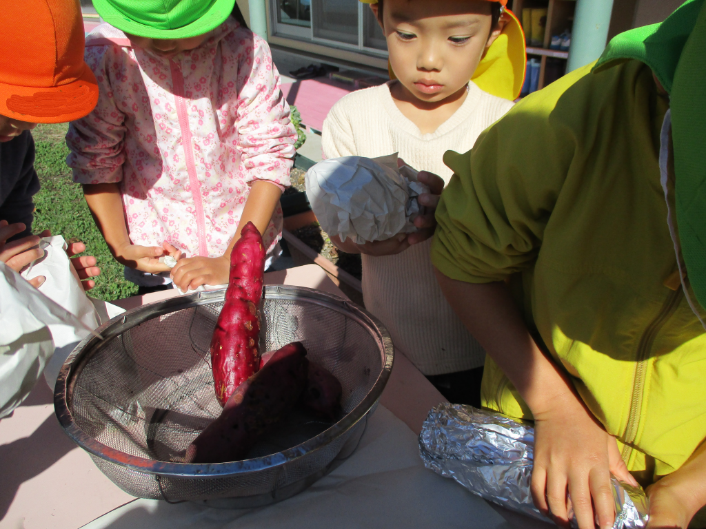 点火し炎が出ると「あったかい」「なんかおとがする」と燃え上がる様子をじっと観察していました。おきになりさつまいも投入。しばらくしていい匂いが園庭中に広がりました。「いいにおいする」とすぐに気づいた子どもたち。その場で出来立てを少しずつ頂きました。「しろいけむりでてるー」「あついー」と言いながらも”ふーふー”して食べると出来立ては格別においしかったです!給食で、残りの焼き芋を食べました。