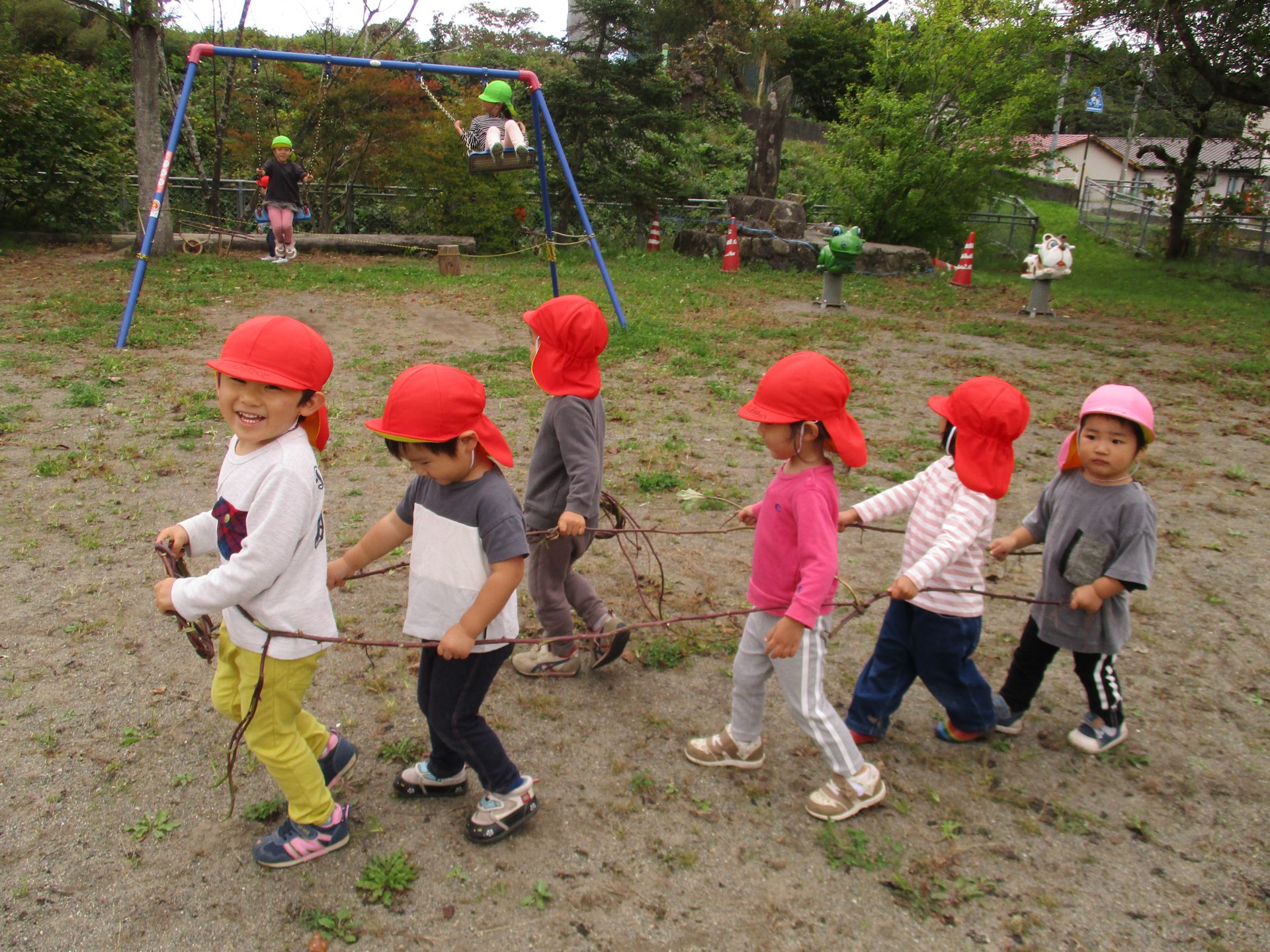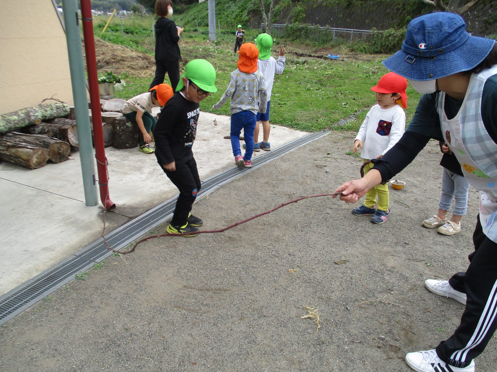茎集めを終えると、ツルに目がいった子ども達。保育士とリース作りをしたり、ツルで縄跳びを始めたり、長いツルで電車ごっこ、そして大縄まで…子どもの発想は素晴らしいですね。