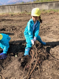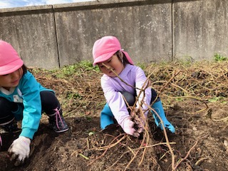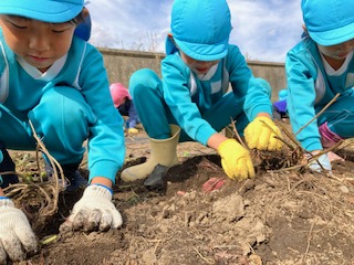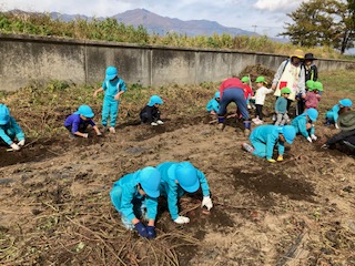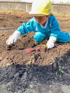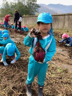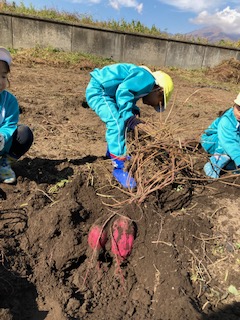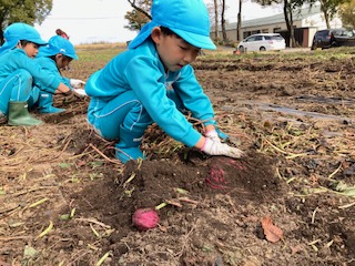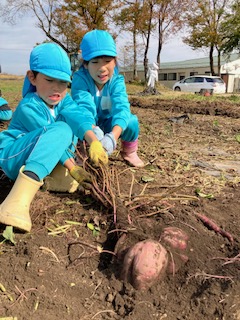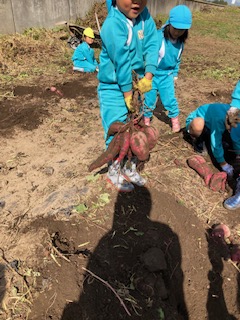 春に植えたお芋の苗が大きく育った事や土の中でお芋が大きくなる事に興味を持ち『なぜだろう?』と疑問をもってもらいたい。また、実際に掘ってみると自分の顔ぐらいあるお芋に歓声を上げ、一生懸命掘り上げた時には、達成感に満ち溢れ、喜びの表情をたくさん見せてくれました。幼児期のこのような体験は大人になっても良い思い出となって残って欲しいなと思いました。このような体験や経験をたくさん出来るように日々考えていかなければならないなと改めて思いました。