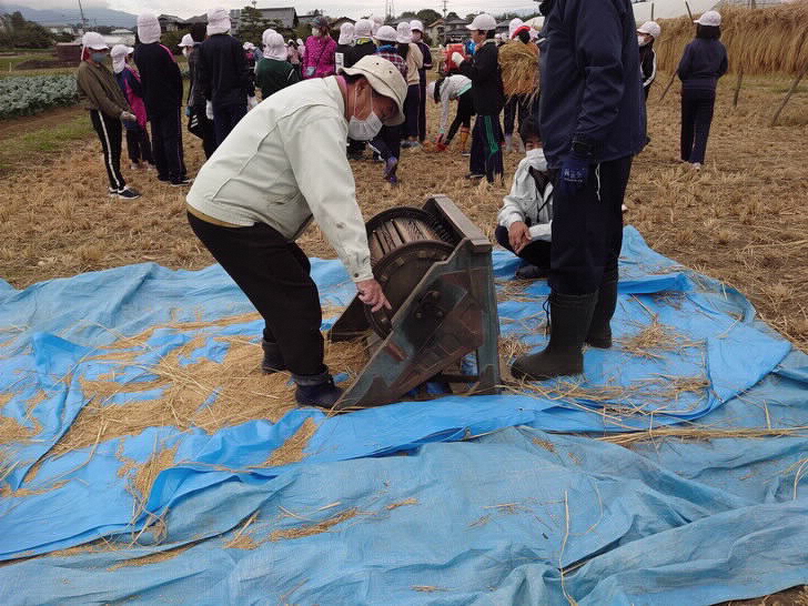 午前中は小学校で行った脱穀の様子を見せてもらいました。
