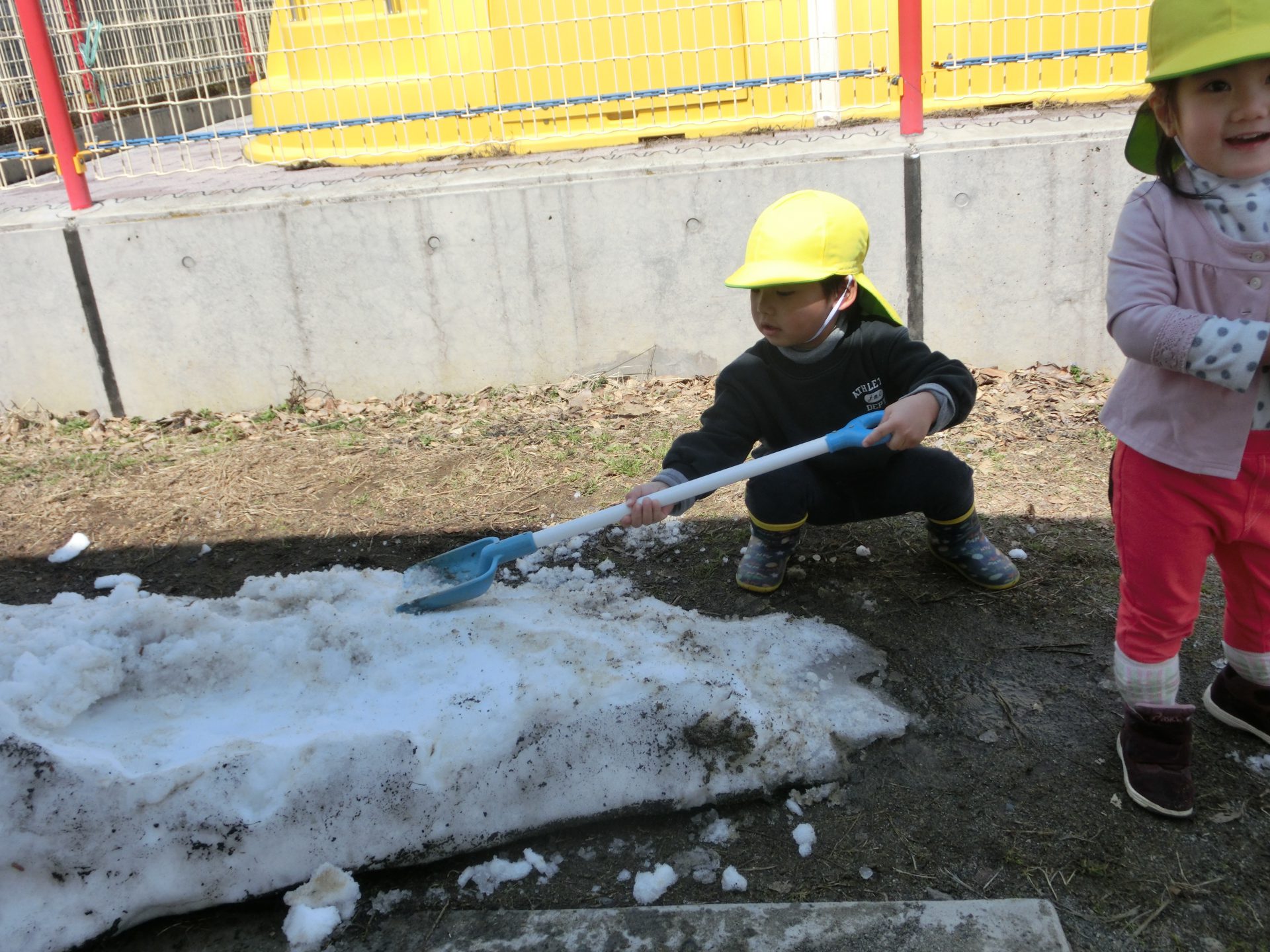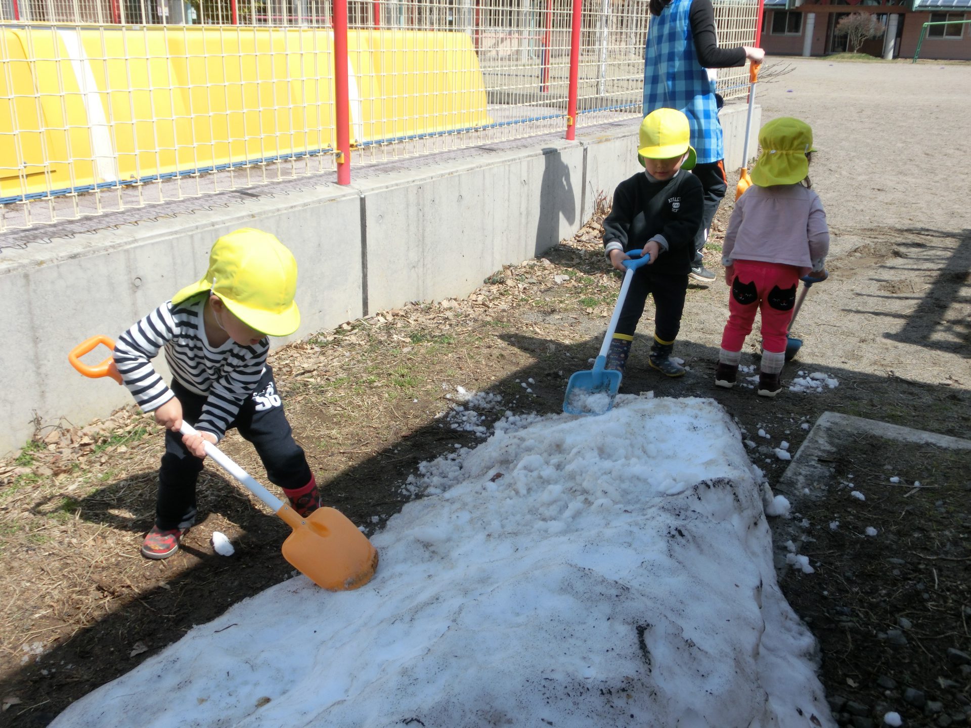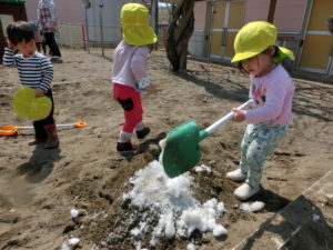 春を見つけに、春を探してみたいと思いとびだした園庭でしたが、残雪で遊べるとは、冬の置き土産をいただいたようでした。