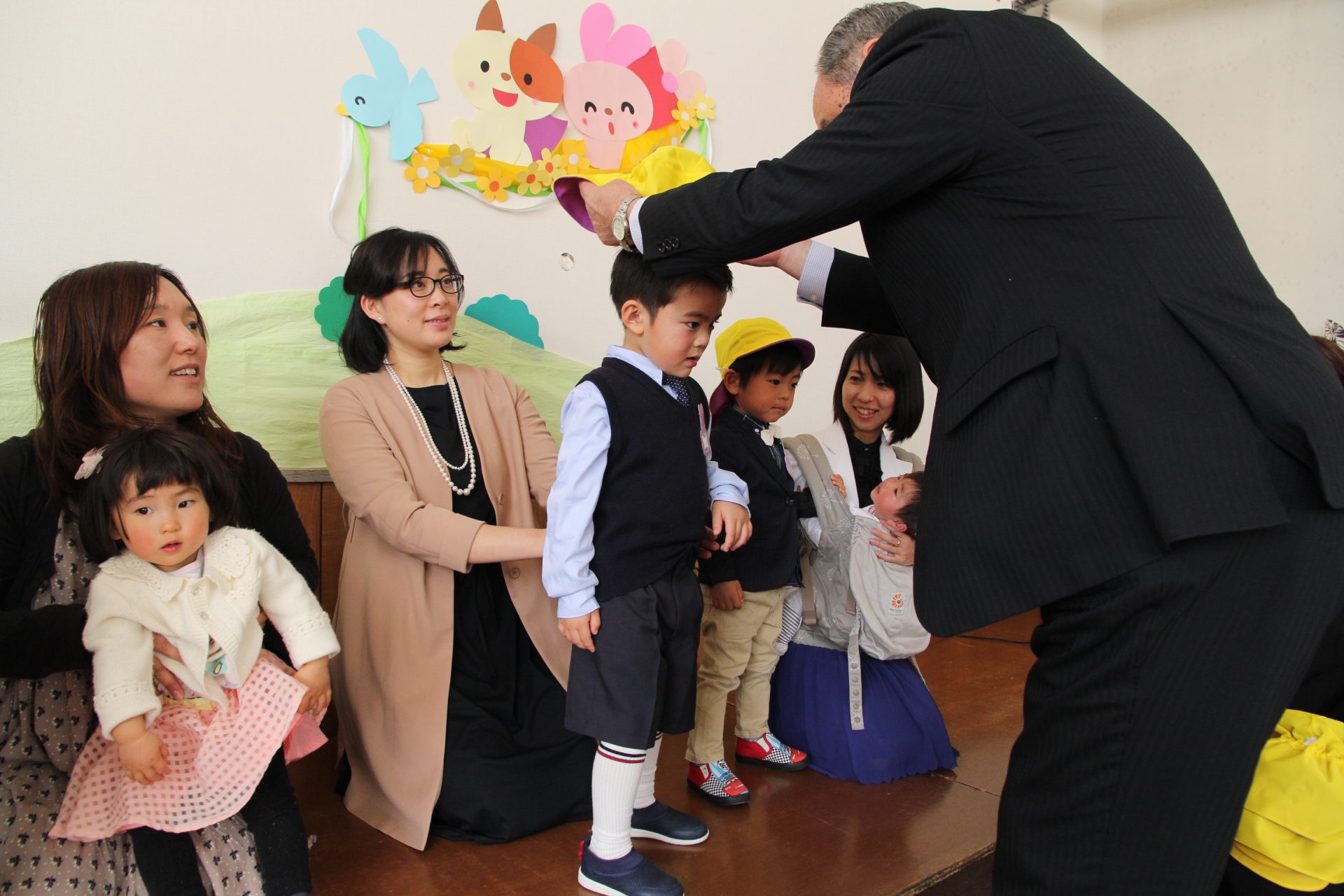 明日からこの帽子をかぶって元気に登園して来てください。という町長さんのお話をしっかり聞いている子ども達でした。
