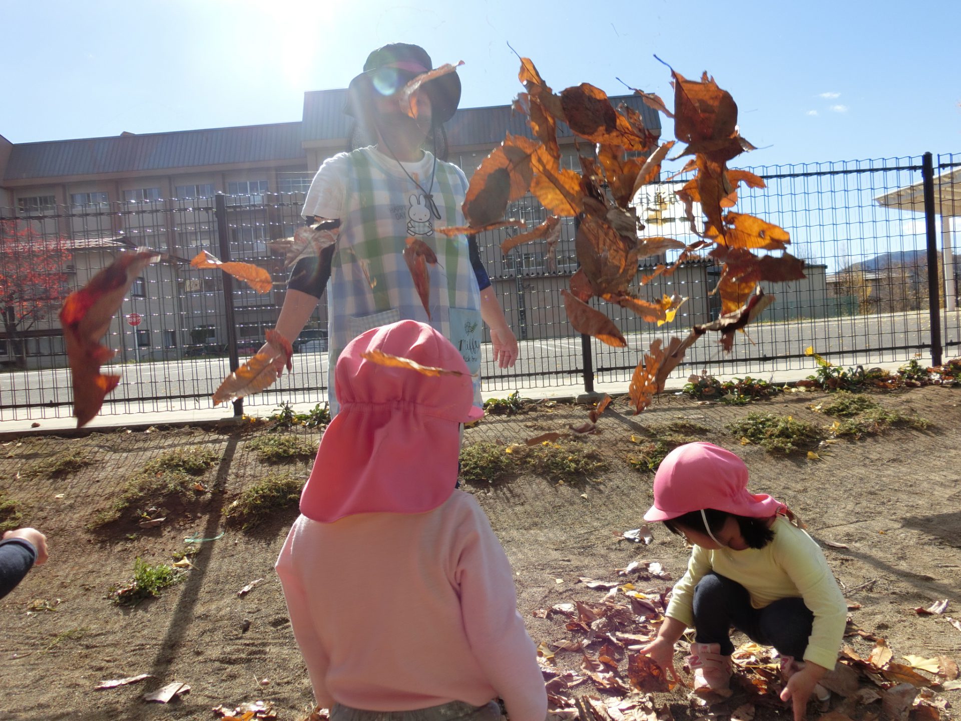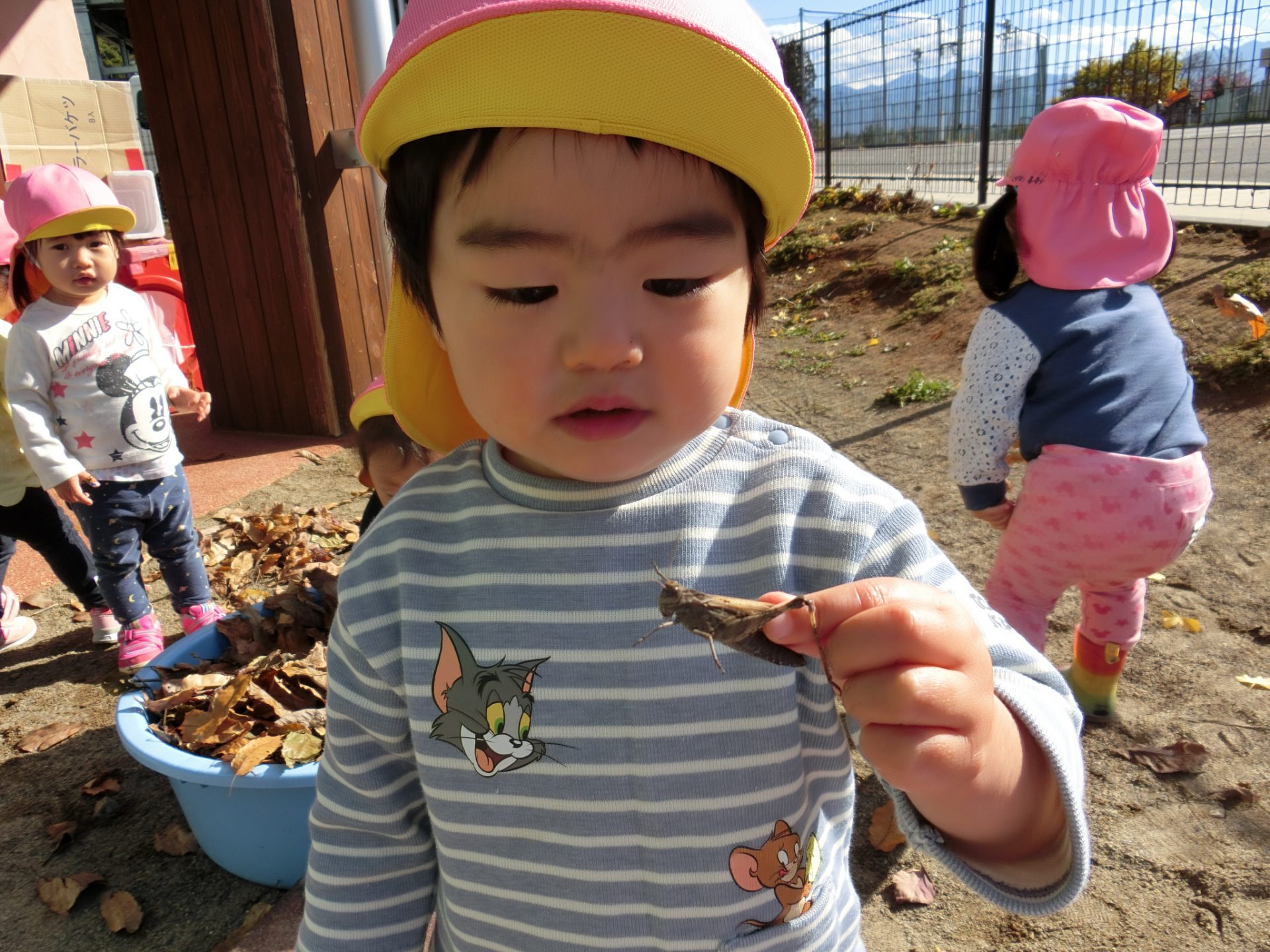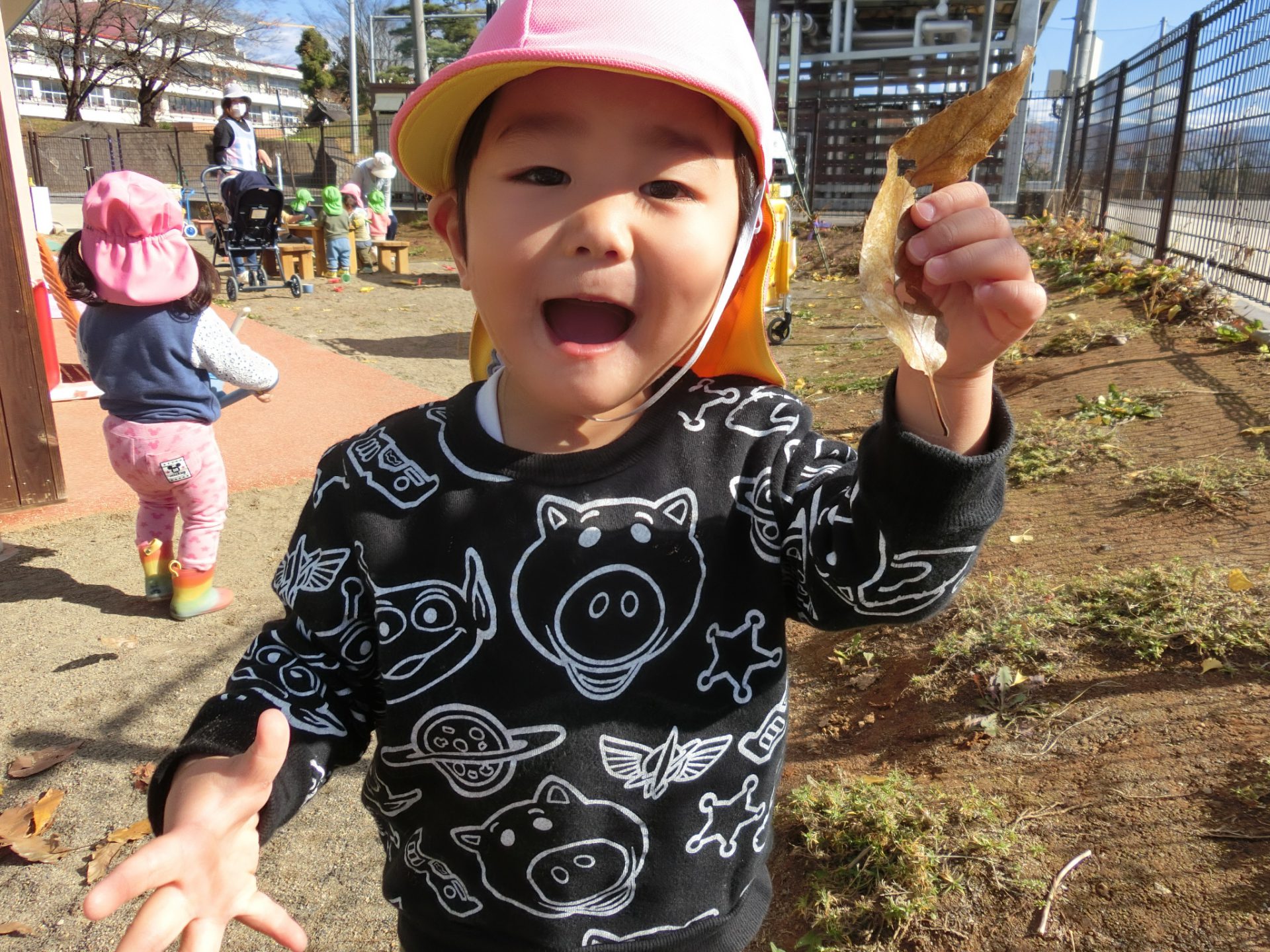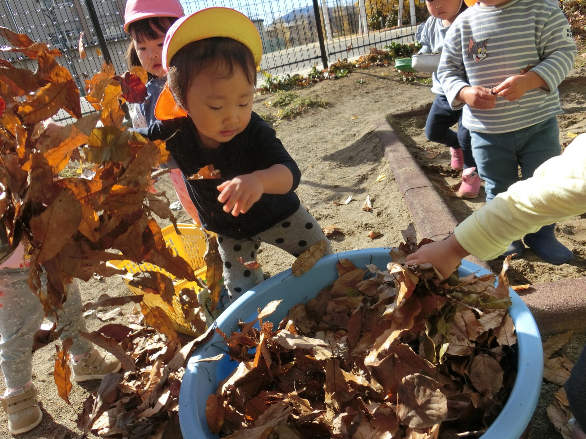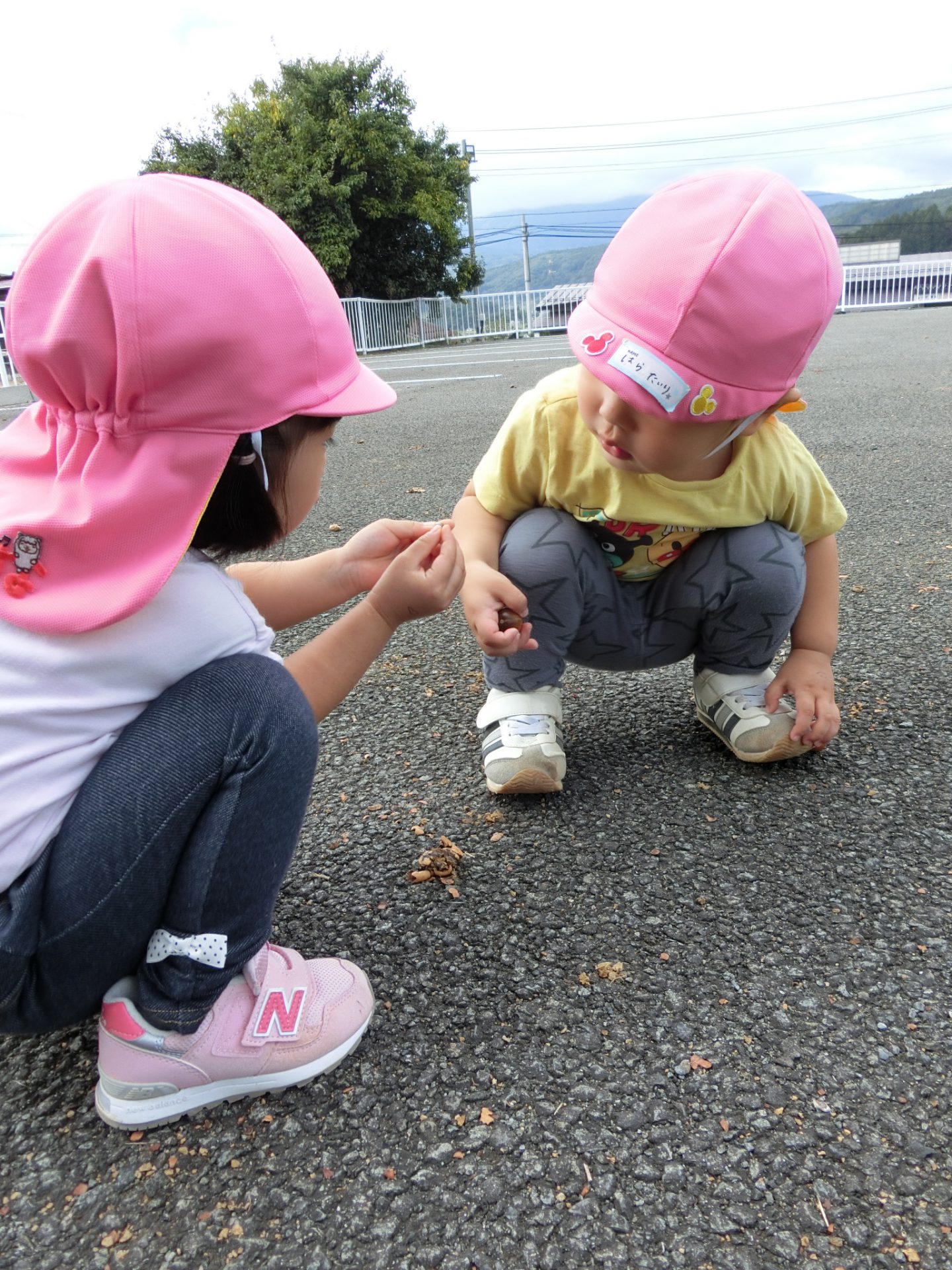 自分たちで触れながら遊びながら、いろんなものの面白さや楽しさを経験しています。冬までまだまだ時間はありそうなのでいろんなものに触れながら保育者も一緒に楽しんでいきたいと思います。