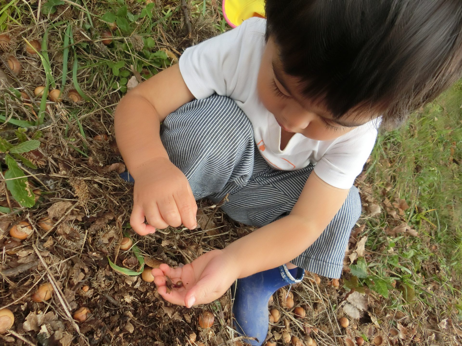 暑かった夏も終わり、季節は秋。ようやく過ごしやすくなってきて、大好きな戸外遊びもたっぷり楽しめるようになってきました。子どもたちは、毎日好きな遊びを見つけ、のびのびと楽しんでいます。秋は、どんぐりや松ぼっくりなど魅力的なものも沢山あり、目を輝かせながら小さい手いっぱいに拾い集めている毎日です。