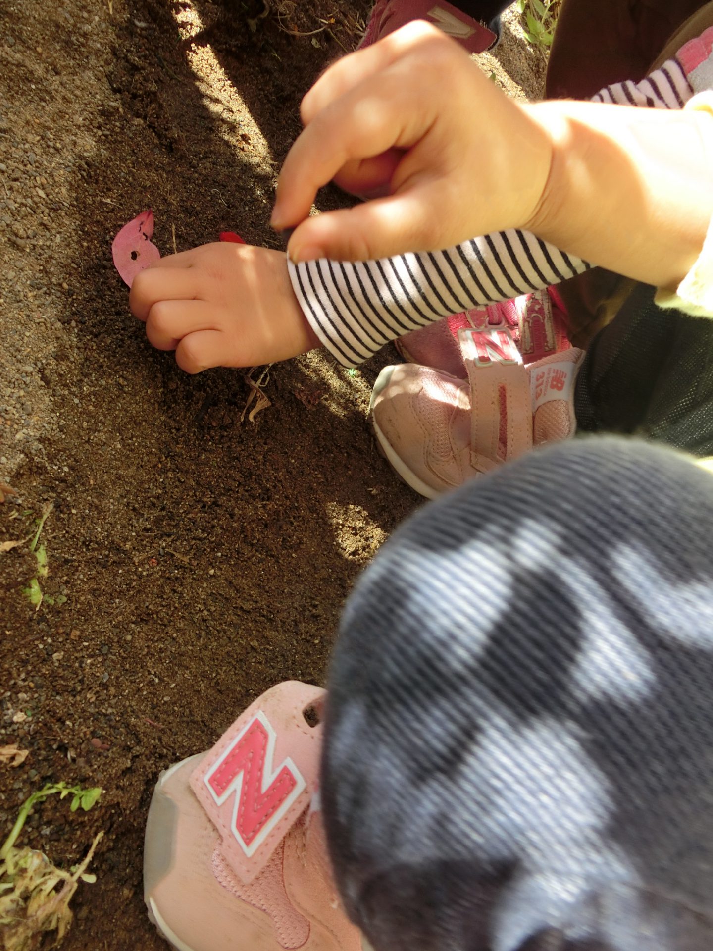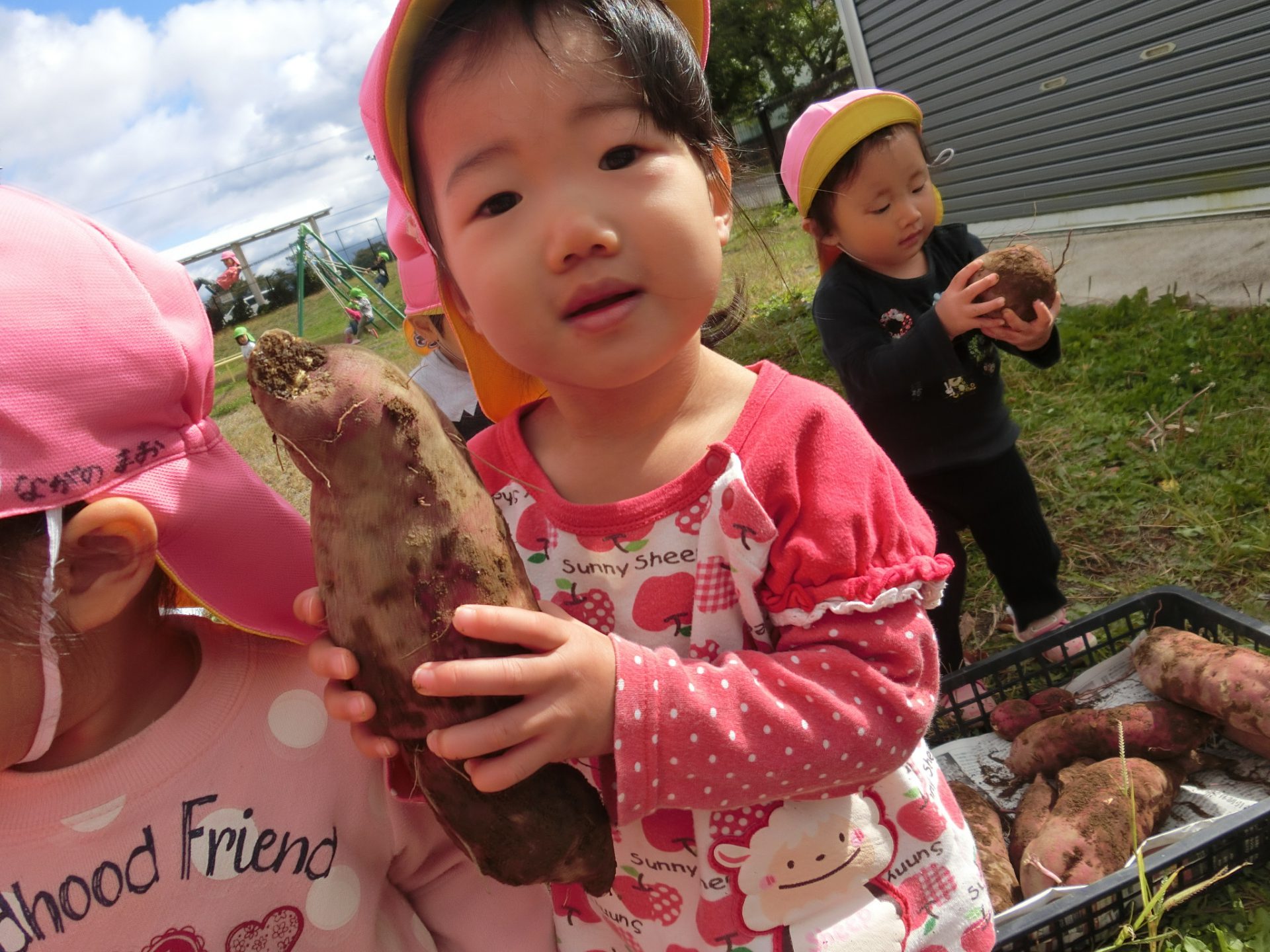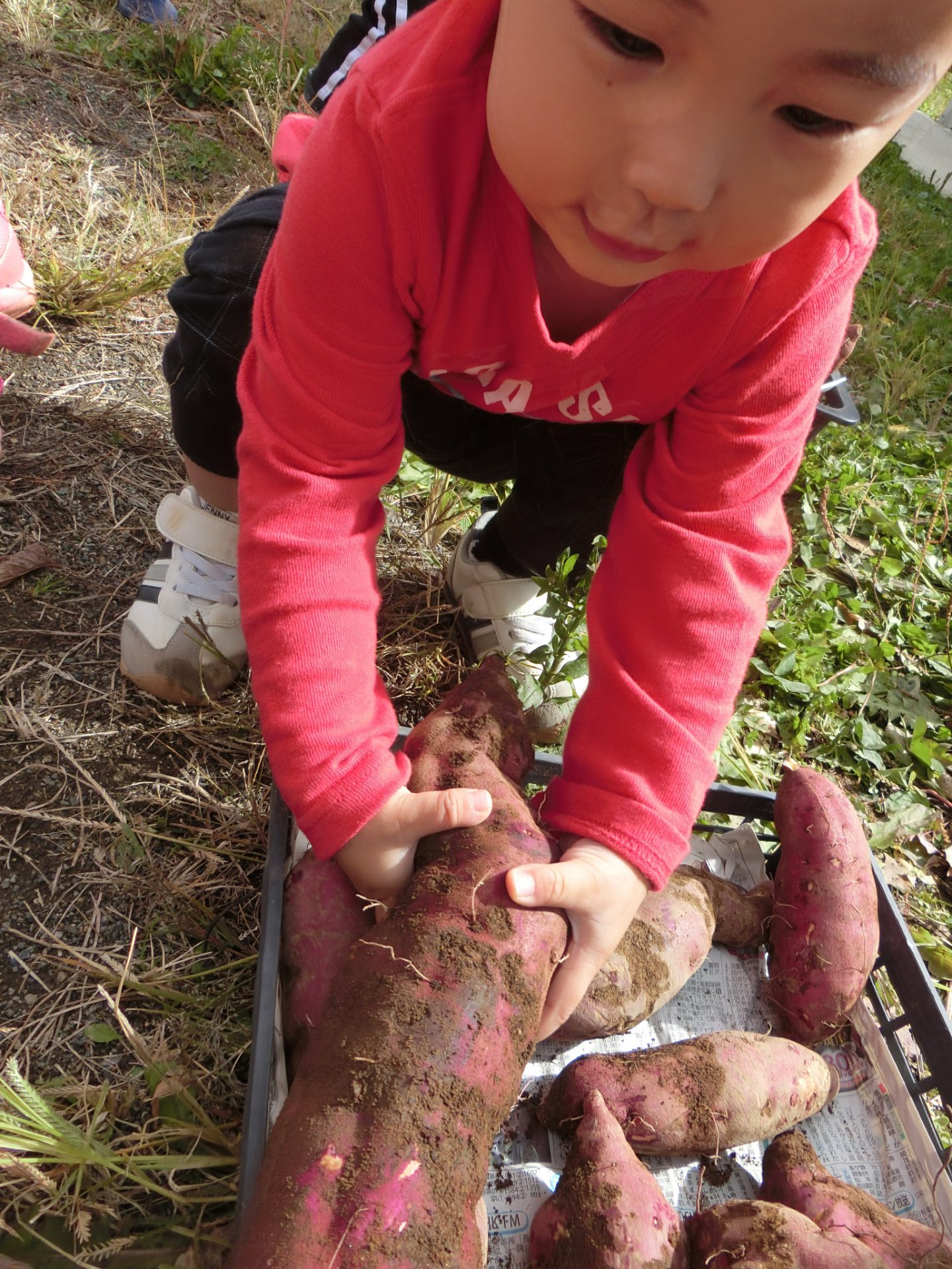 「おっきいね~」「いも!!」と何回も持ち上げてはおろしてを繰り返していた子どもたち。土がついた手もなんだか嬉しくて保育者ににここにこで見せてくれました。