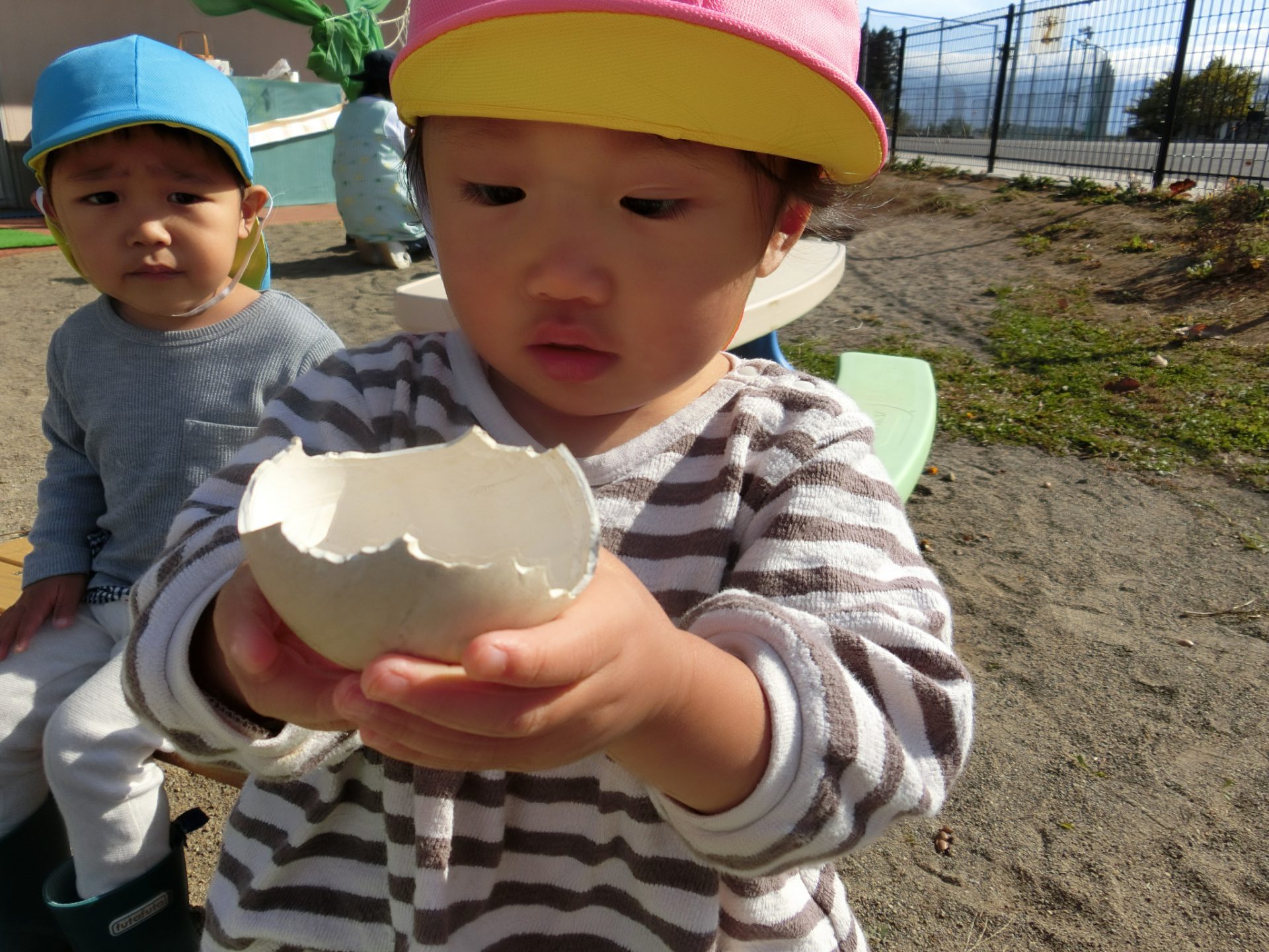 「あった~」「これ」「見て」と大切に1つずつ拾い集めています。中には、よーく吟味して割れているやつは、ぽい!と捨てて割れていないものを拾う子も。どう頑張っても1歳児の子どもの手なら2~3個が限界ですが、〝もっと欲しい。けど、自分で持ちたい。〟と葛藤中。拾っては落として、落ちたのを拾おうとして他のも落ちて…根気よくチャレンジしています。
