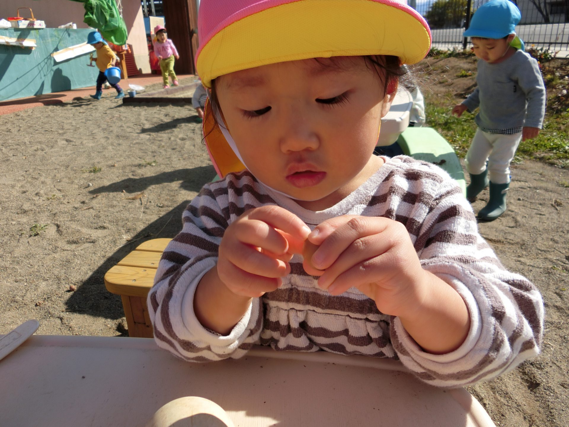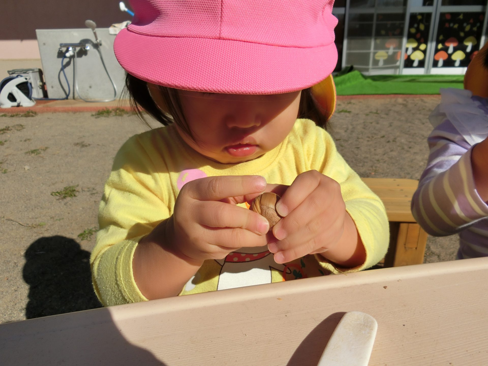 持って帰ってきたどんぐりは、「どっーち」とどっちの手に入っているかゲームをしたり、おままごとの材料にしたり、ころころ転がしたりして楽しみました。そして、最近のブームは「どんぐりの殻むき」。