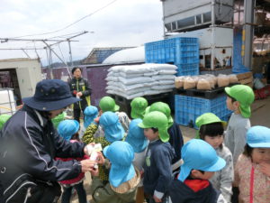 土とお米の種を混ぜ合わせ、苗床に敷き入れる作業の真っ最中だったようで、詳しくお話をしてくださり、子どもたちも質問をしながらよく聞き入っていました。