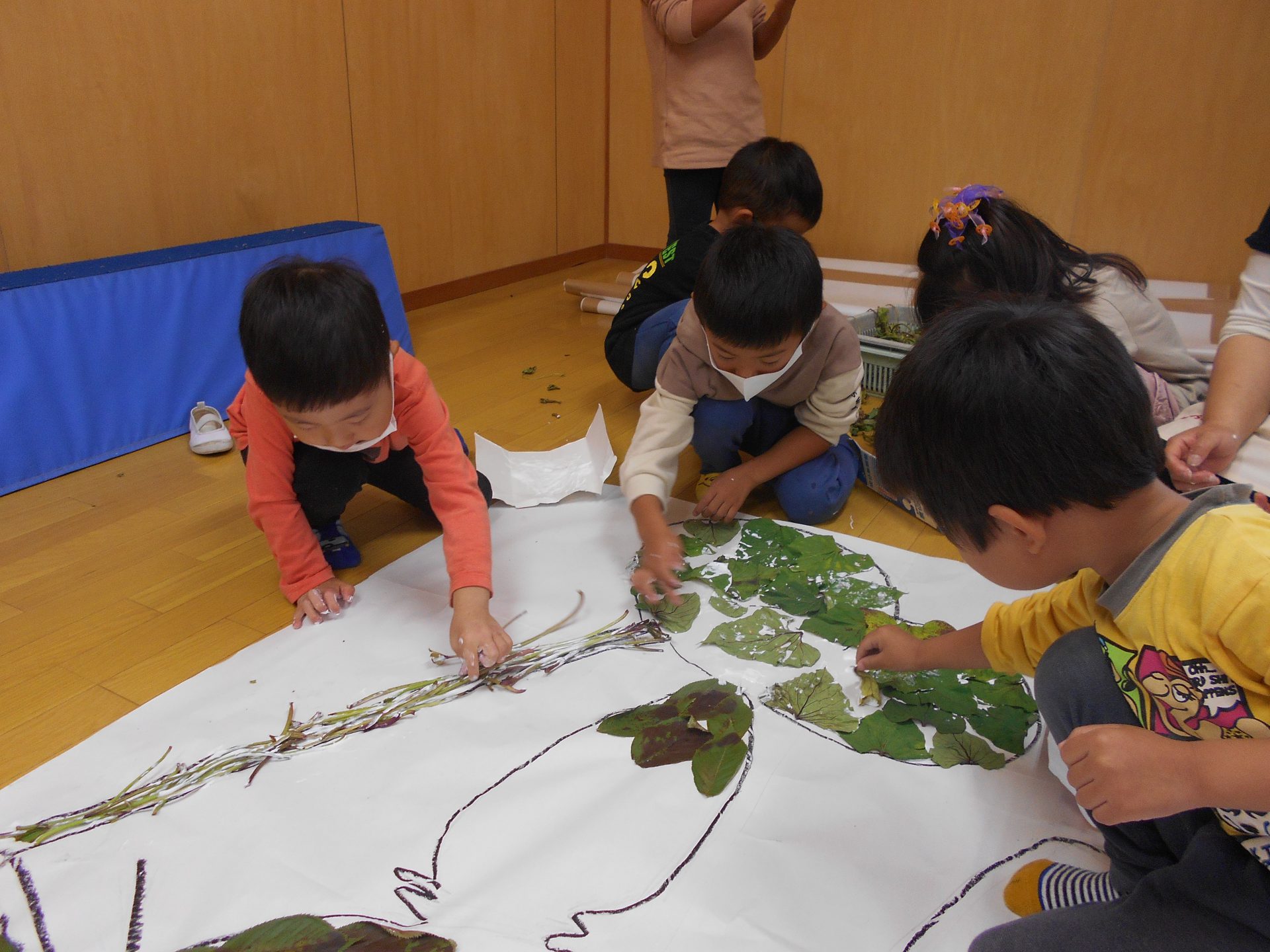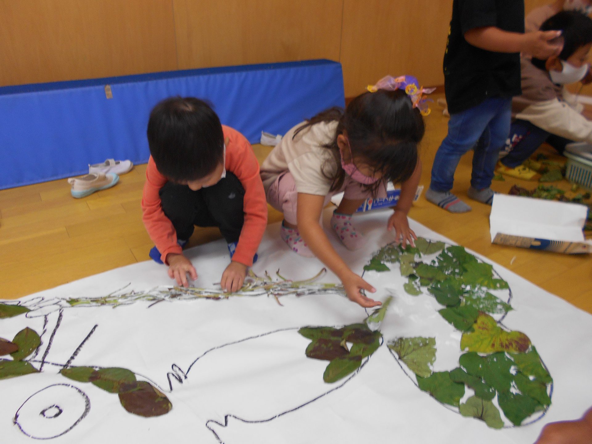 ・秋の自然物(落ち葉)を使って何か(動物など)をイメージして作りたいなと思い、何をつくるか悩んだ所年中が6人のため、何か大きいものを一つみんなで作りたいということでなじみのあるトトロに決めました。