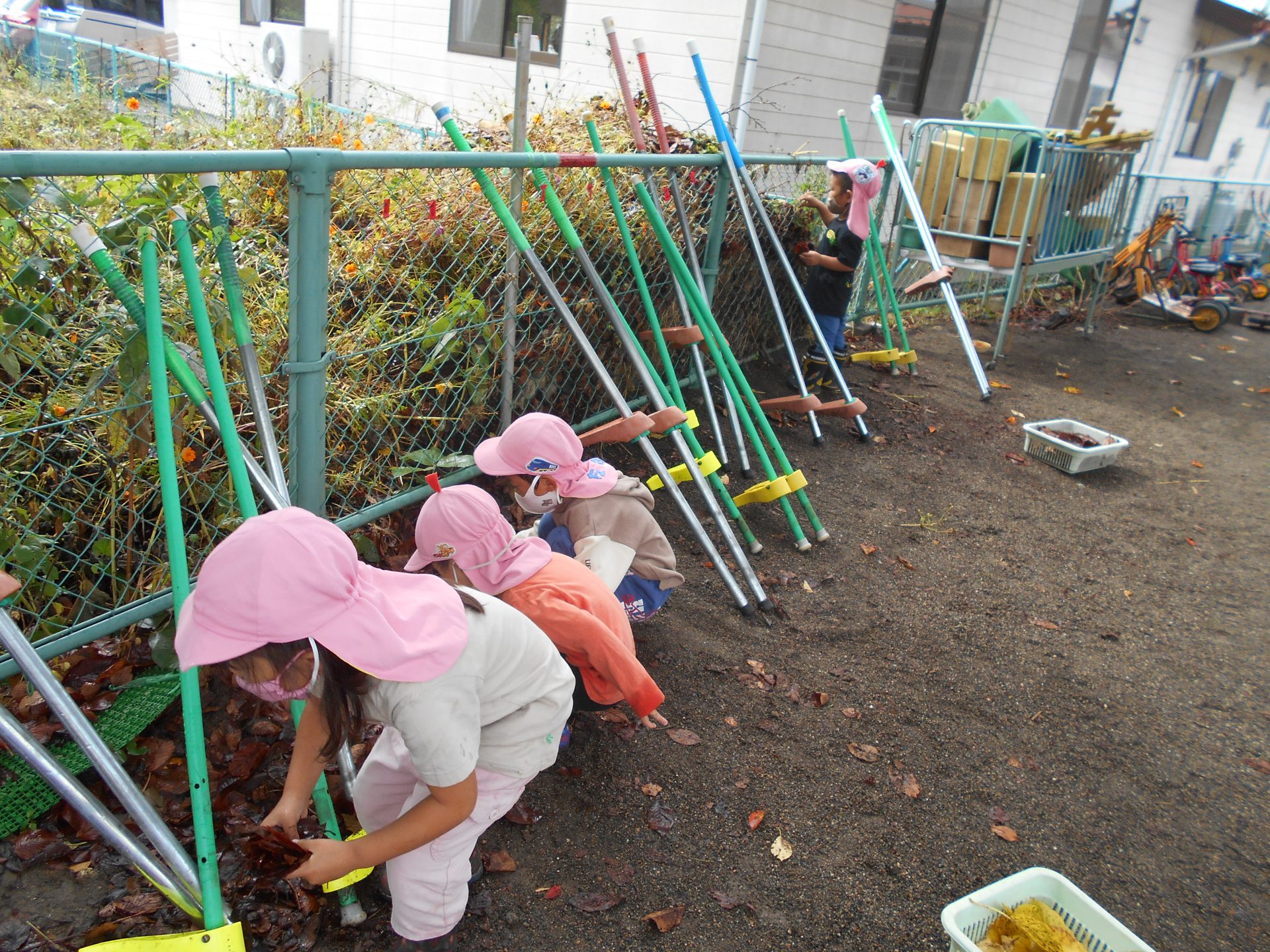 保育園に落ちている落ち葉を集めて、みんなでおっきなトトロを作るぞ~!!