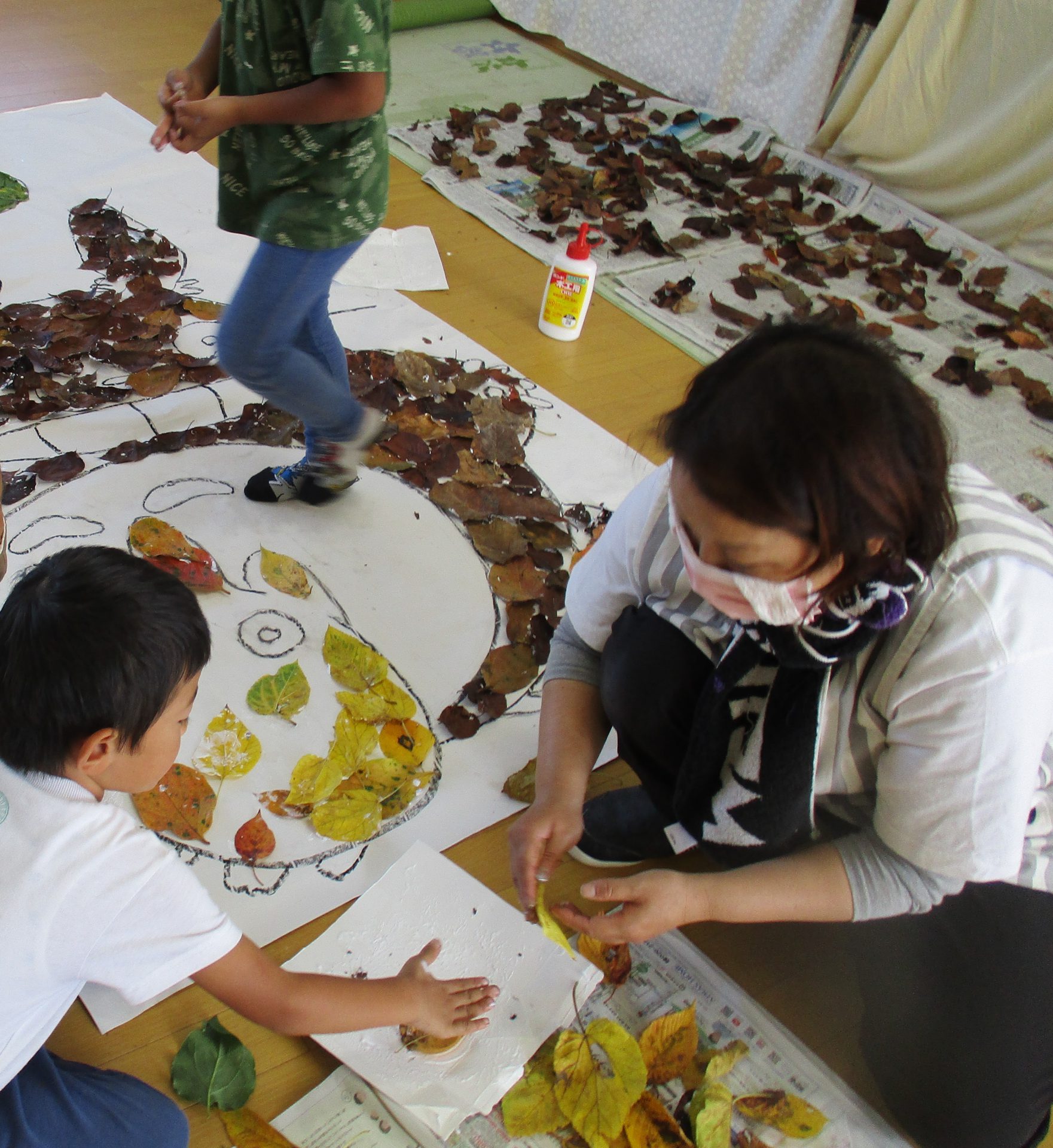 落ち葉をトトロの白いところが見えなくなるまで貼るのは、子どもたちも少し大変そうでしたが完成したトトロを子どもたちと見た時の達成感は大きかったです。どこにでもある落ち葉を存分に使って、かわいいトトロを作り切った達成感を子どもと一緒に味わうことができました。