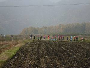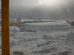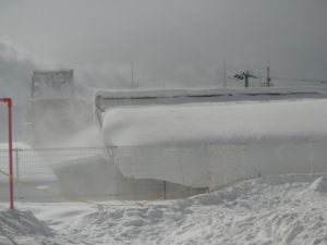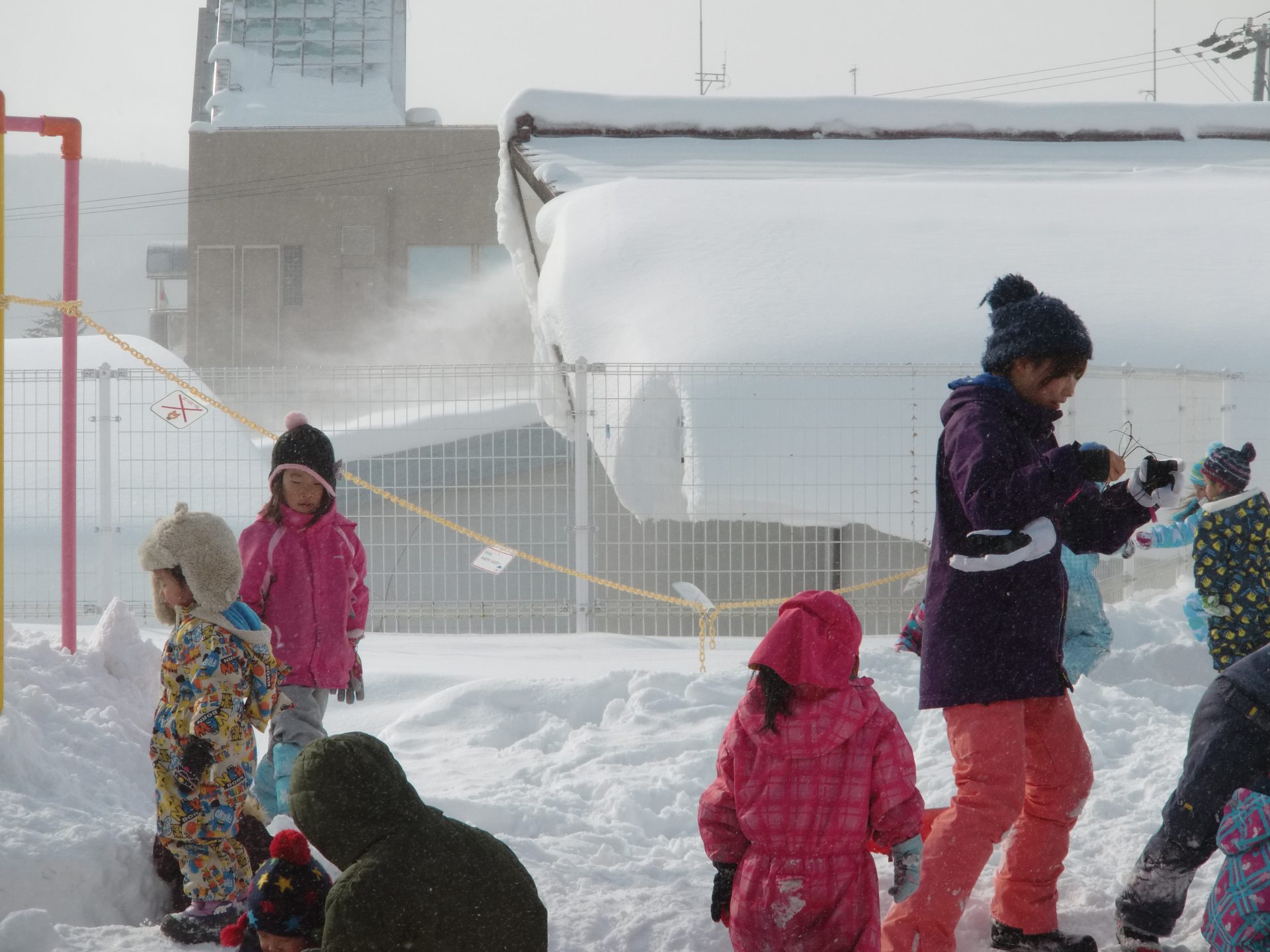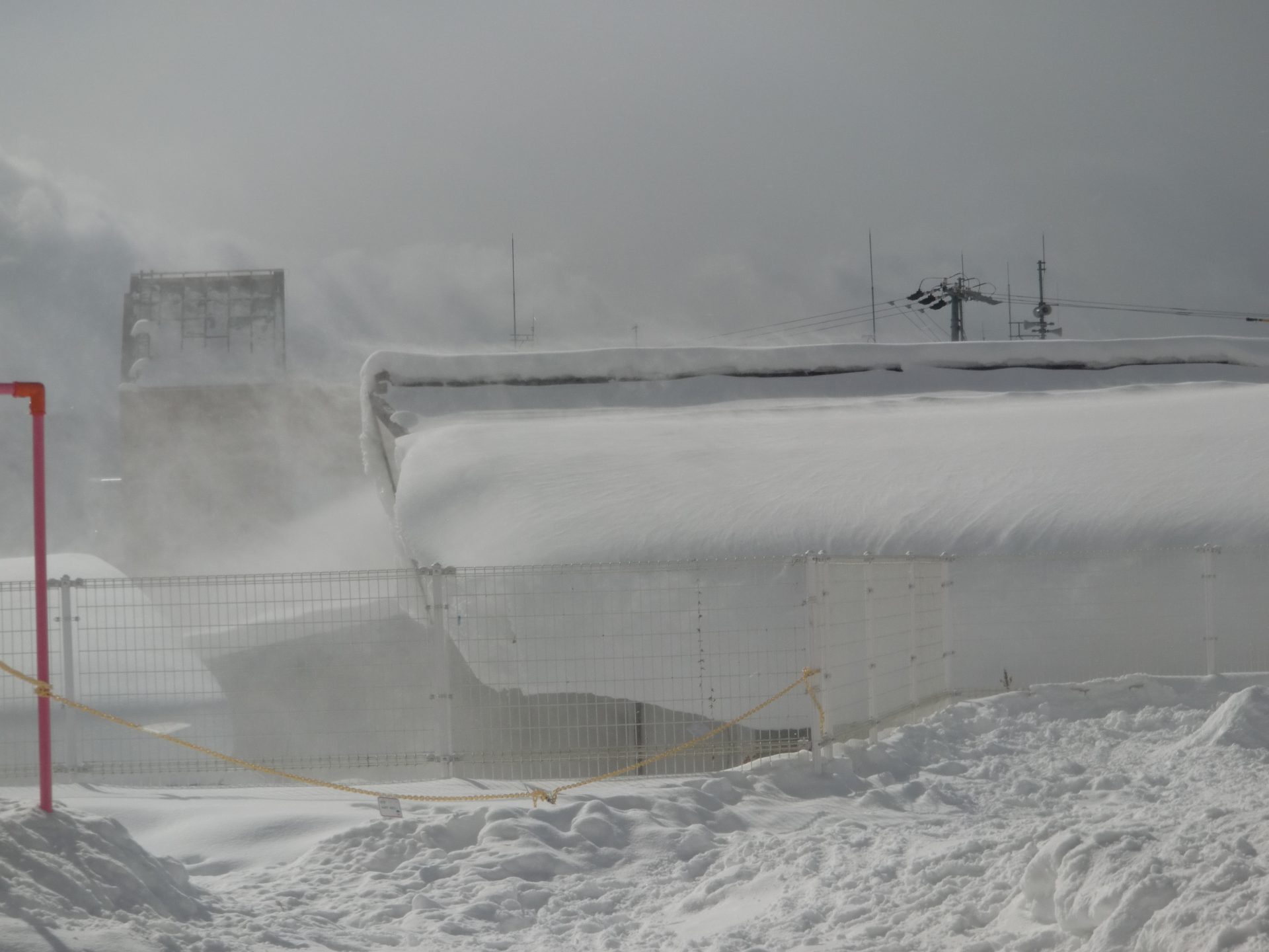 この日は朝から地吹雪。戸隠では、天気の変わり目に強い風が吹きます。「うひゃ~!」と言いながらも外に出ちゃいます。「こんな風、へいっちゃら!」
