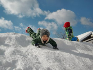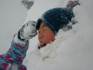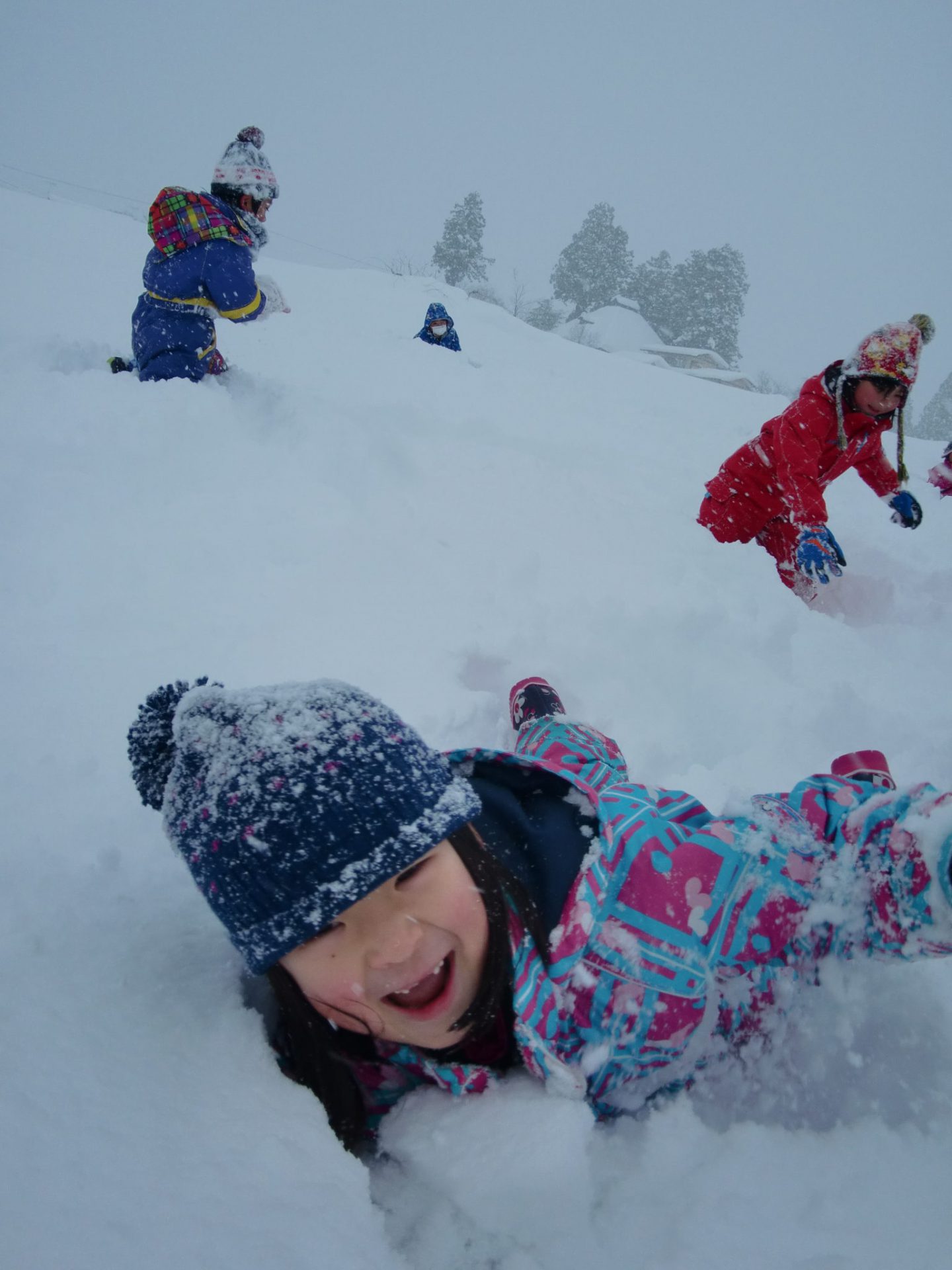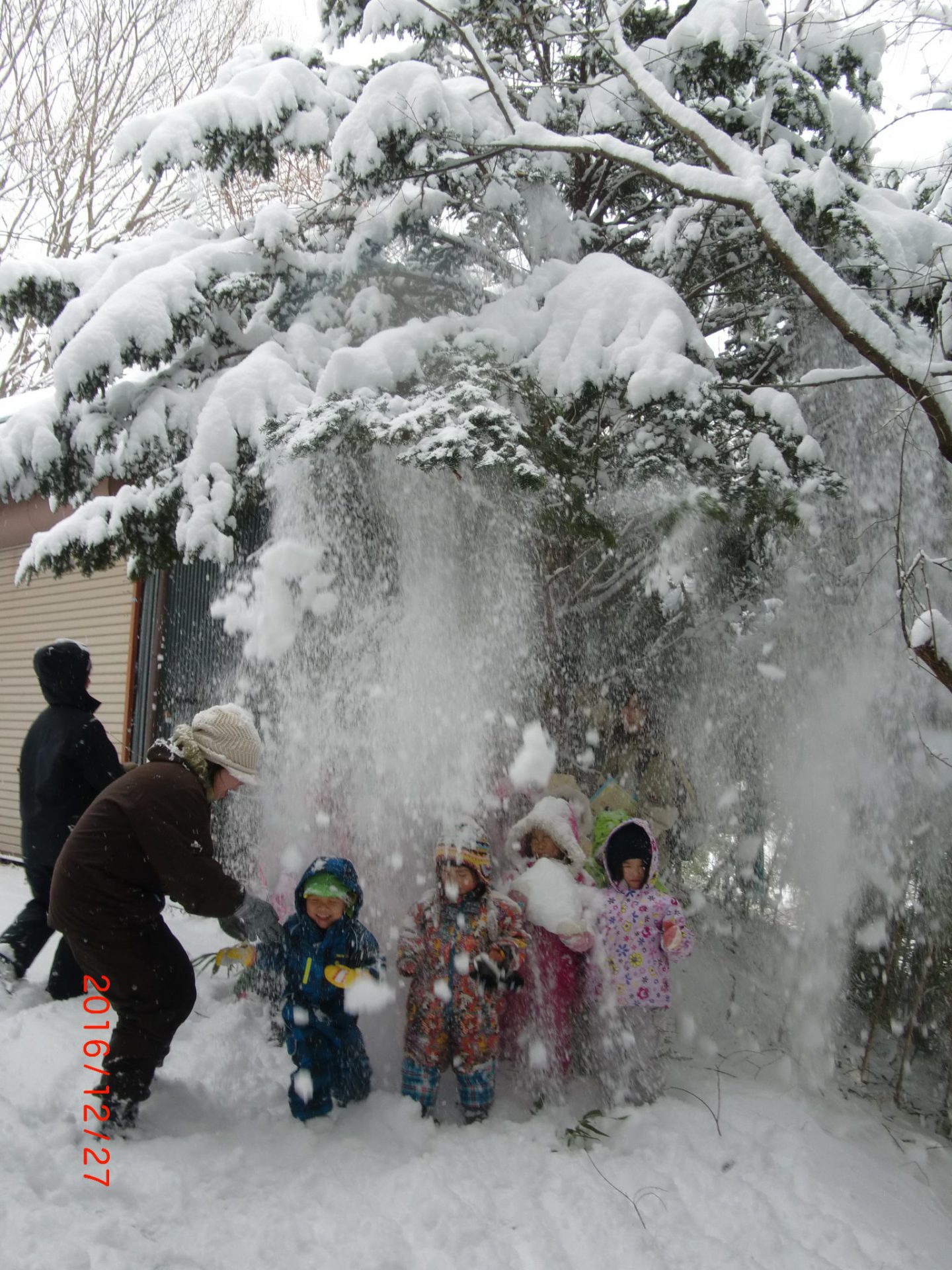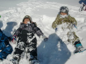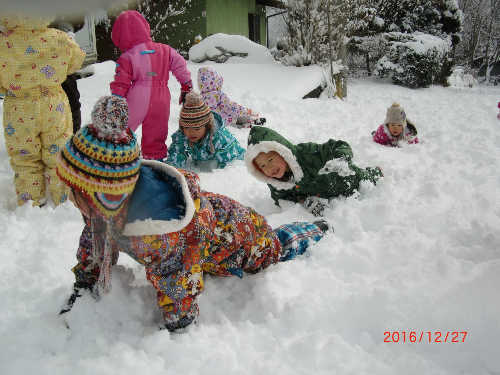 雪がそこにあるだけで、子どもたちは遊べますね。寝転がって、泳いで、埋まって・・・この「雪かぶり」がめっちゃ楽しい!「もっと~!」保育者は木を揺らす腕力も必要です。