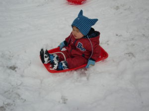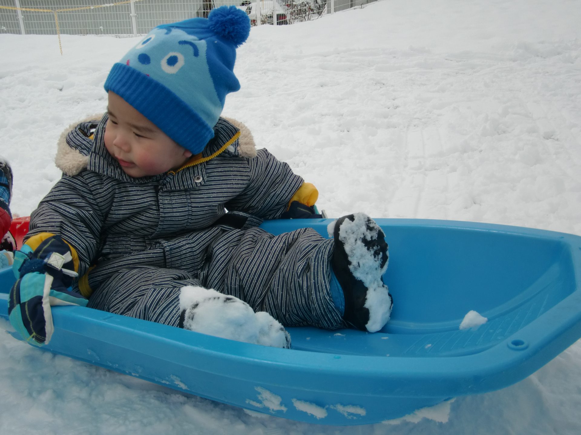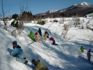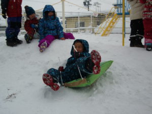 年長児は、肥料袋で作った「そり」をバランスを取りながら上手に乗りこなしています。