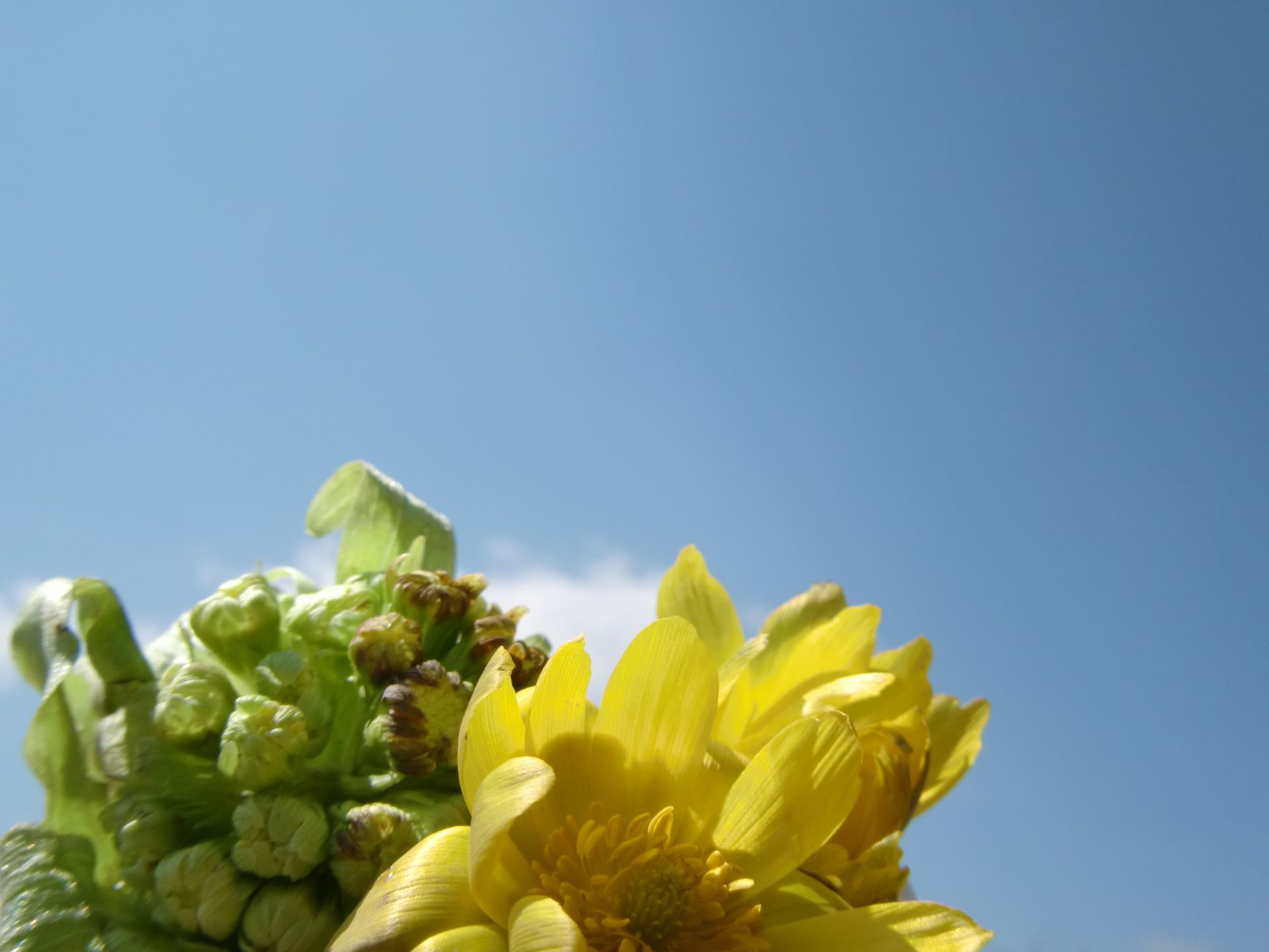 お散歩のお土産に、春の印が!でも・・着ているのはスキーウェアです。