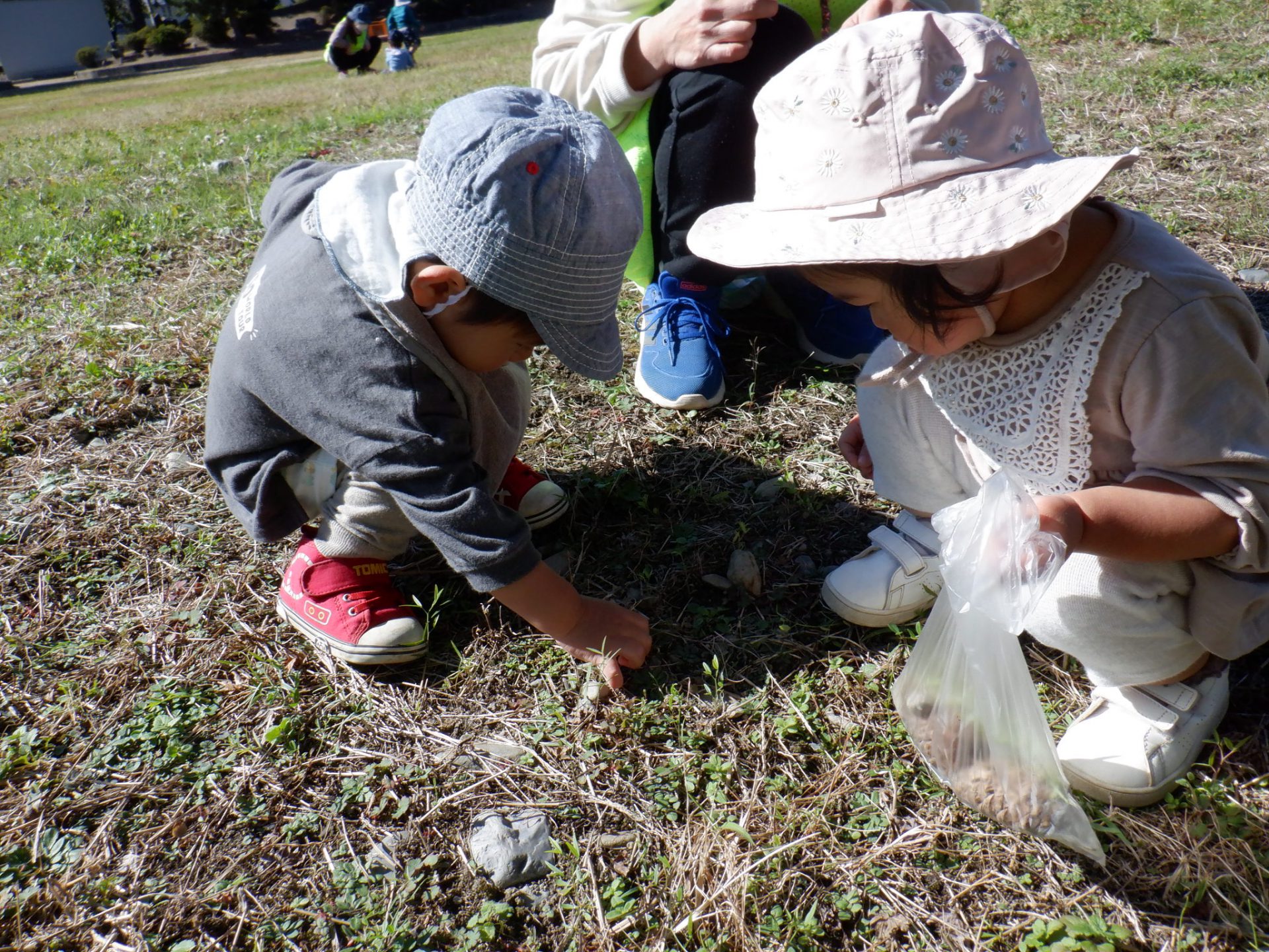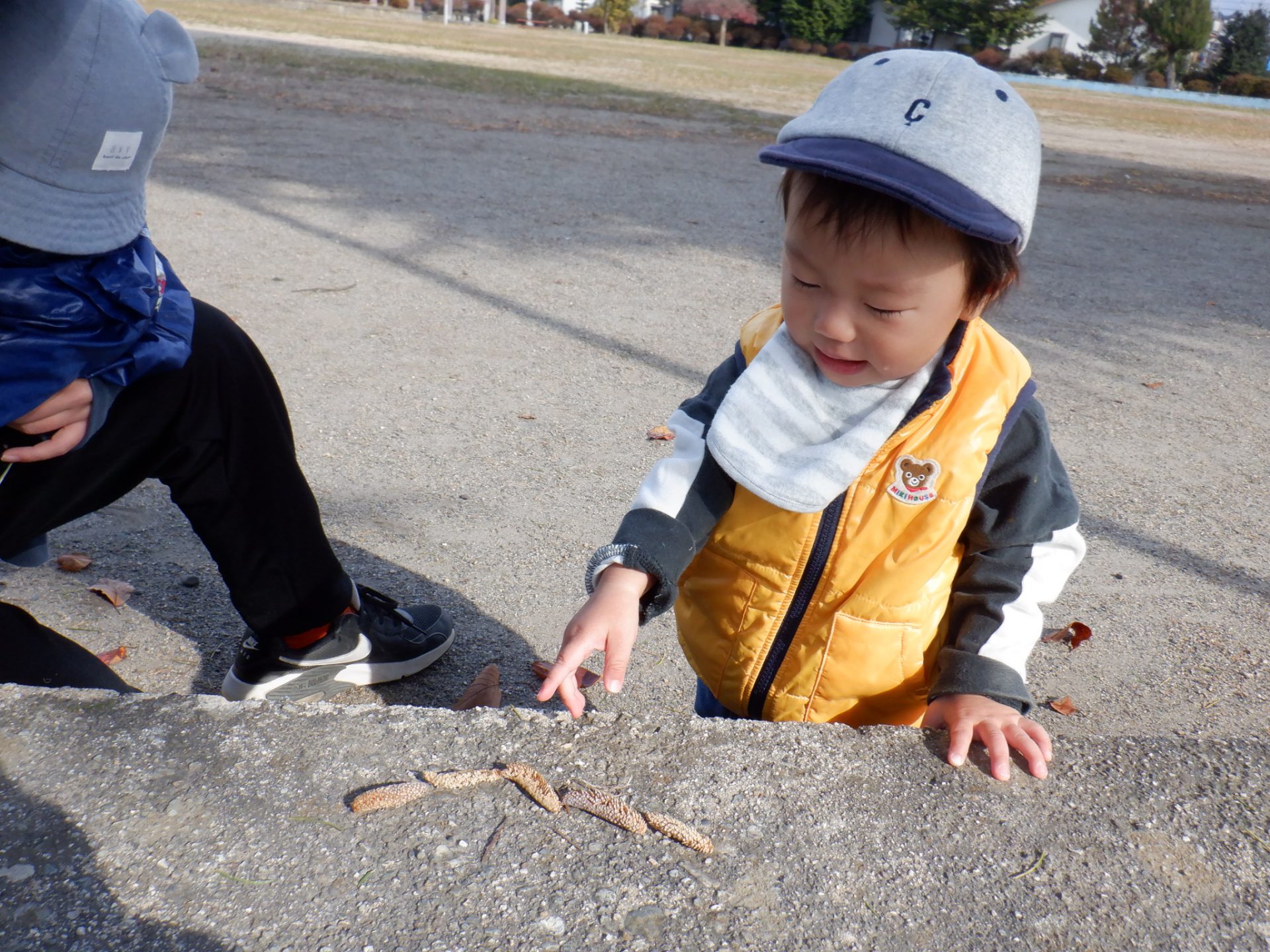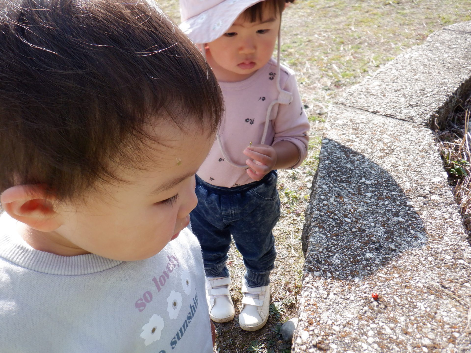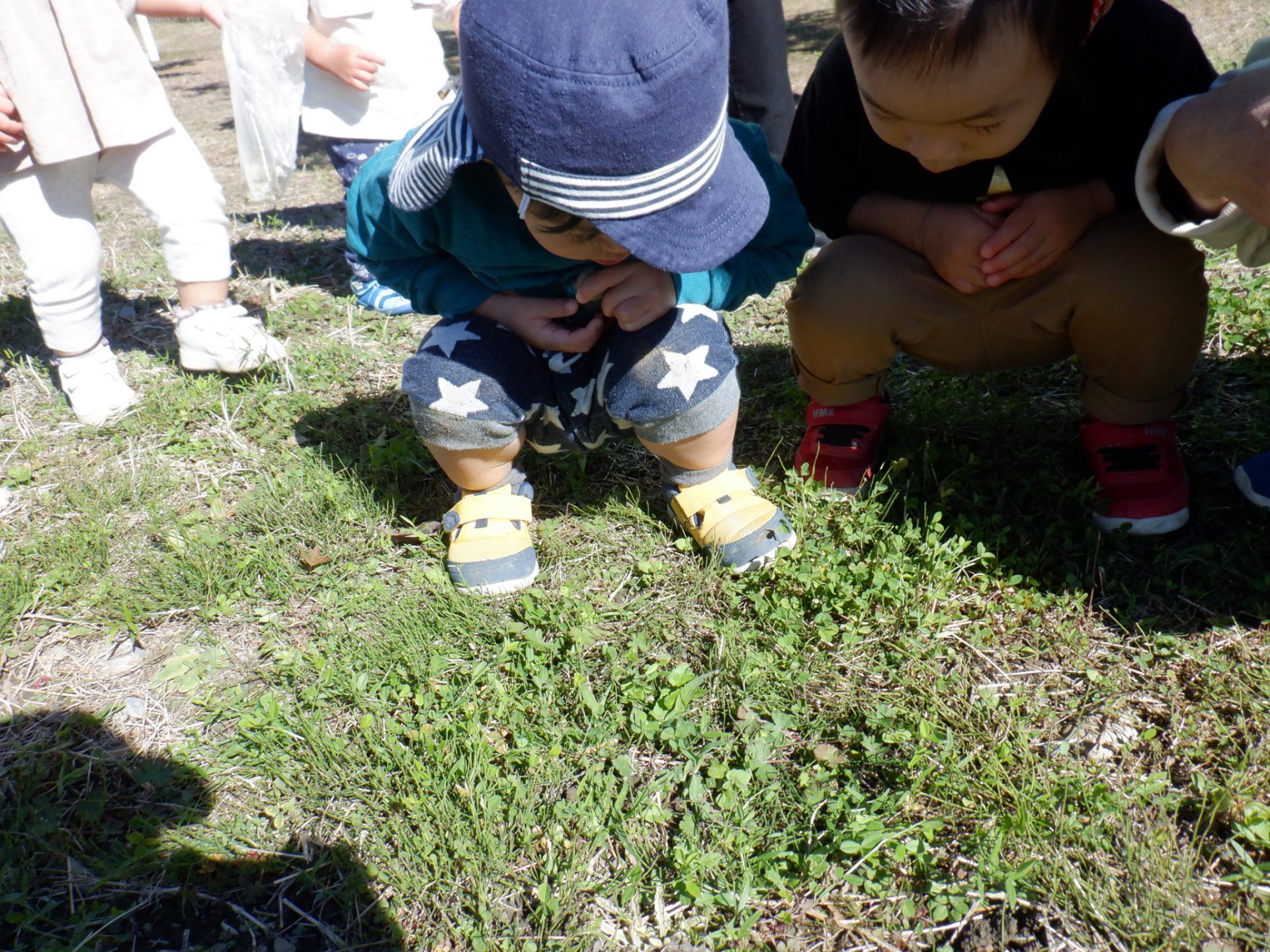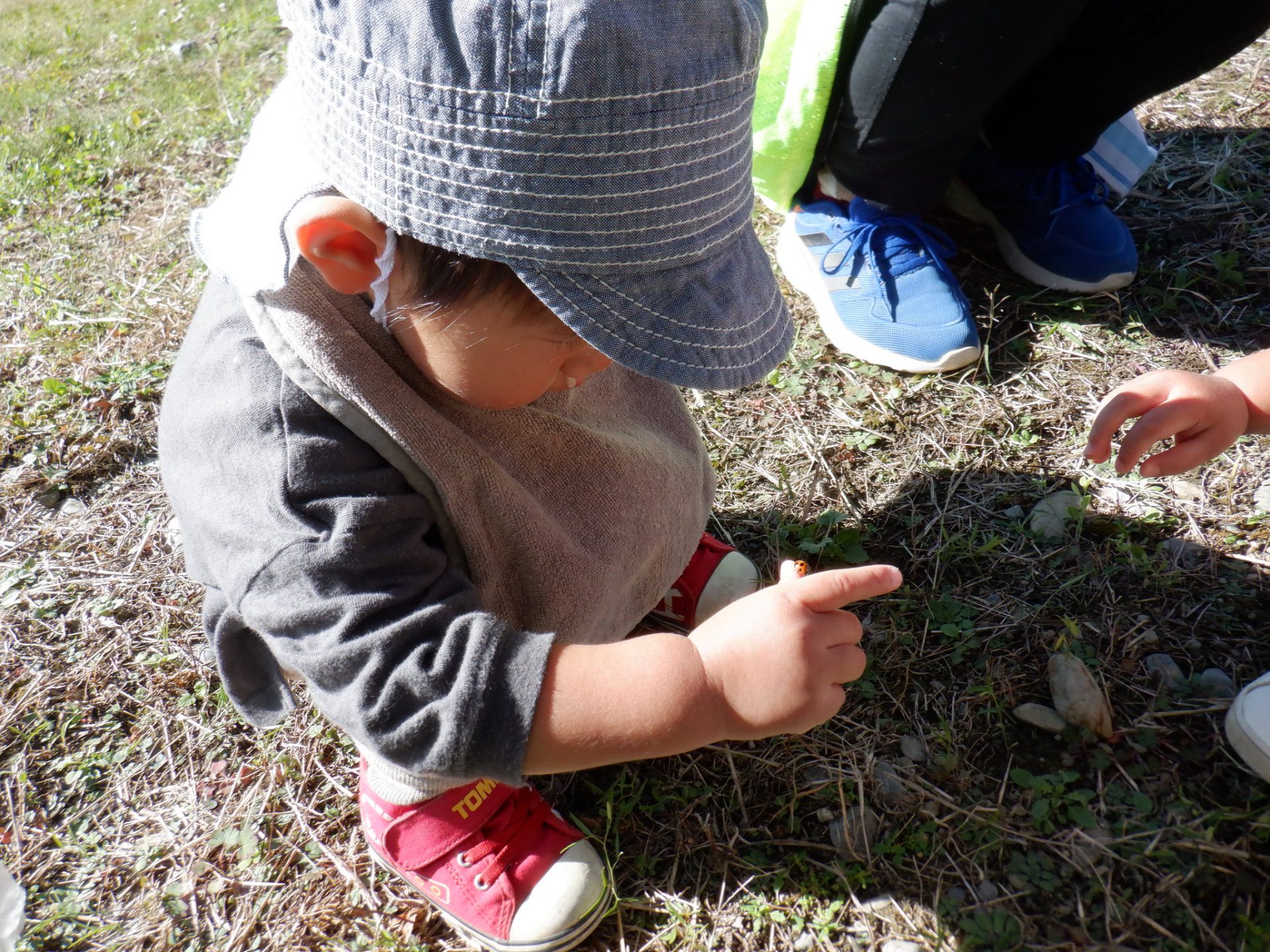道端には大きいねこじゃらしや花があり「ちょうだい」と気持ちを伝えてくる子どもたち。てんとう虫やバッタを見つけては「見る!」「見せて!」と大はしゃぎでした。普段の生活では出会えないものがたくさんあり、刺激を受けながら自然に触れて関わる姿は、生き生きとしています。そんな姿を見ると嬉しく思います。