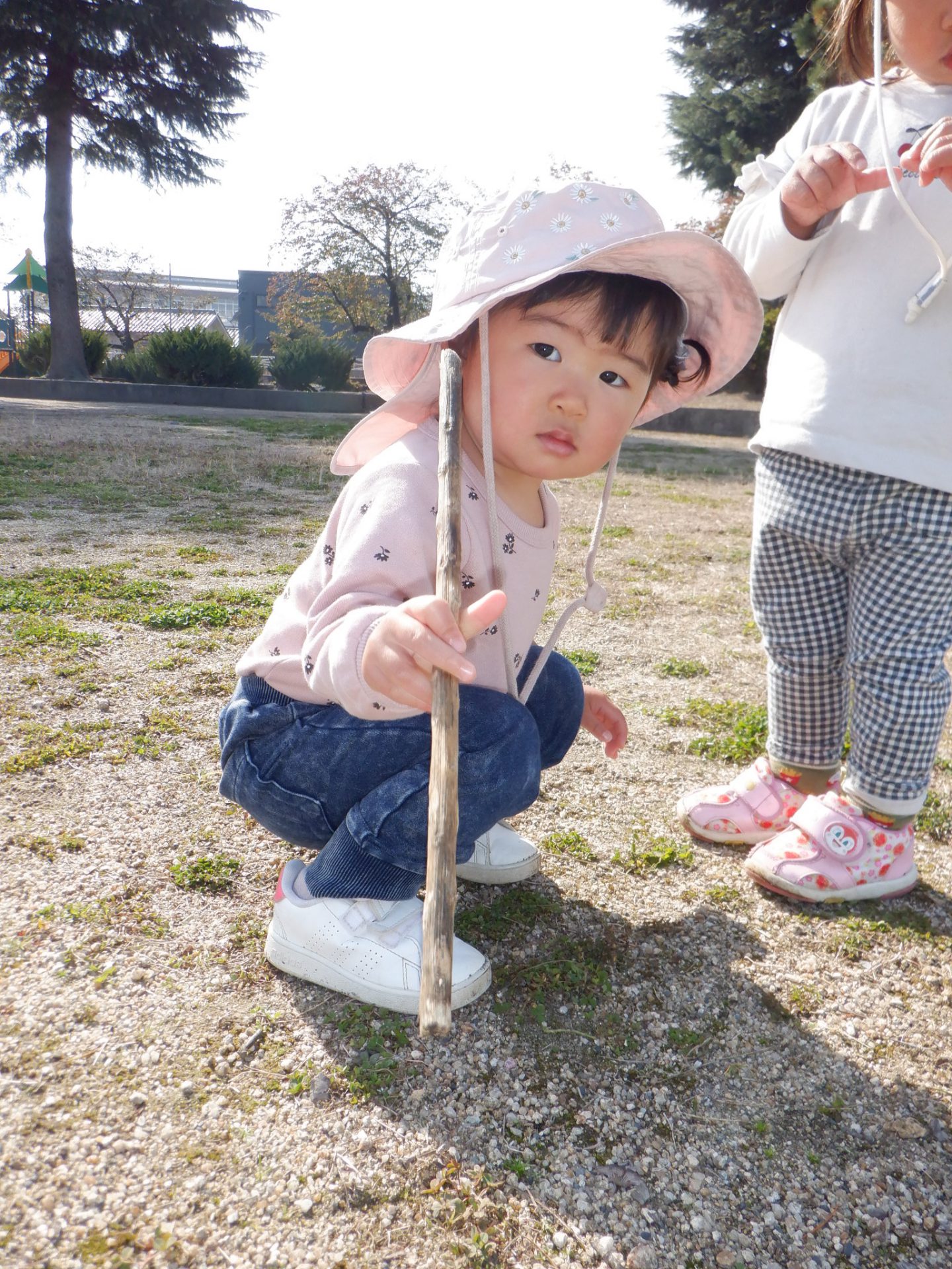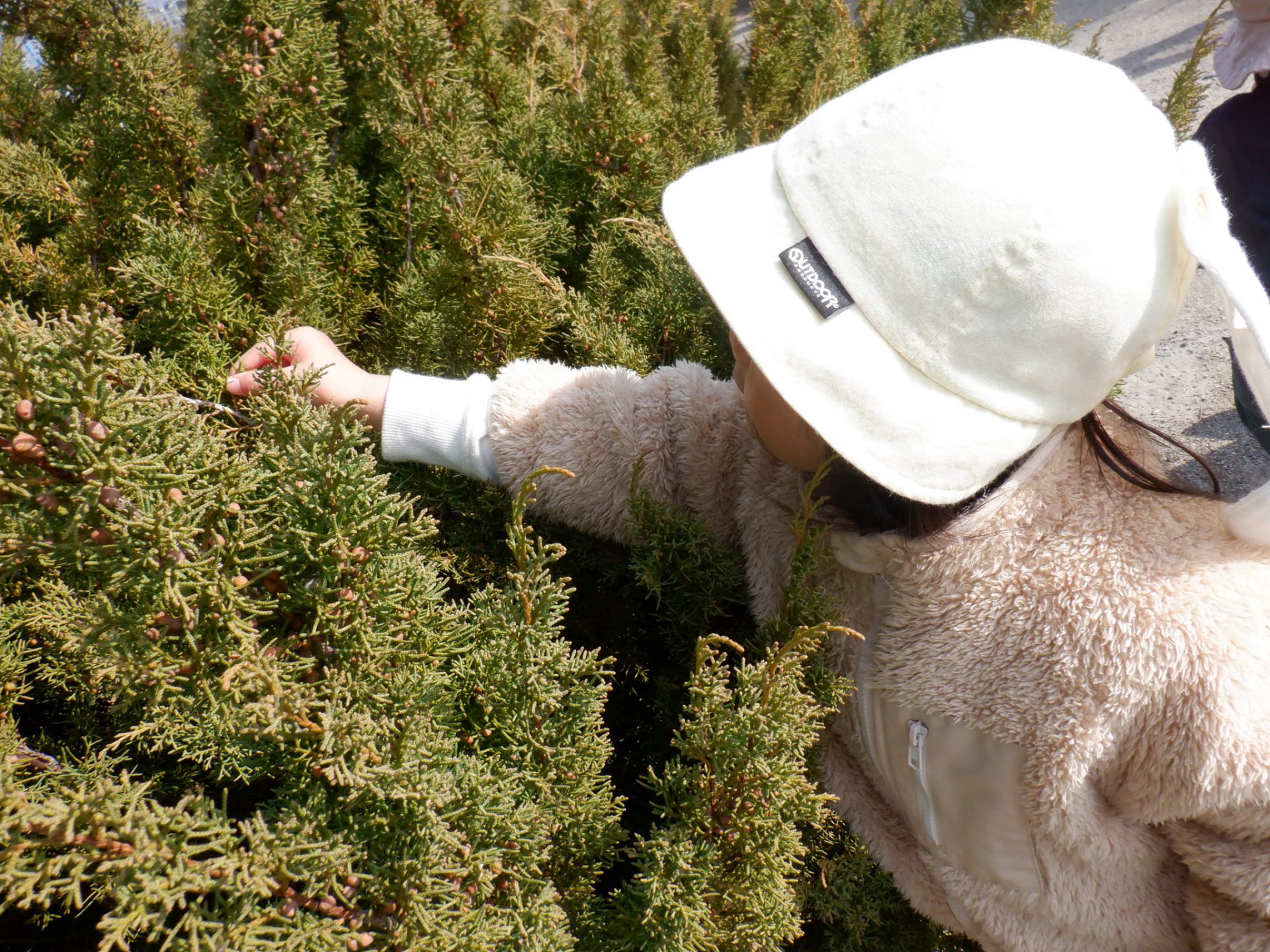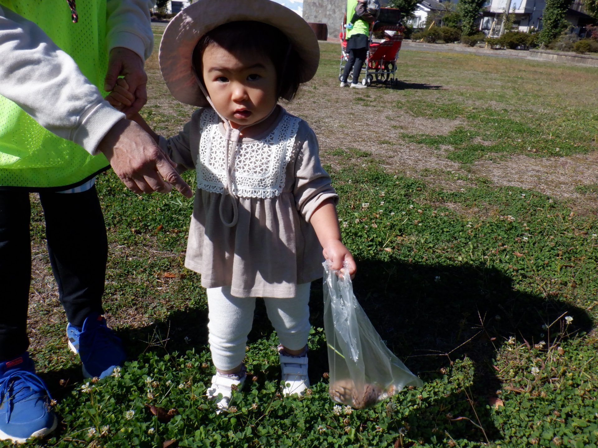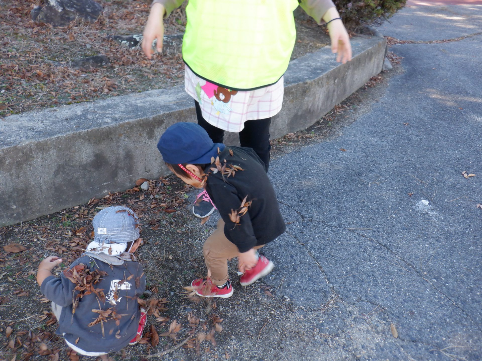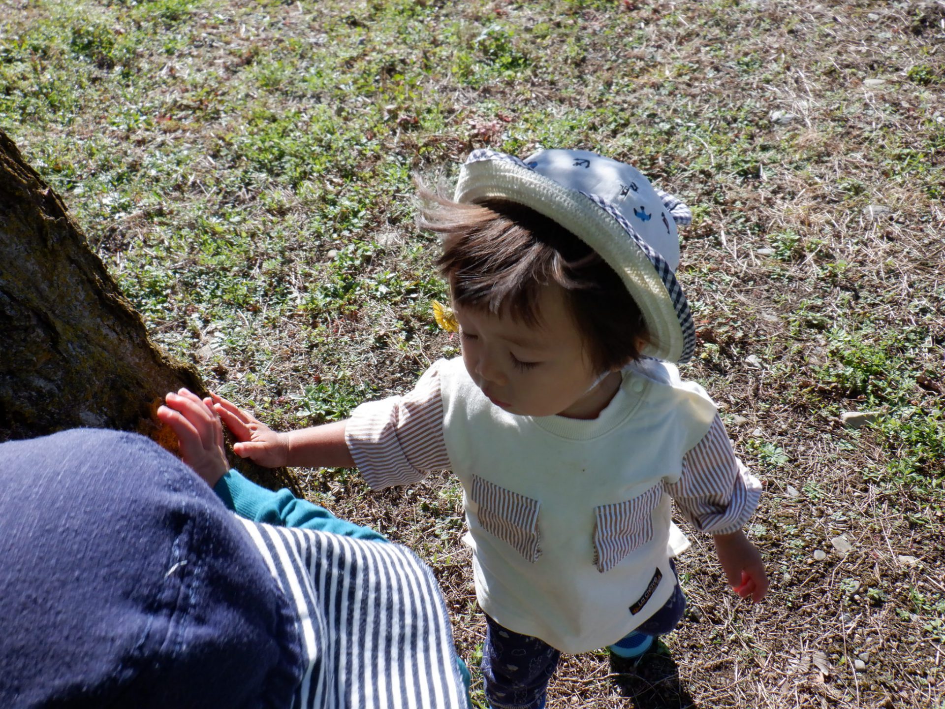 道端には大きいねこじゃらしや花があり「ちょうだい」と気持ちを伝えてくる子どもたち。てんとう虫やバッタを見つけては「見る!」「見せて!」と大はしゃぎでした。普段の生活では出会えないものがたくさんあり、刺激を受けながら自然に触れて関わる姿は、生き生きとしています。そんな姿を見ると嬉しく思います。