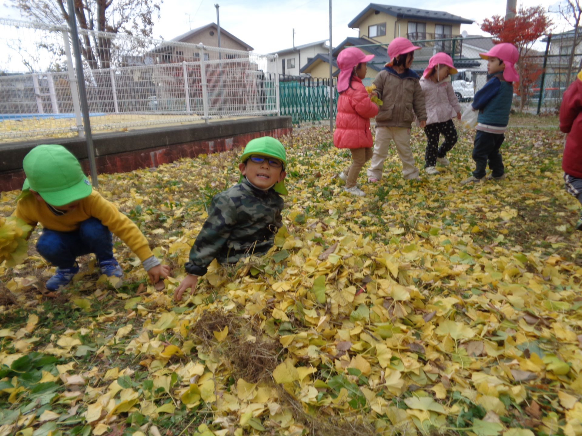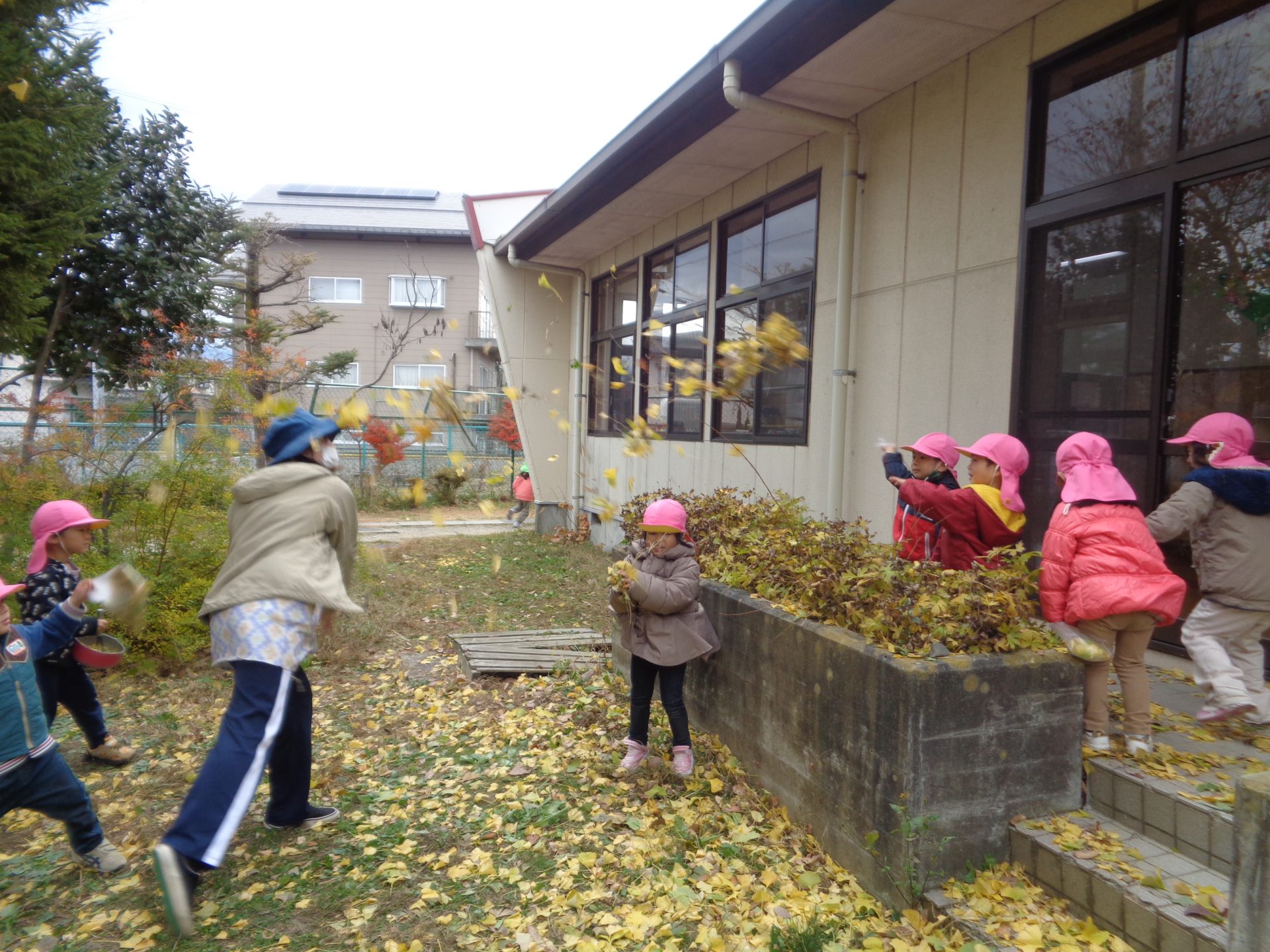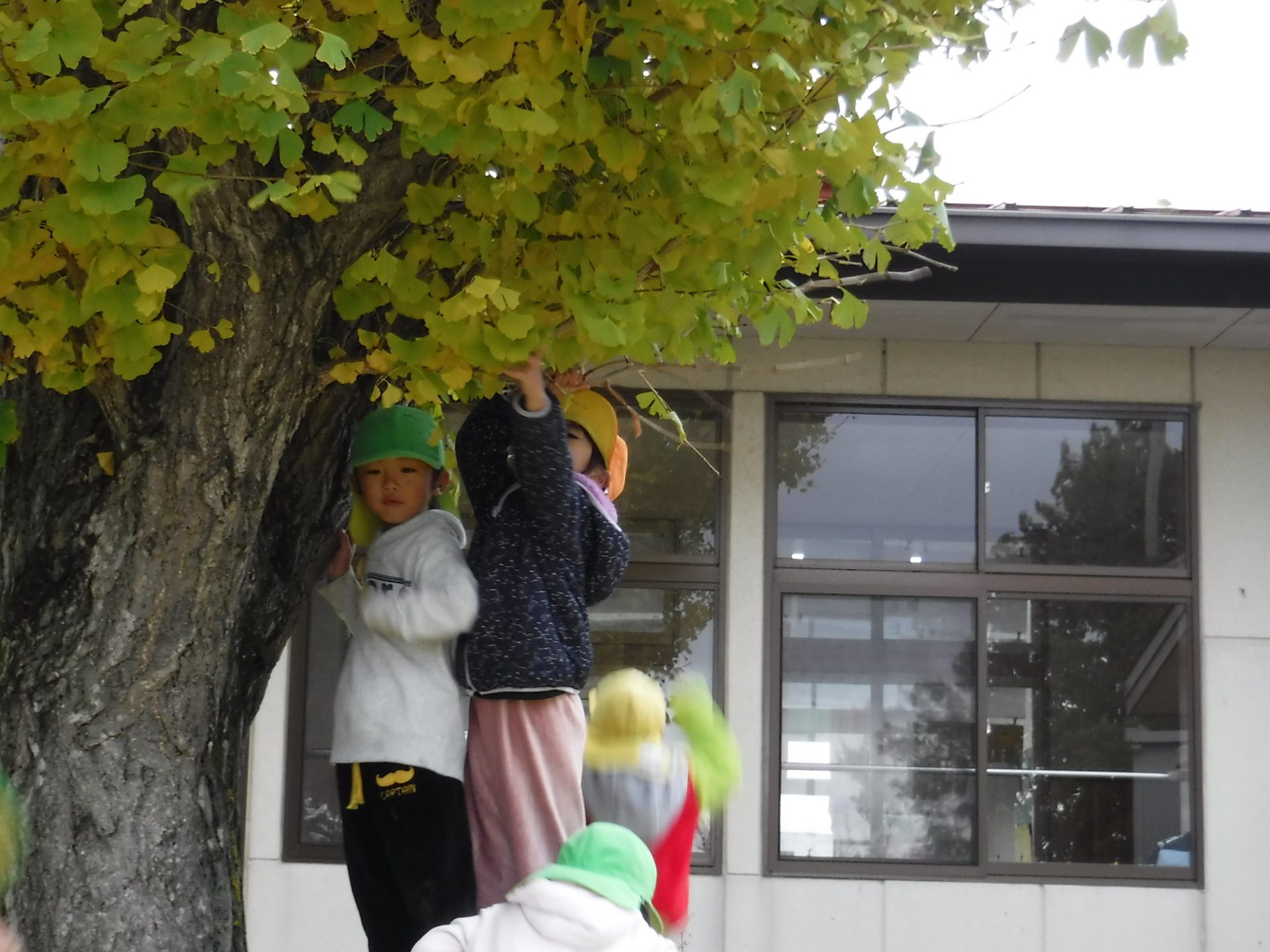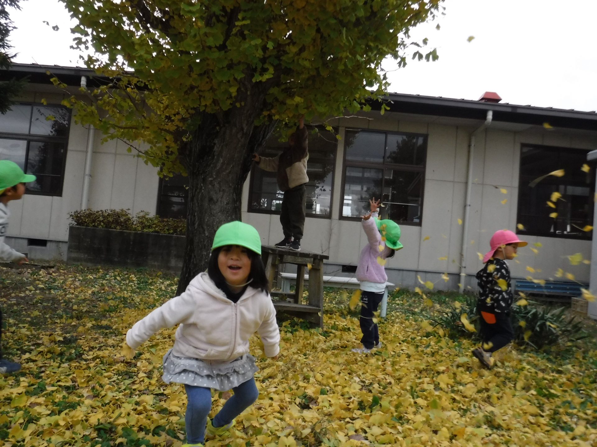 園庭のイチョウの木が黄色く色づき、落ち葉がたくさん!これはもう遊ばなくちゃ!