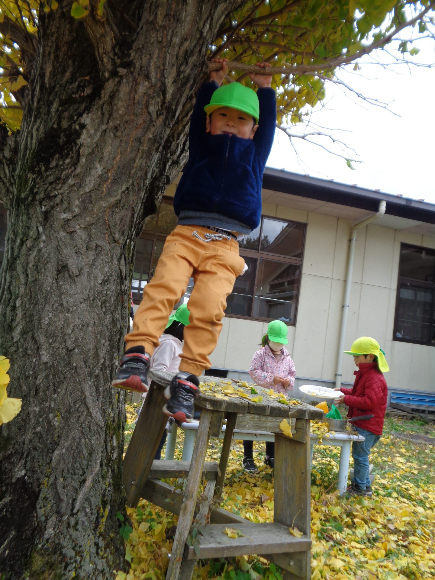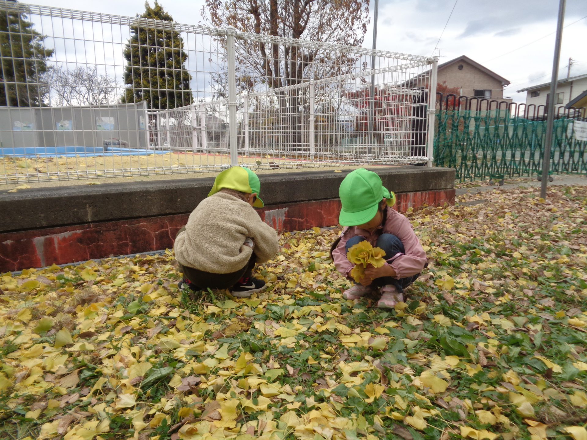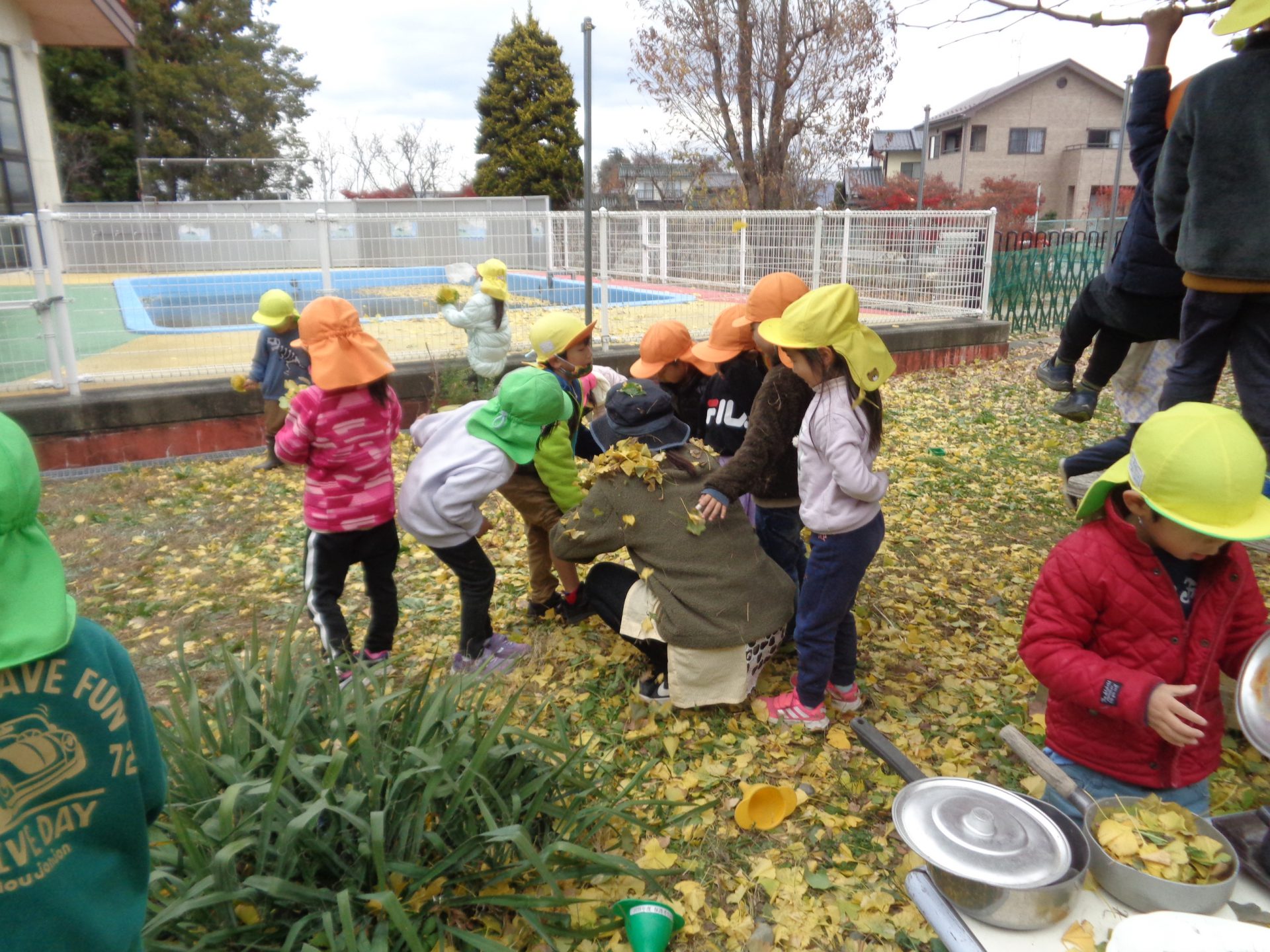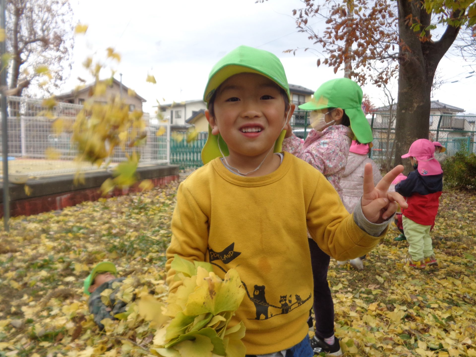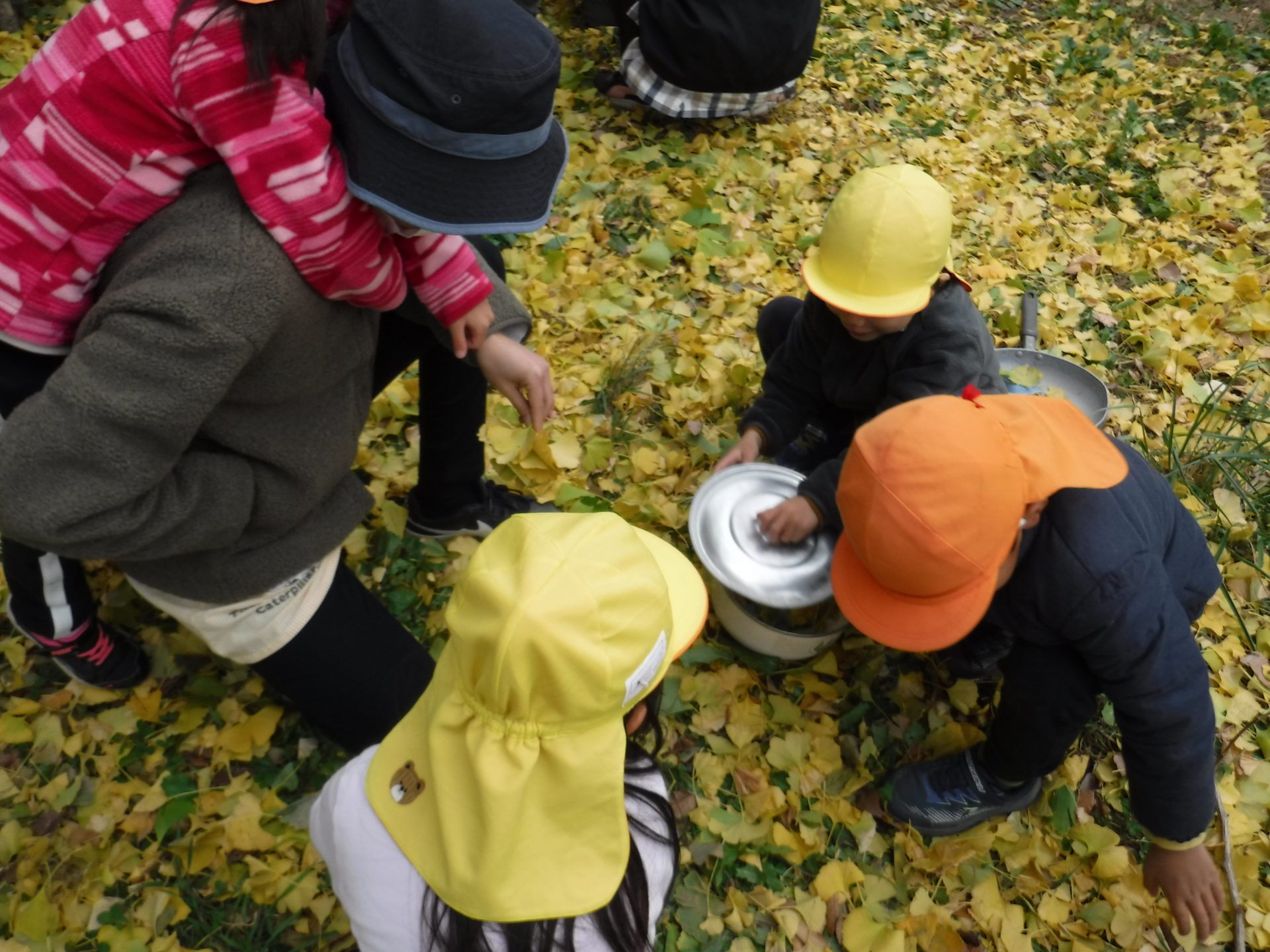 園庭のイチョウの木が黄色く色づき、落ち葉がたくさん!これはもう遊ばなくちゃ!