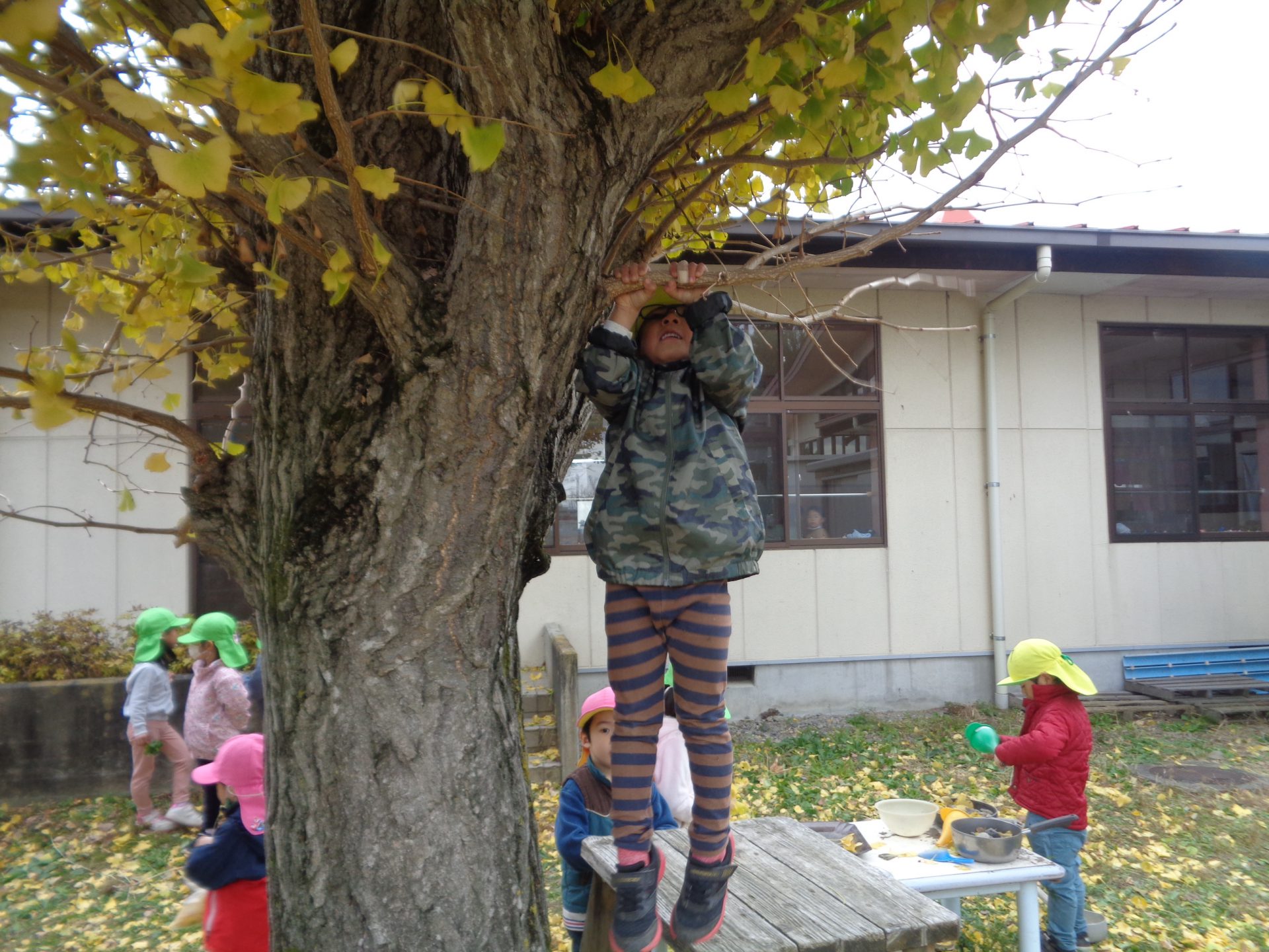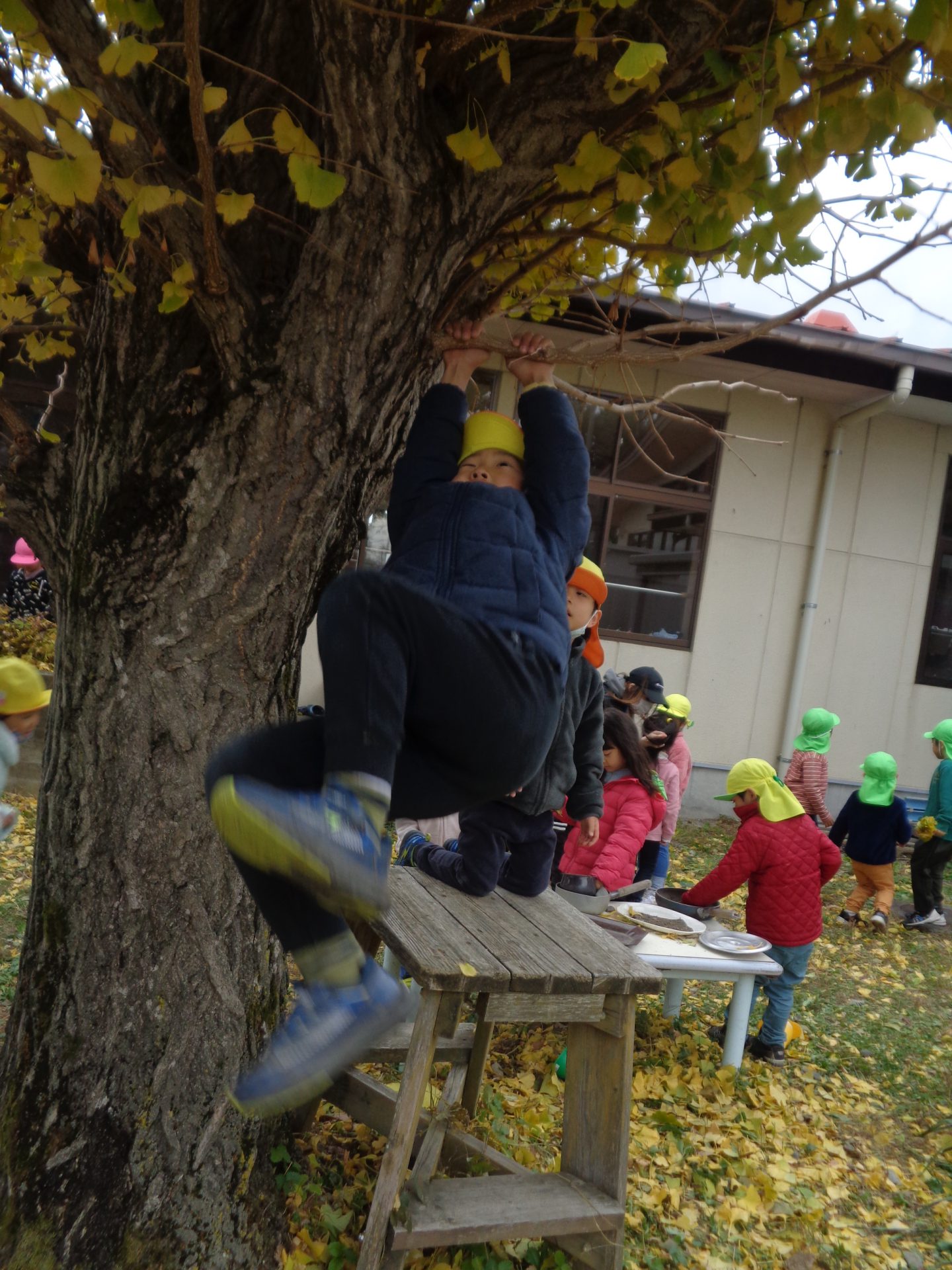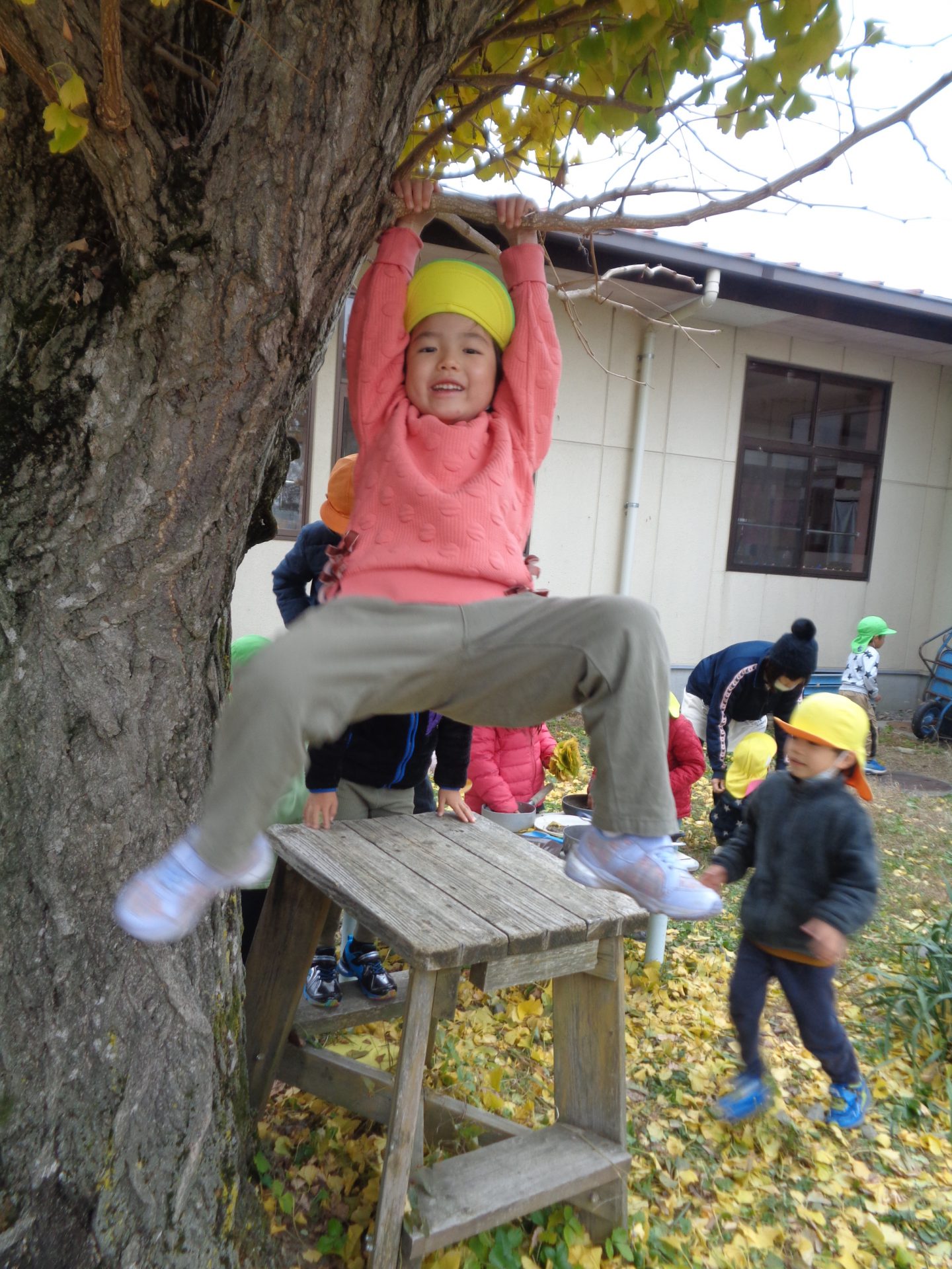 裏庭のいちょうの木の幹に一人の子がぶら下がってみました。見ていた他の子も「やってみたい!」
