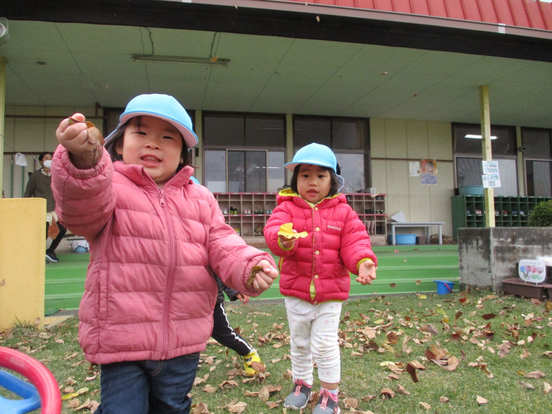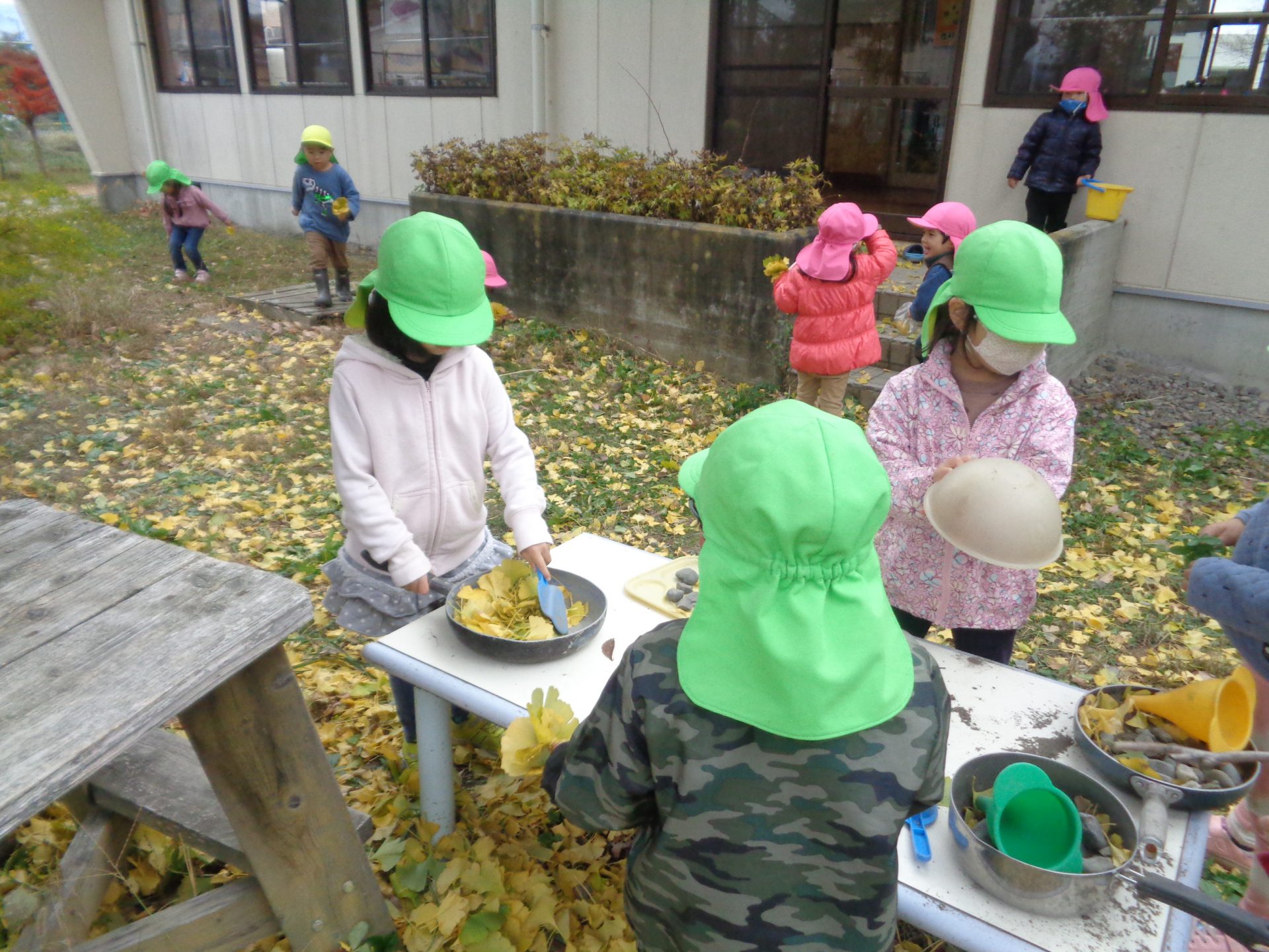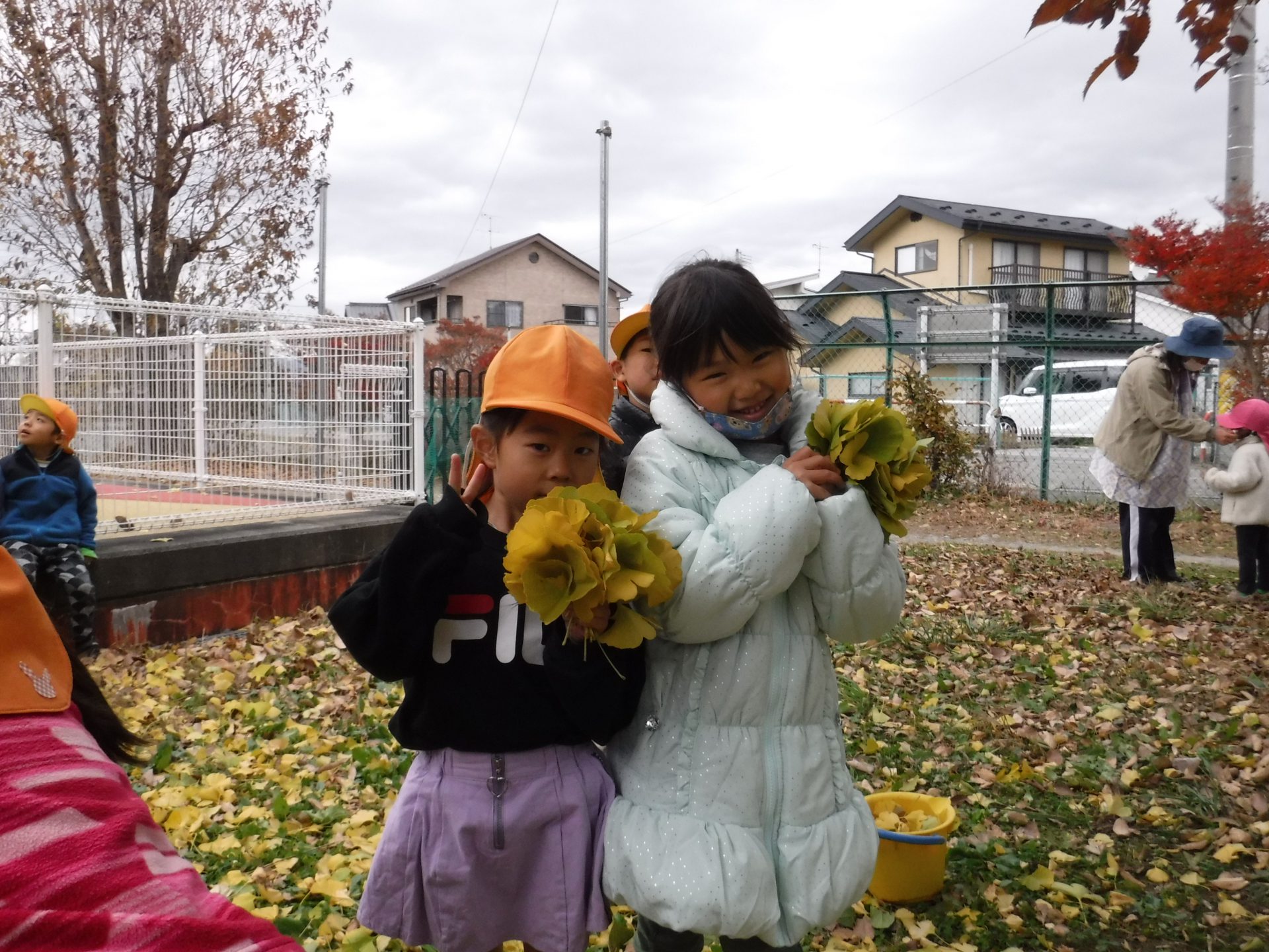 お迎えに来たお母さんが、いちょうの葉の花束を見て、「素敵に出来たね、おうちで飾ろうね」ととても喜んでくれました。子どもは嬉しそうににこっとして「うん!!」と頷き帰っていきました。いちょうの木からの贈り物は、子どもを通してお母さんへの贈り物になりました。自然からの恵みは人と人を繋げ心を豊かにしてくれます。
