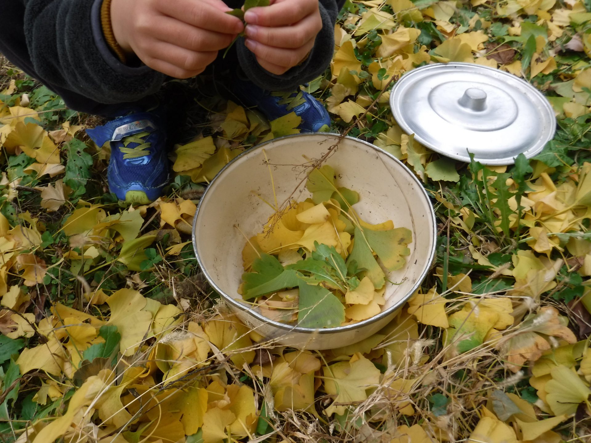 「いちょうの葉っぱの炒め物だよ、おいしくできるかなぁ。」
