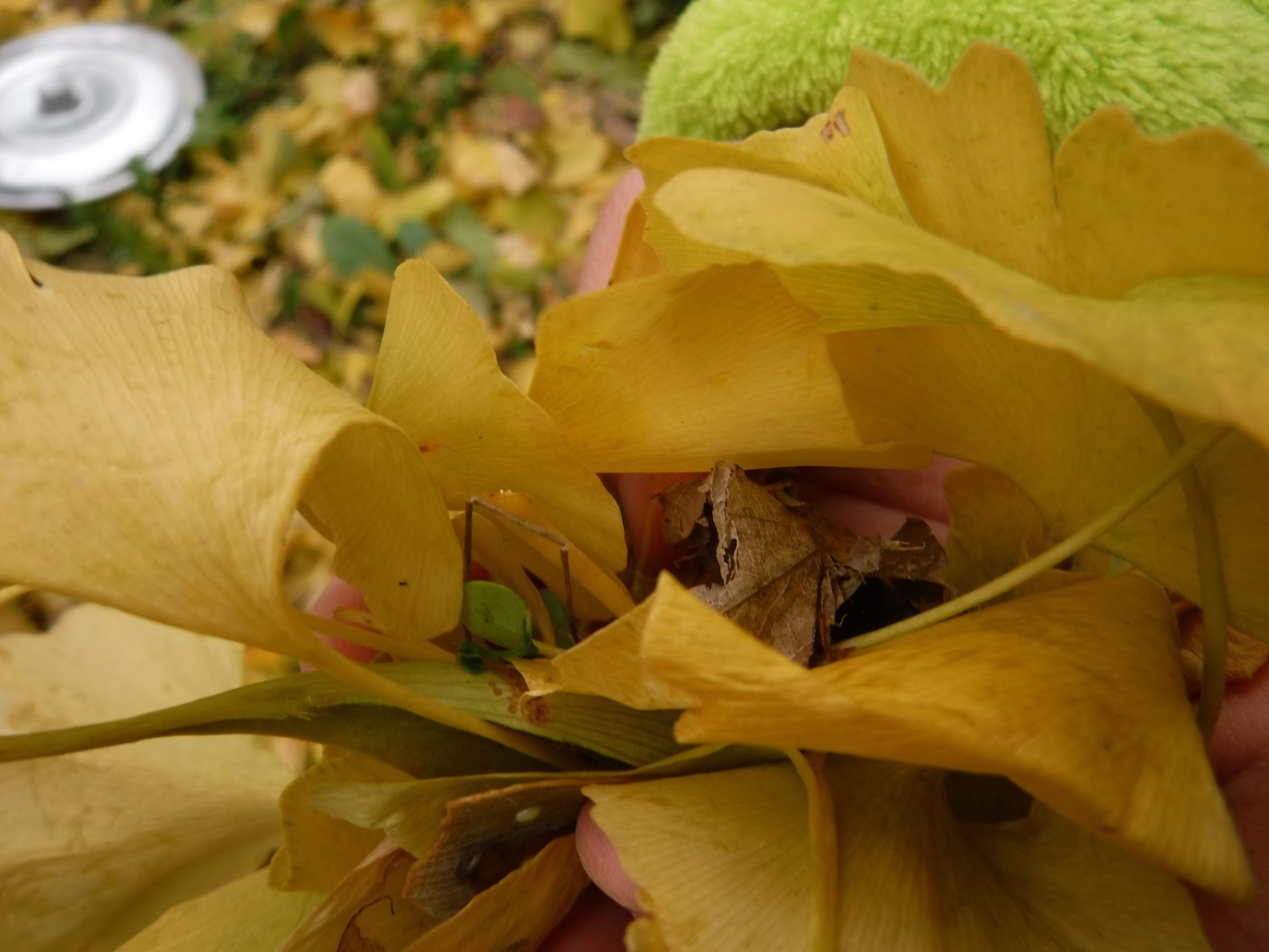 裏庭に行ってみると、いちょうの葉がたくさん落ちていました。