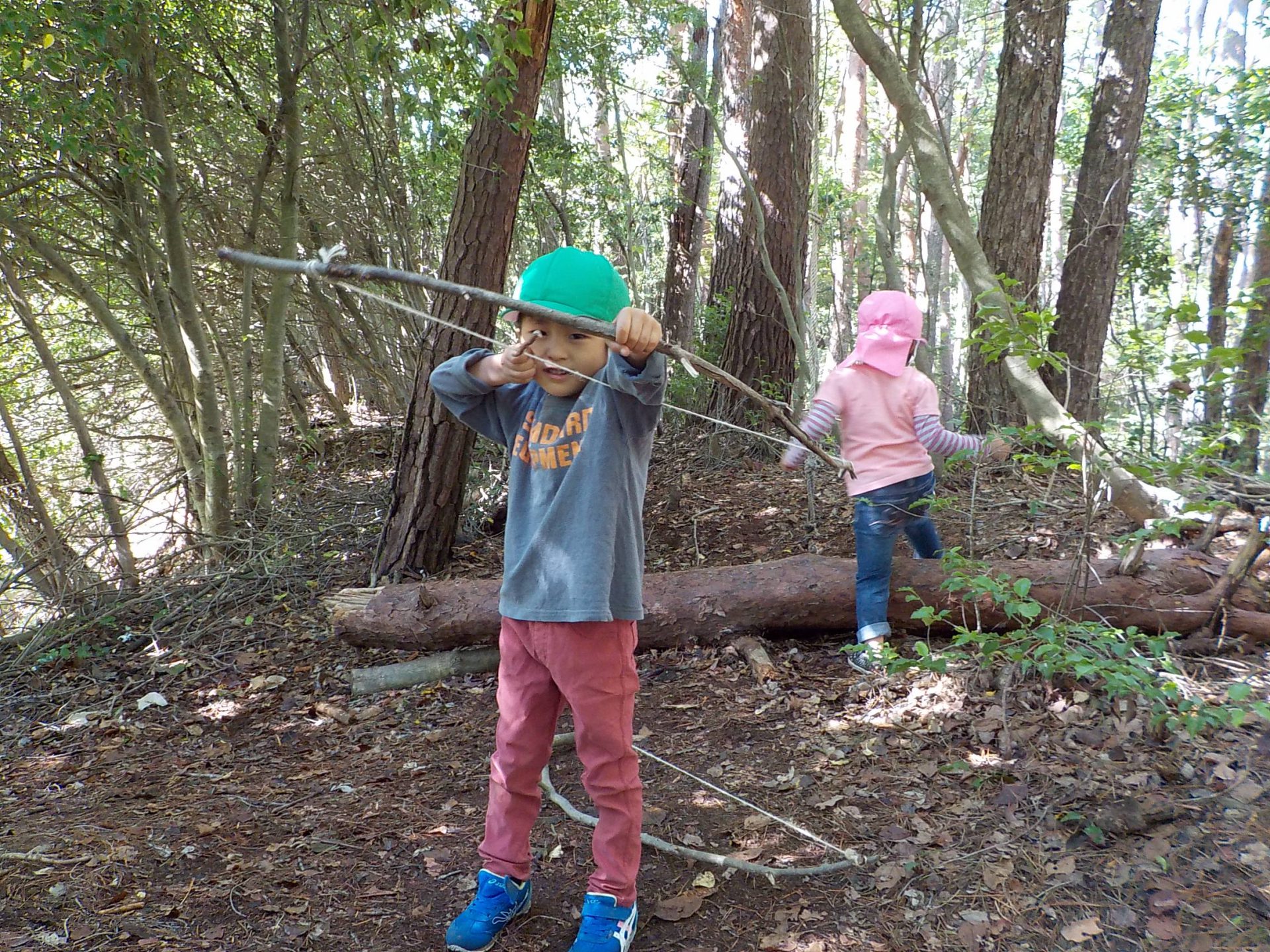 「ぞう(年長)さんの弓矢、かっこいいなぁ~。」「やってみたいね。」