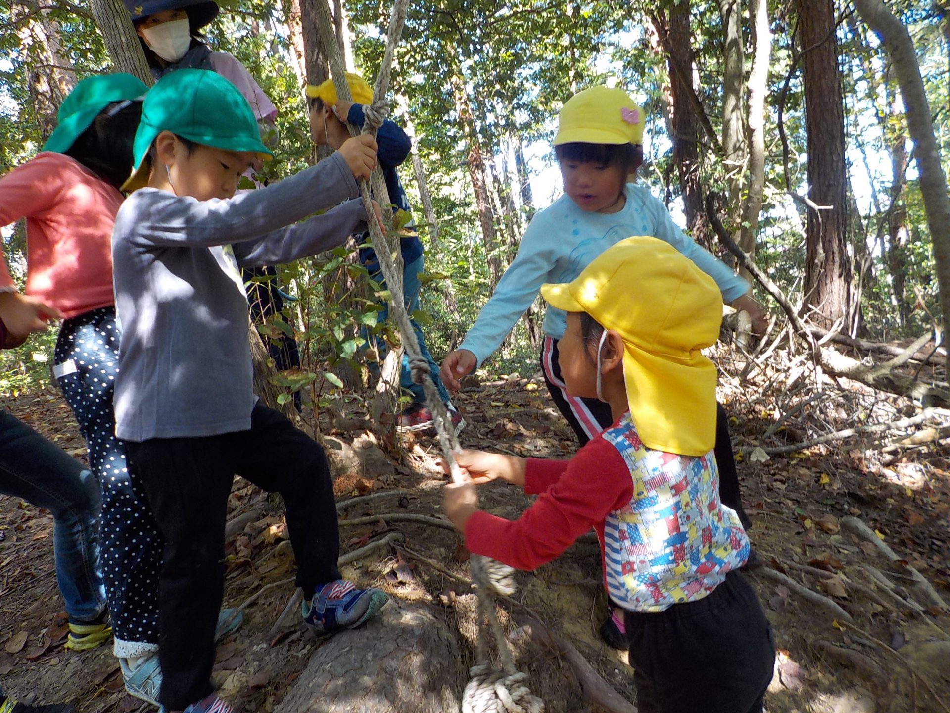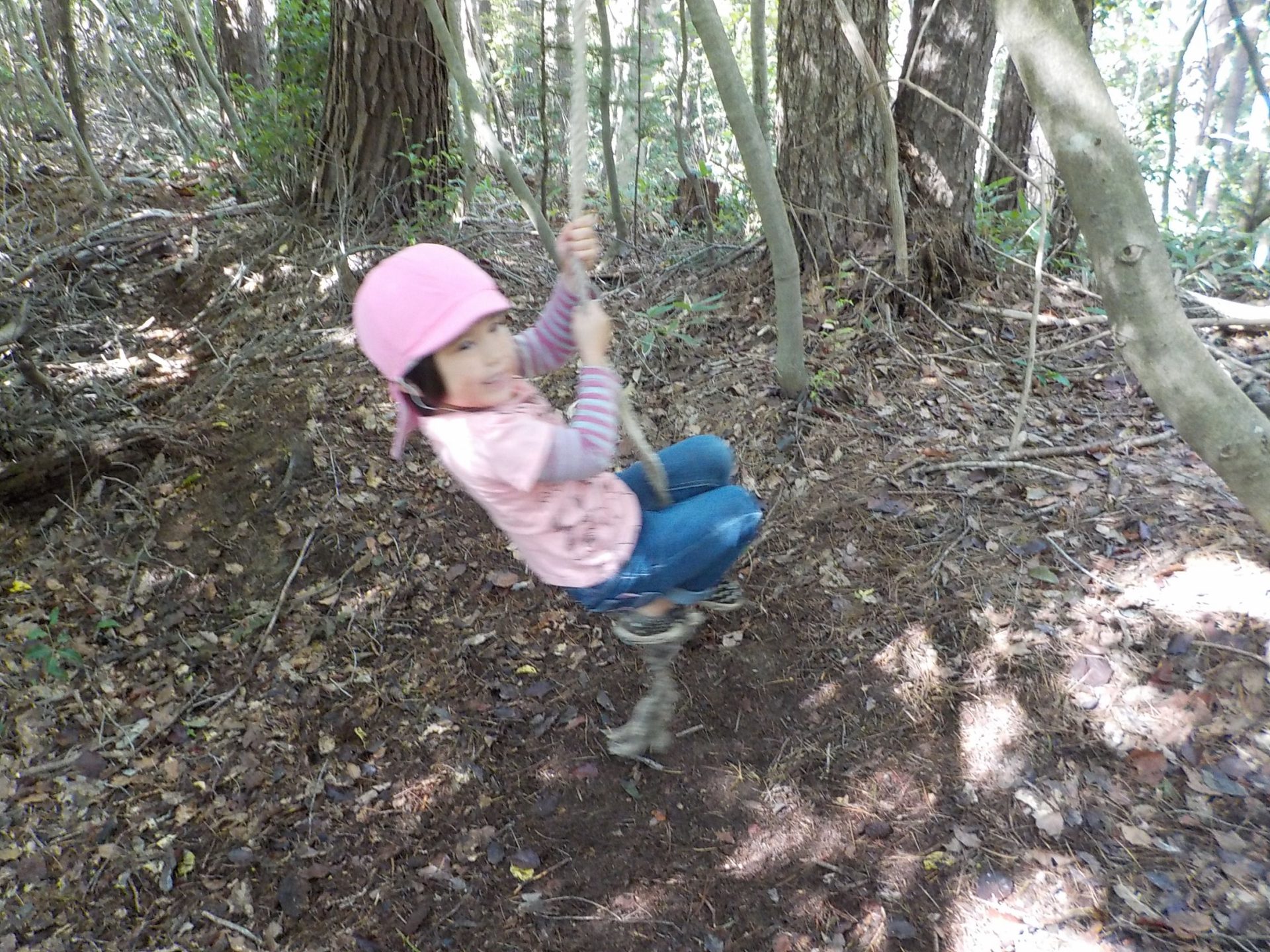 「ターザンロープも楽しいよ!」年少さんは低いターザンロープから。