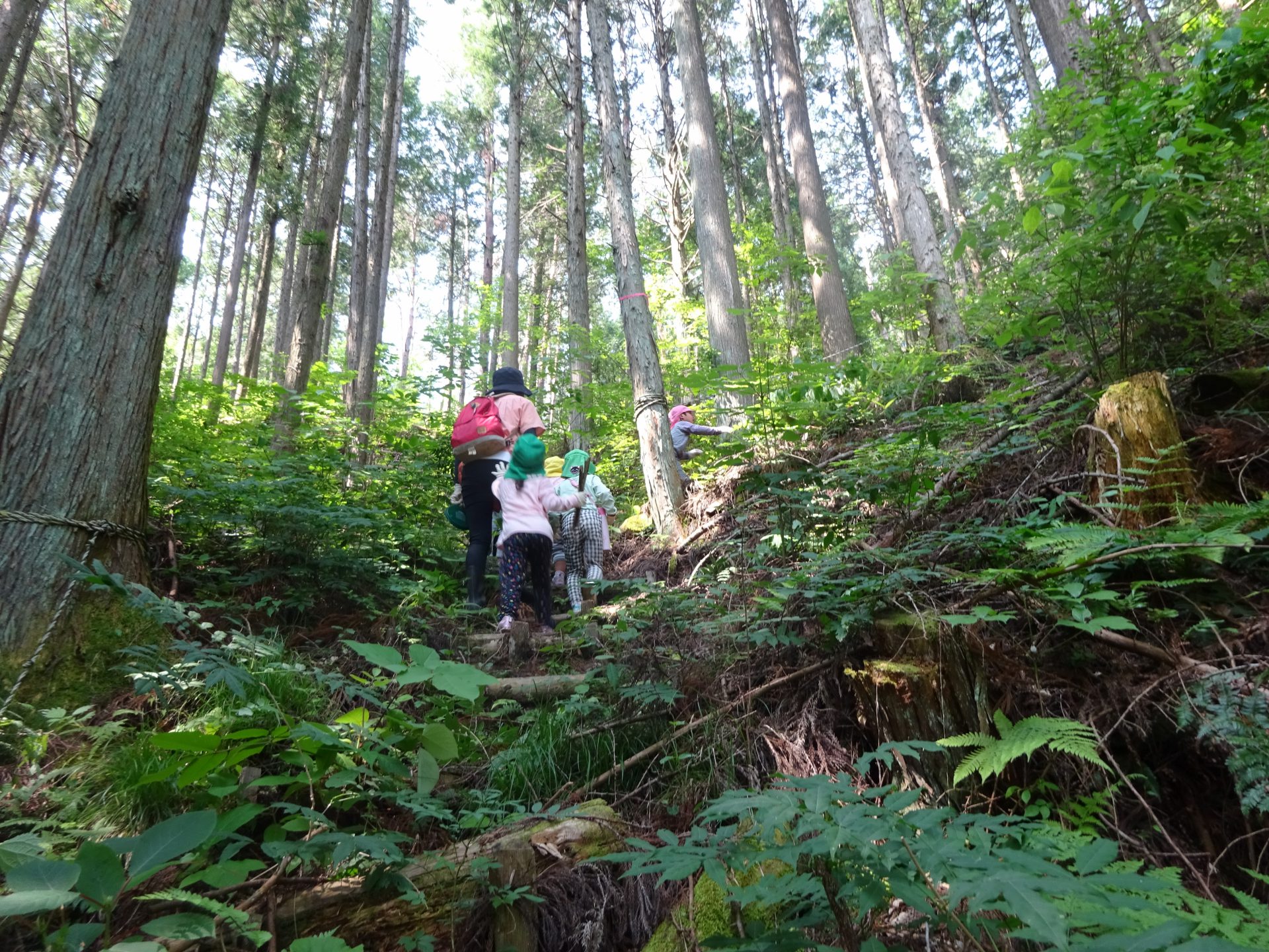 里山公園へ登る坂道、ターザンロープなど身体を使うことも多いです。