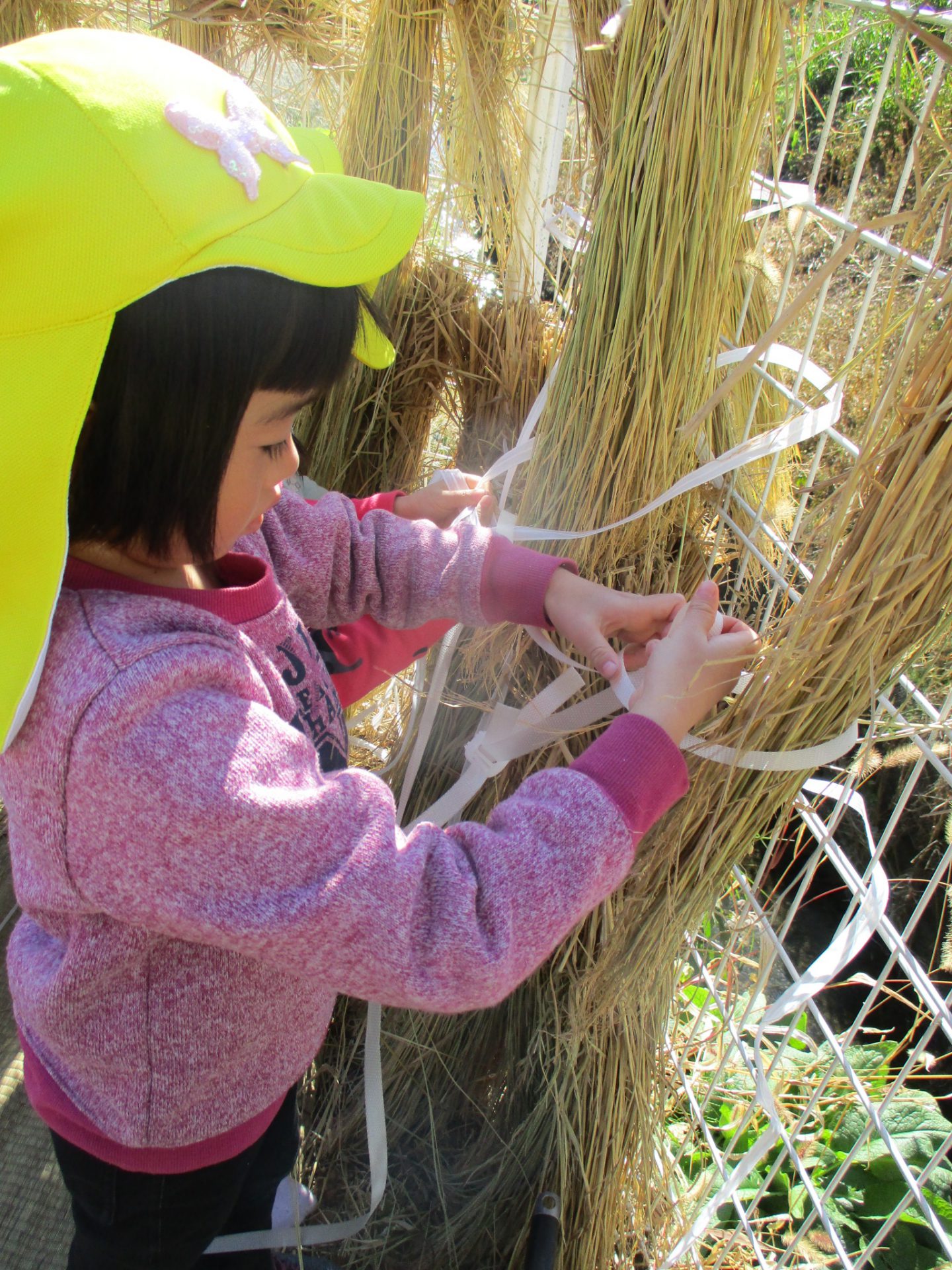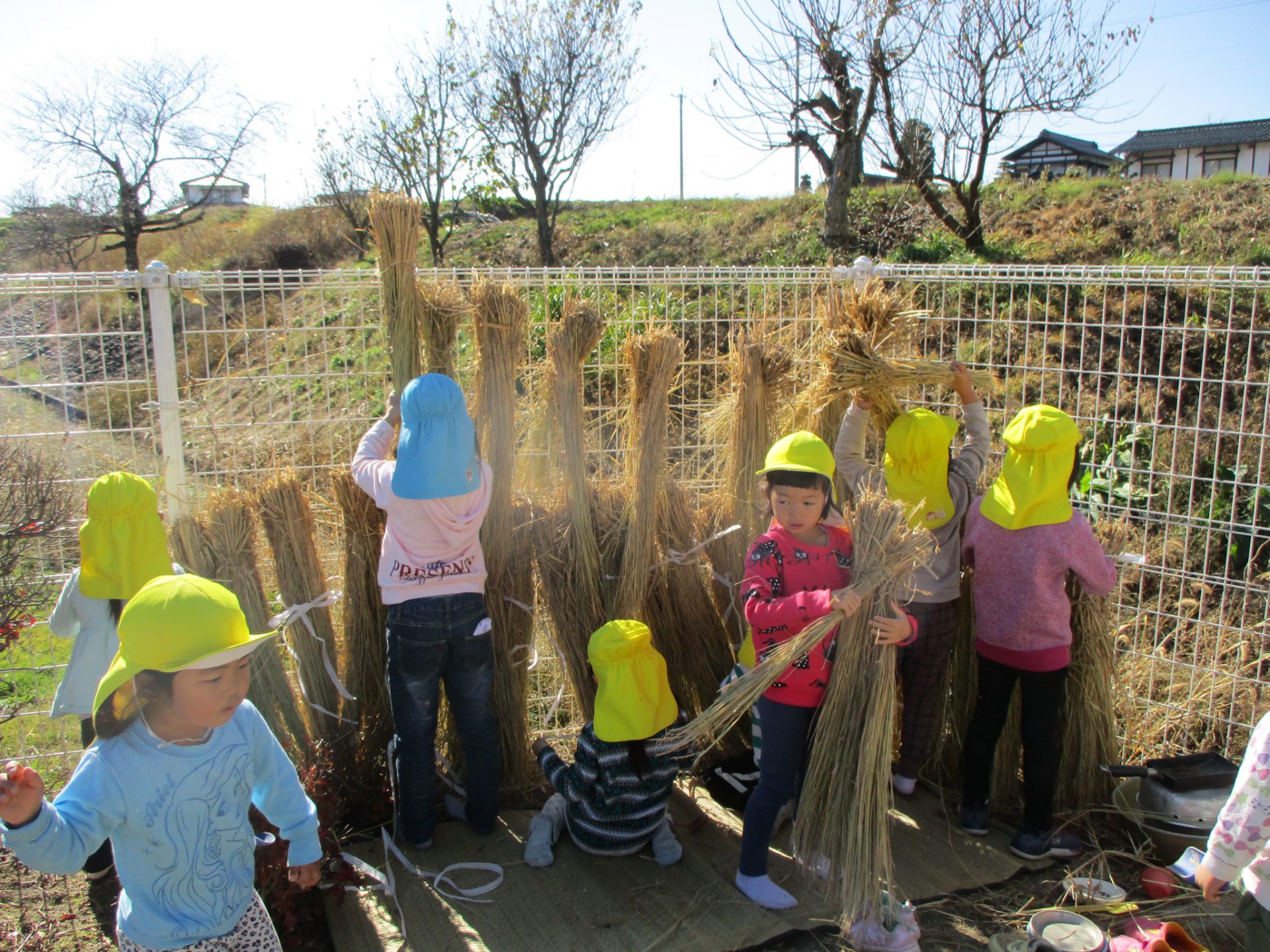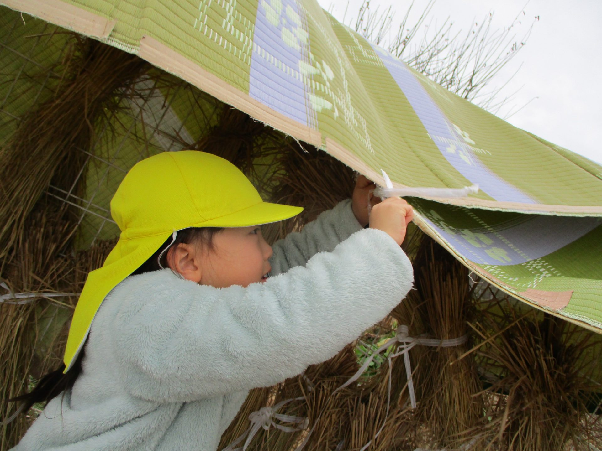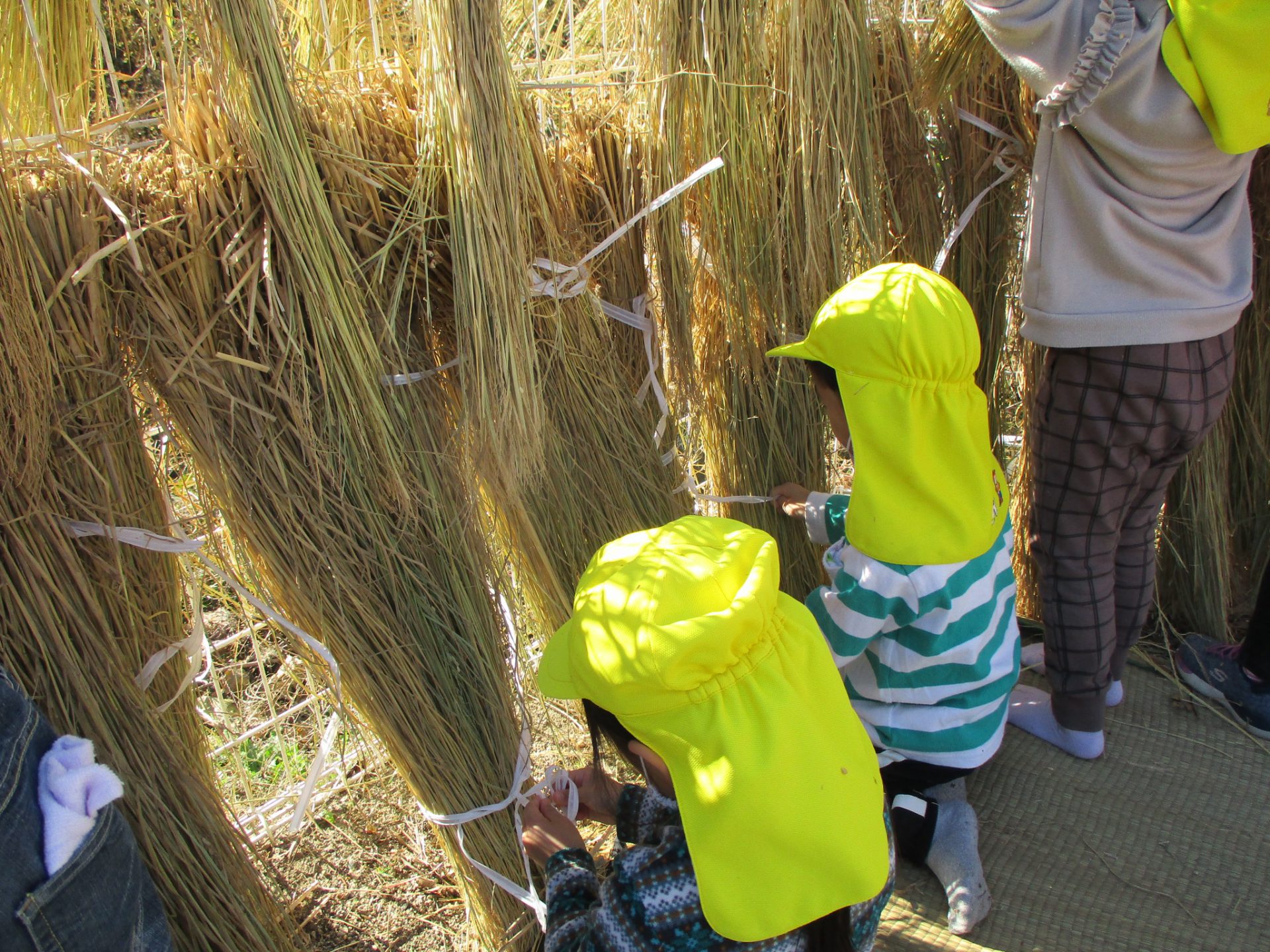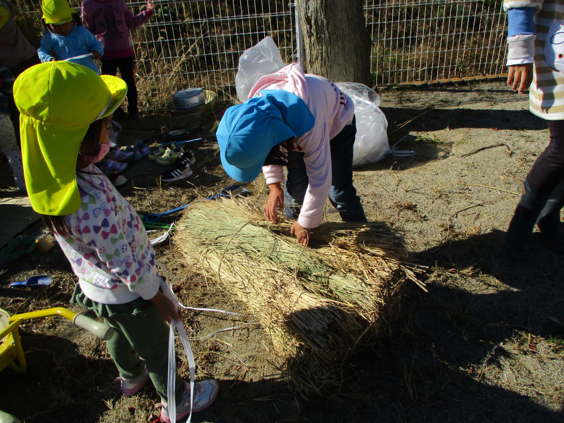 実際にたくさんのわらに触れることで、わらの優しい匂い、ほかほかの暖かさ、ふかふかの肌触りを存分に感じながら楽しく作っていました。