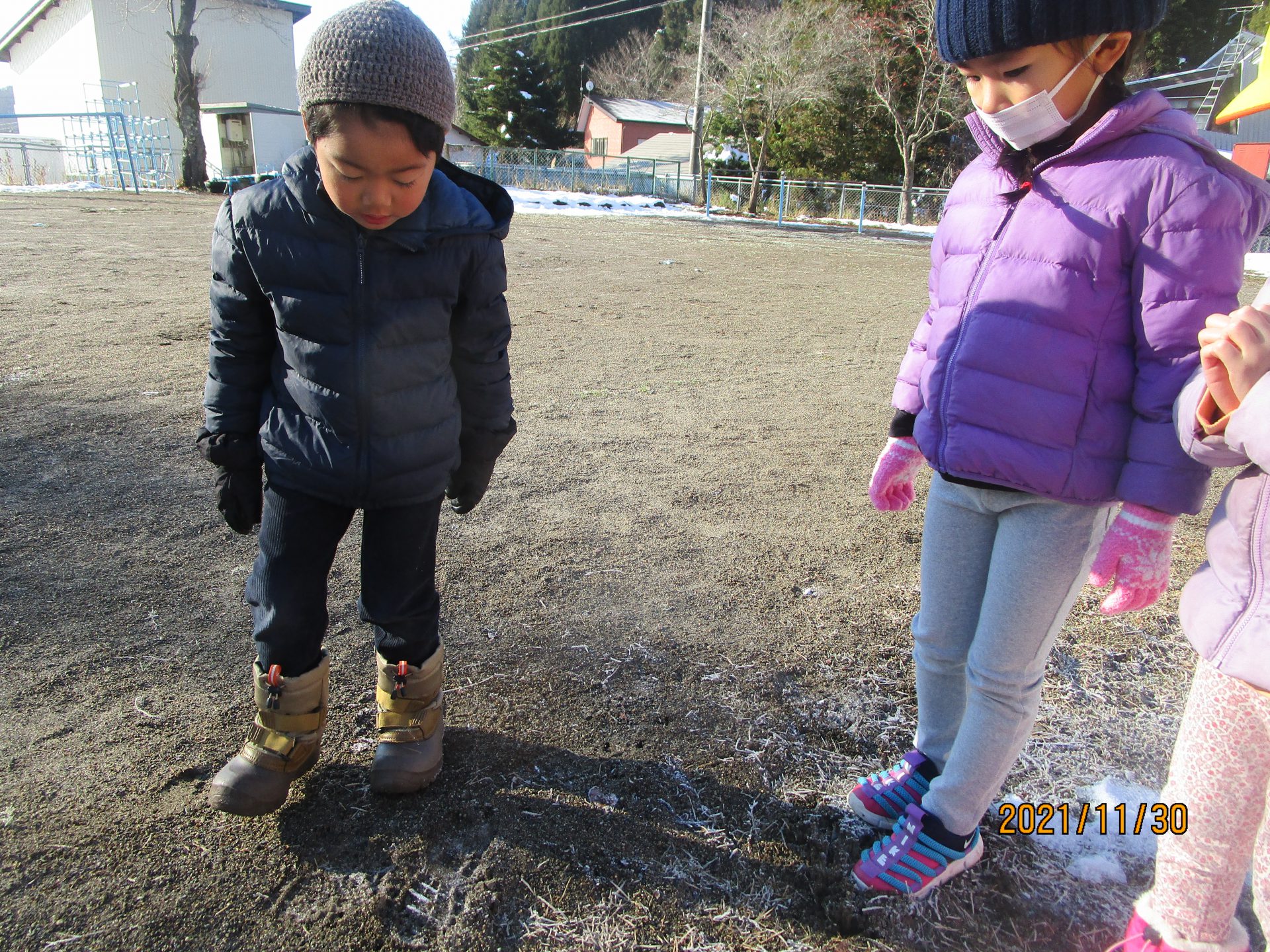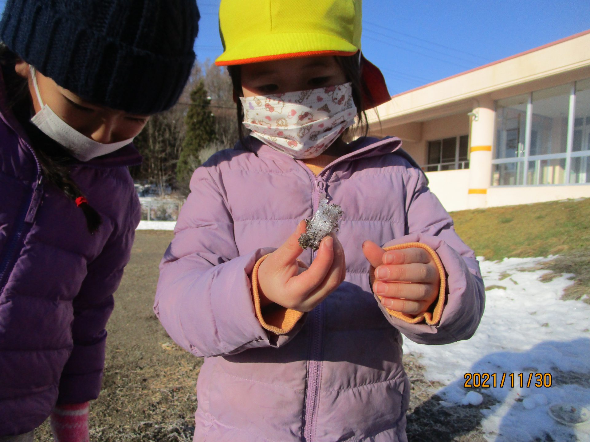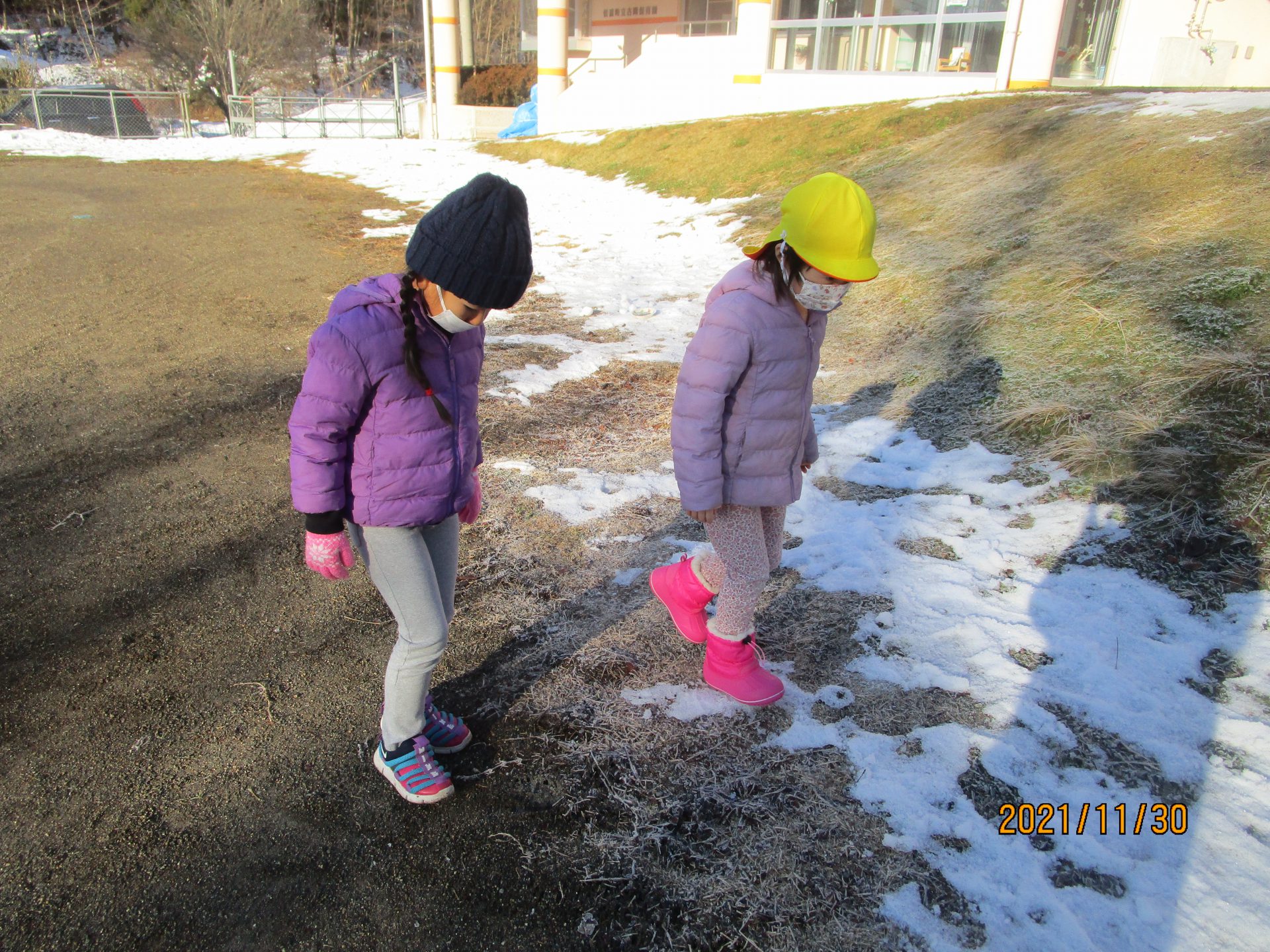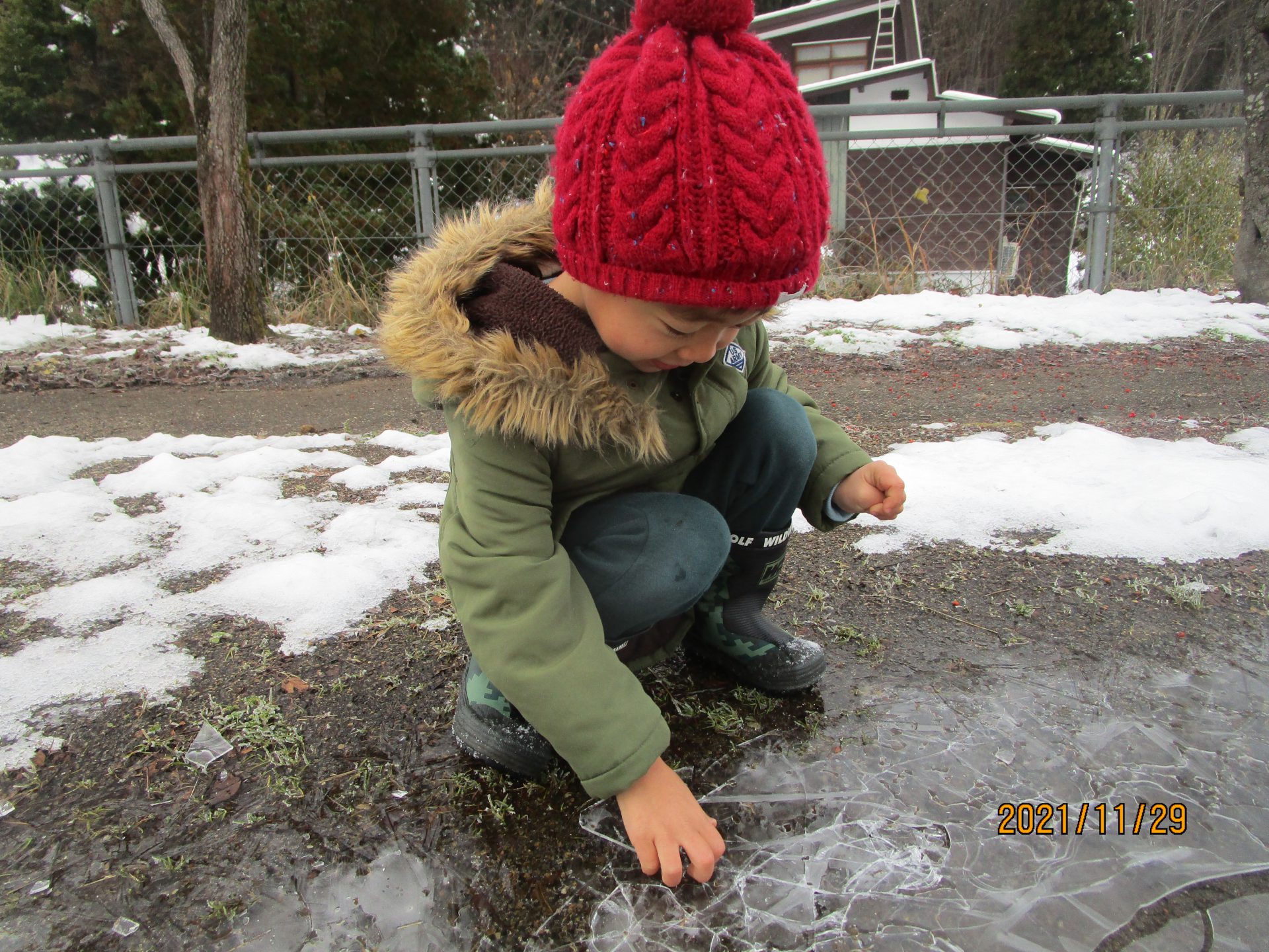 いよいよ信濃町にも冬がやってきました。今年の初雪を、みて、触れて、遊んだ子どもたち。こころが動かされた瞬間がいくつもありました。これから冬も本番となってきます。園庭中が真っ白になるほど雪が降るのを今か今かと待ちわびている子どもたちです。手洗い・うがいなどの風邪予防も忘れずに、今年の冬も元気いっぱい雪あそびを満喫していこうと思います。