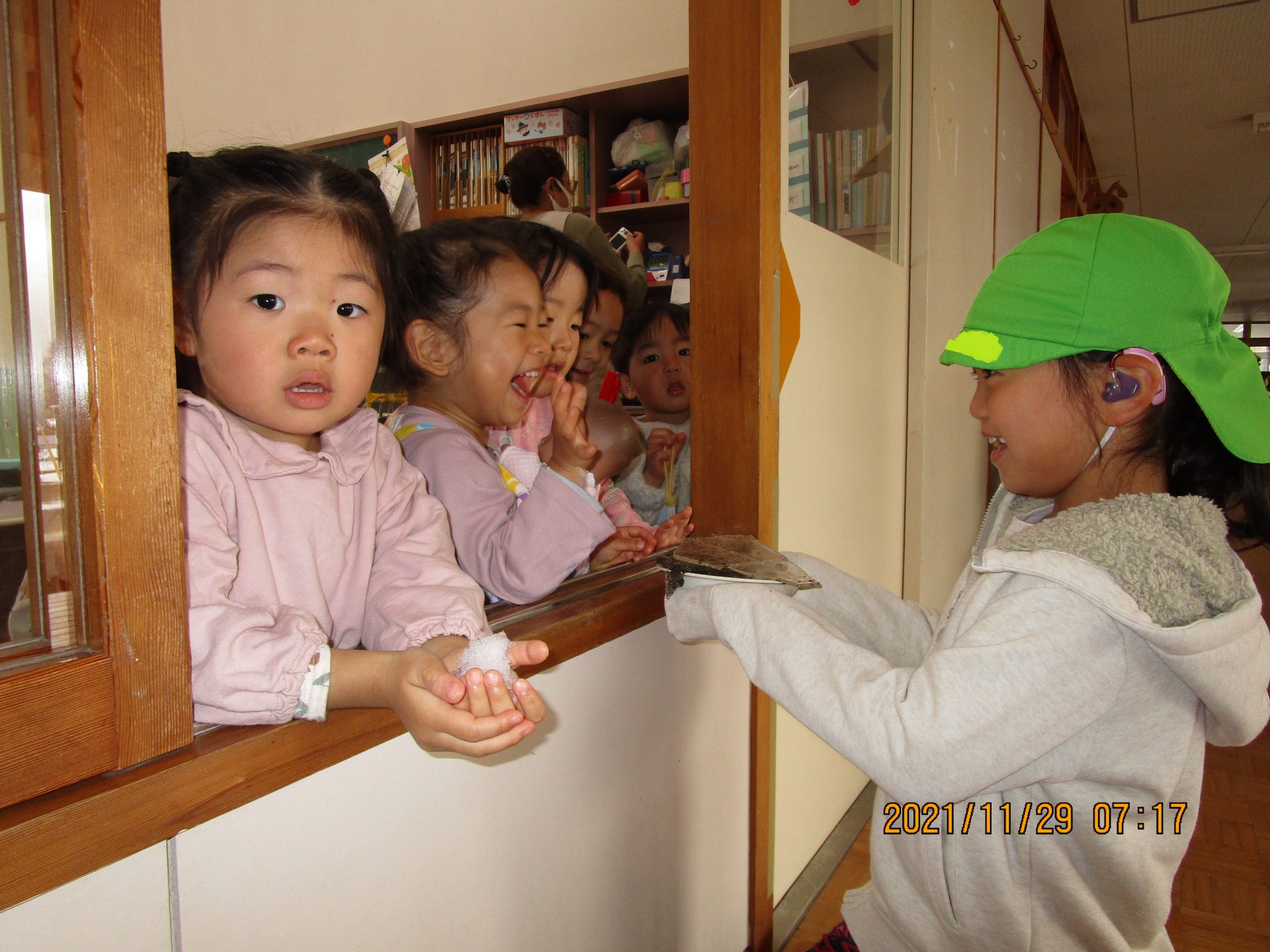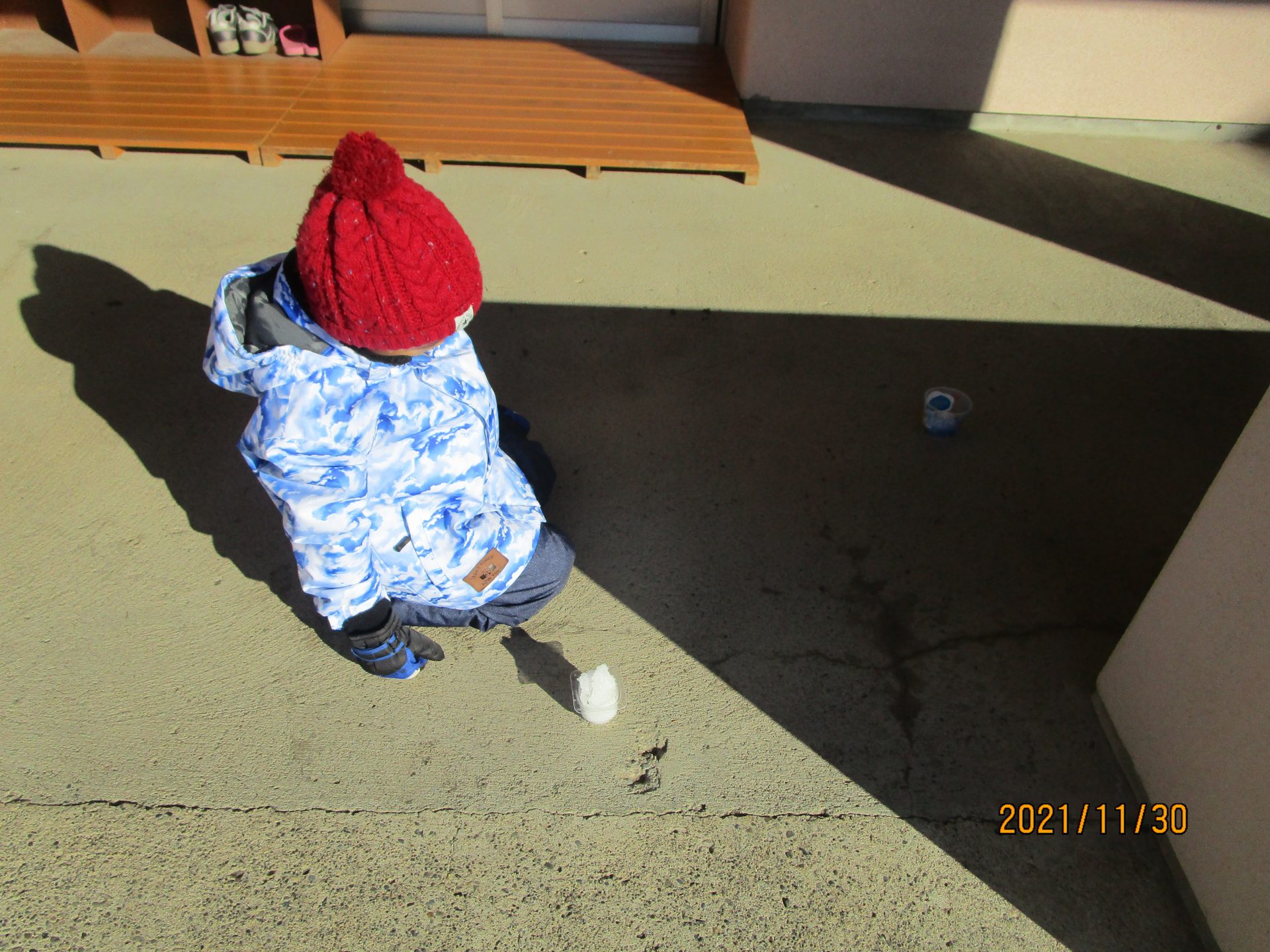 お部屋にいた未満児さんにも冬のおすそわけ。「つめた〜い」とニコニコ嬉しそう!