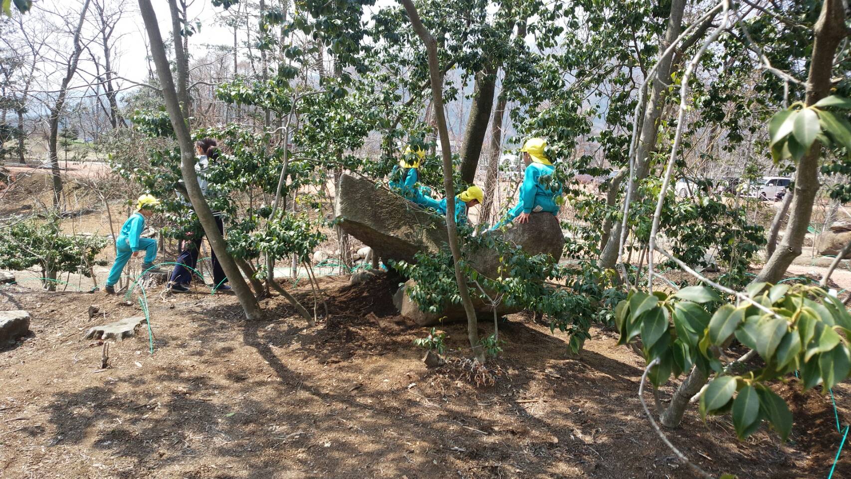 樹齢200年ほどの常緑樹(1㎝のびるのに1年かかる)で囲まれ、太陽の昇る方向を指して座している2つの石。この場所を子どもたちが遊べるように整備しました。
