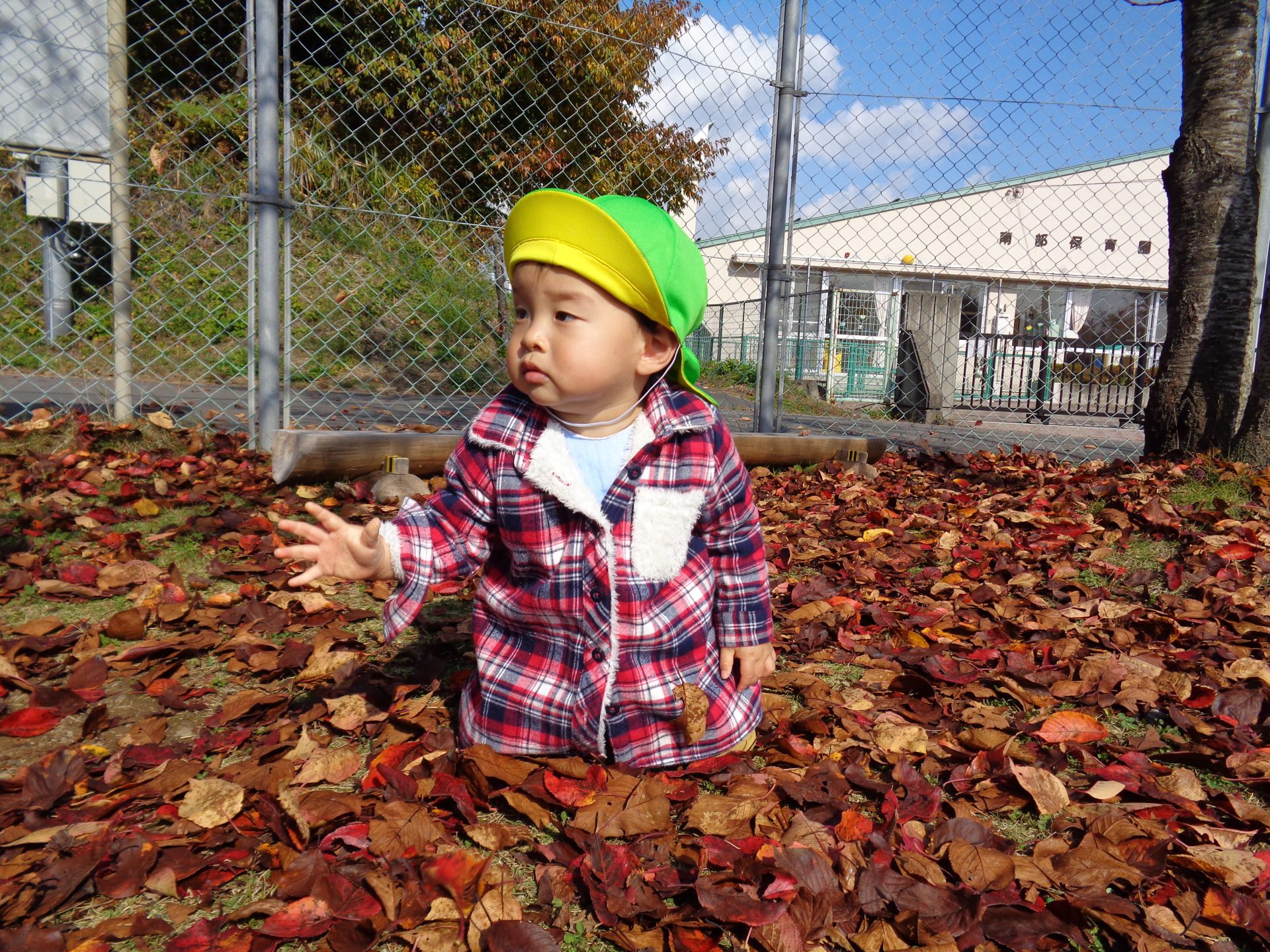 「これはなんだろう?」と不思議そうに見つめたり、葉っぱの山に埋まったり、